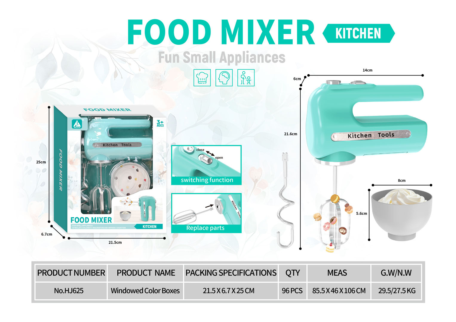 Hračka mixér a příslušenství pro děti od tří let. Mixér byl vyroben z nejkvalitnějších materiálů v živých barvách. Nejenže vypadá jako skutečný, ale také ho dokonale napodobuje. Má vyměnitelné metly, které se po zapnutí mixéru skutečně otáčejí. Navíc v sadě můžeme najít mističku s atrapou krému. Hračka je napájena bateriemi typu 2 x AA 1,5V (nejsou součástí balení).