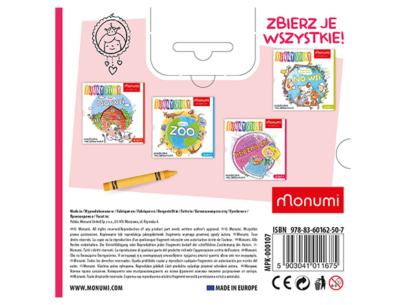 MONUMI je polská značka vytvořená týmem lidí, pro které je práce vášní a dětské štěstí hlavní odměnou za kreativní tvorbu hraček, které baví a učí. Pečlivý výběr skupiny odborníků, kteří materiály vyvíjejí, a to jak z obsahového, tak z uměleckého hlediska, směřuje k tomu, aby naše výrobky účinně ovlivňovaly duševní rozvoj dětí. MONUMI vytváří jedinečné papírové kreativní sady a omalovánky pro různé skupiny čtenářů s ohledem na jejich estetické a intelektuální potřeby.