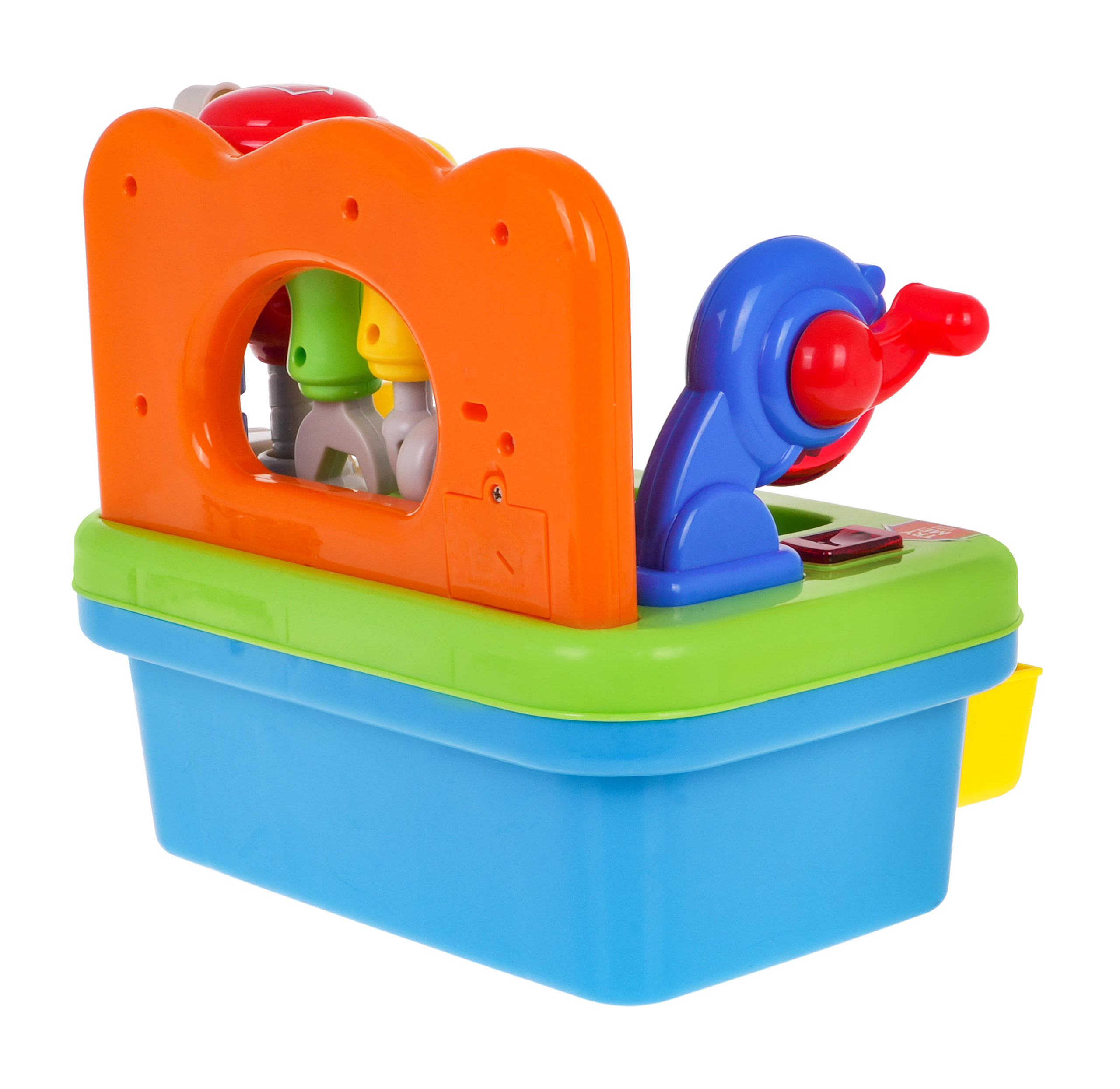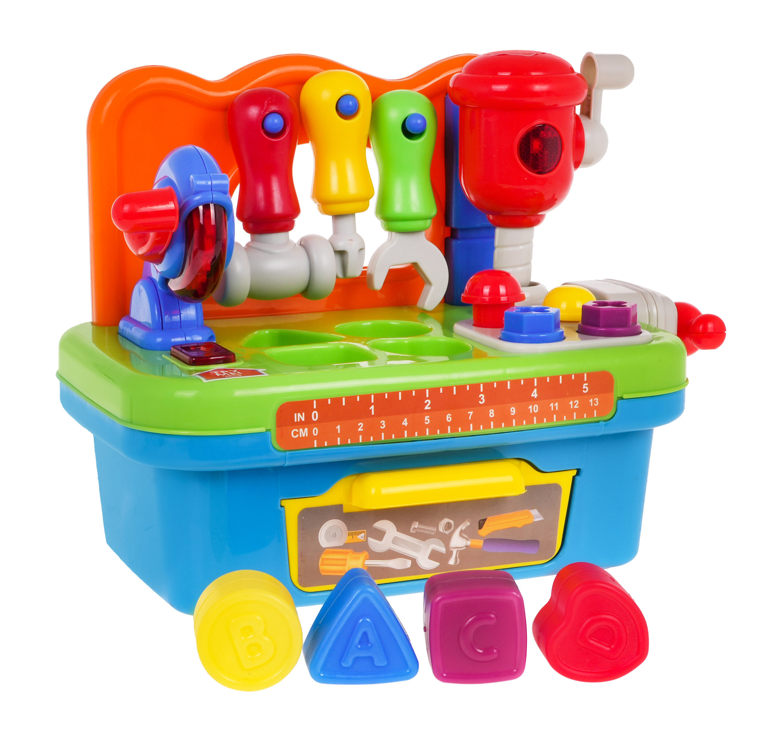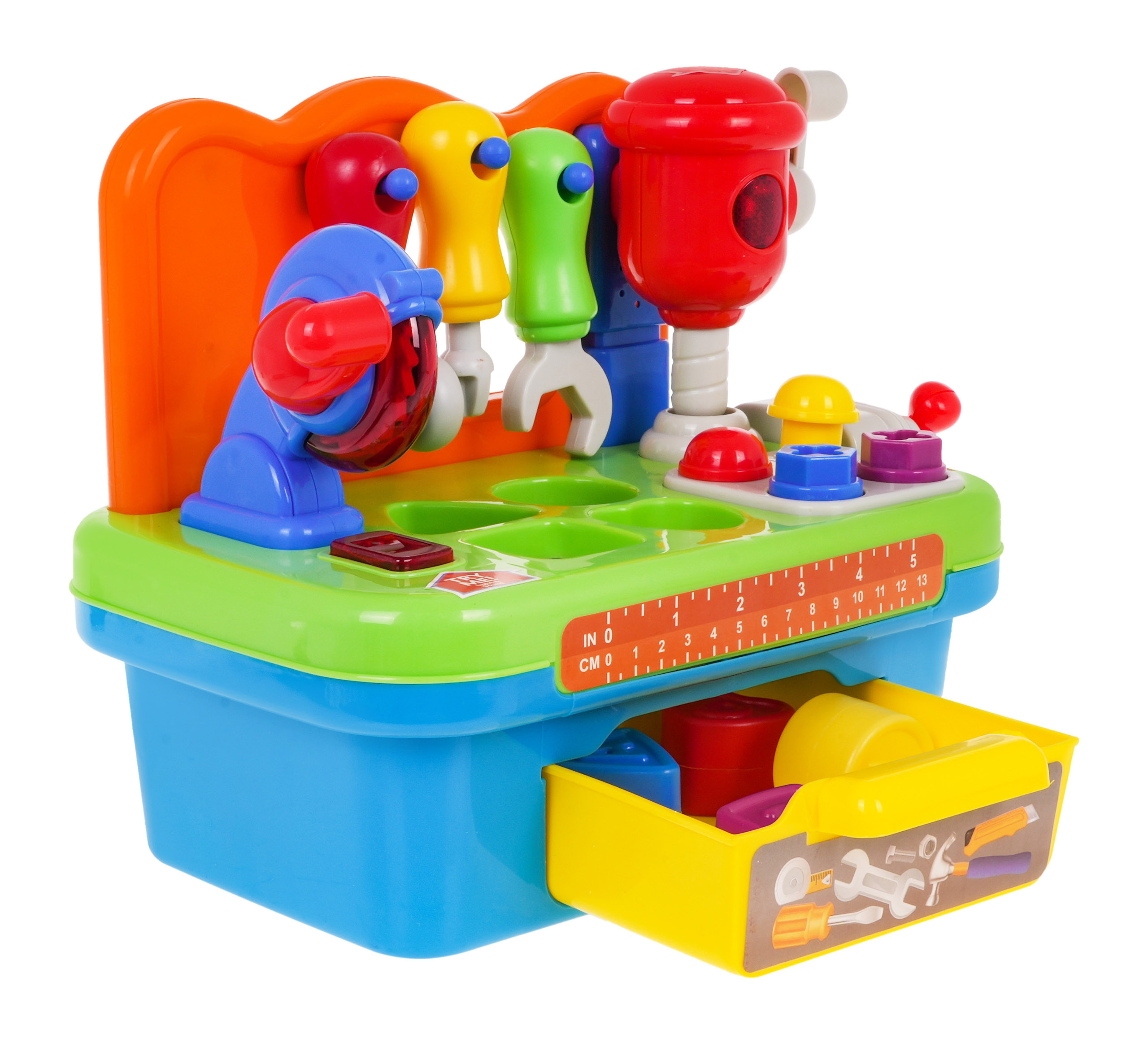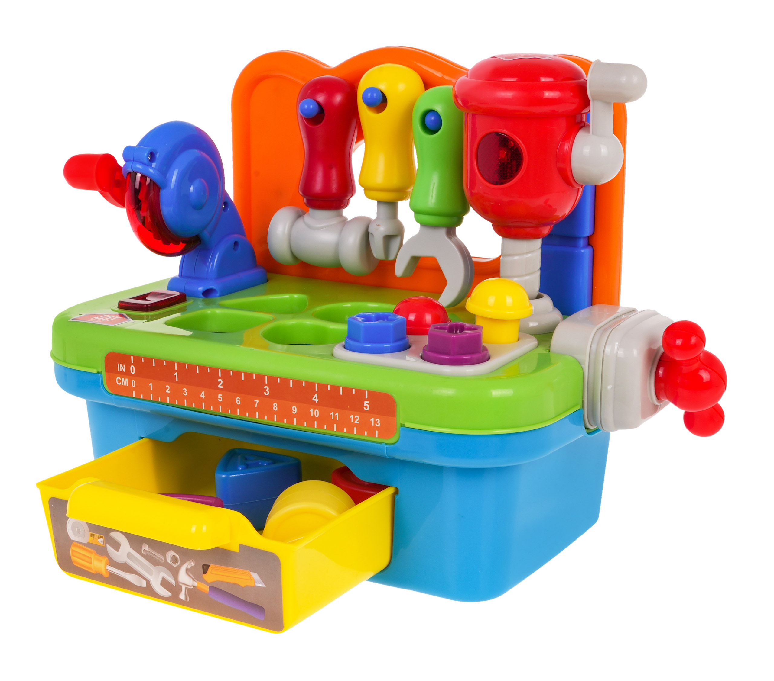 Multifunkční interaktivní hračka se zvukovou a světelnou funkcí je vhodná pro děti od 24 měsíců. Dílna pro kutily je vybavena řadou funkcí. K dispozici je rotační kotoučová pila a rázové kladivo. Každé nářadí je vybaveno praktickou rukojetí, s níž se spouští. Na desce pracovního stolu je připevněn svěrák, který umožní našemu malému dítěti naučit se reflexy při šroubování a odšroubování, doprovázené chrastivými zvuky. Součástí dílny budou hřebíky na zatloukání a šrouby na šroubování. K dalšímu vybavení patří nářadí: šroubovák, klíč a kladivo, vše v rozměrech dokonale vyhovujících malým dětským rukám. Dílna je také skvělým místem k procvičování rozpoznávání tvarů a přiřazování. Deska pracovního stolu je vybavena třídičem, který je vynikající pro rozvoj dětských dovedností. Všechny dílky, které zapadají do příslušných otvorů, najdete v praktické zásuvce ve spodní části hračky. Dílna je napájena 3 bateriemi AG13, které jsou součástí dodávky.