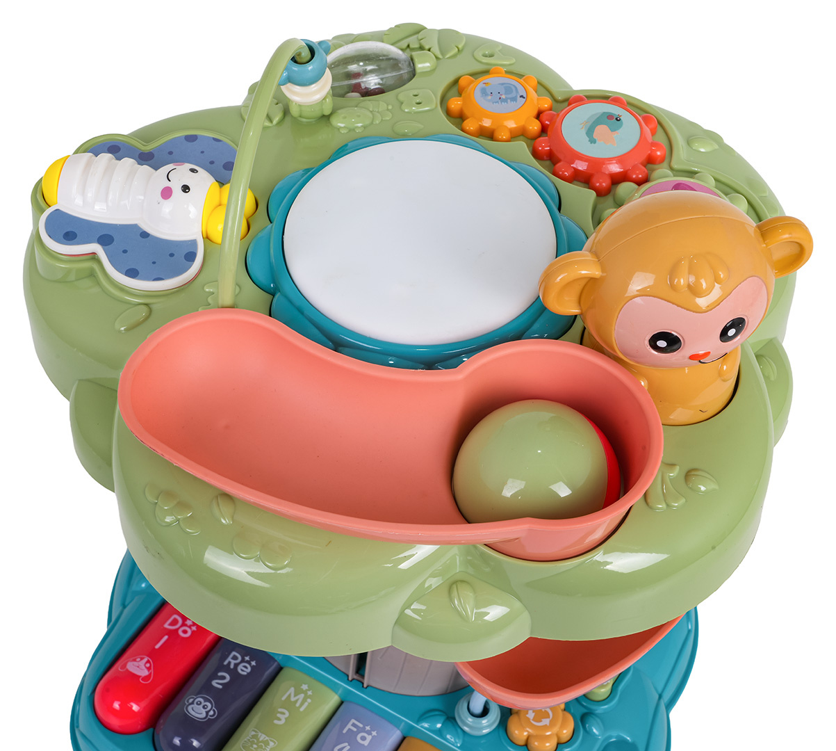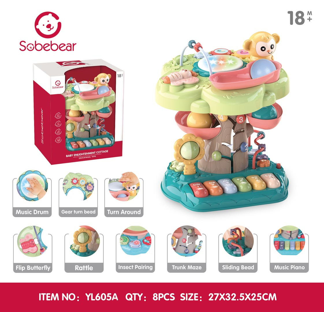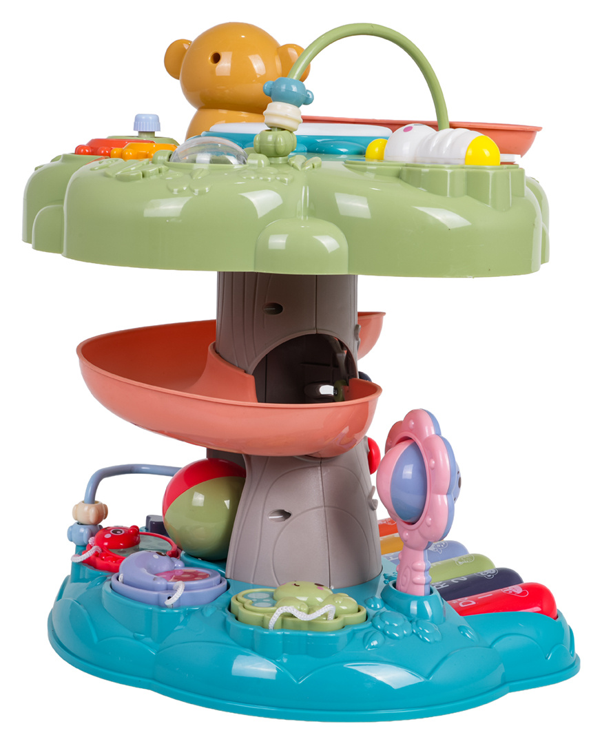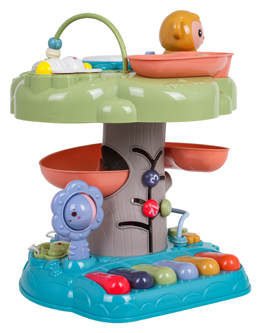 Interaktivní, multifunkční stromeček s funkcí zvuku a světla a manipulačními prvky pro děti od osmnácti měsíců. Sada je vyrobena z nejkvalitnějšího plastu a nemá ostré hrany. Živé barvy, zvukové a světelné prvky stimulují smysly dítěte na mnoha úrovních. Na vrcholu stromečku se nachází hudební bubínek s podsvícením, korálková překládanka, opička, včelka a skluzavka pro míčky. Vhozený míček se kutálí skluzavkou až dolů. Na pařezu stromu a vedle něj se nacházejí skládačky. Na samém spodku máme barevné hudební piánko, tlačítko pro změnu režimů piánka, tlačítko s bubnem, chrastítko a zvířátka na šňůrce k přizpůsobení. Hračka je napájena bateriemi typu 3 x AA 1,5V (nejsou součástí balení).