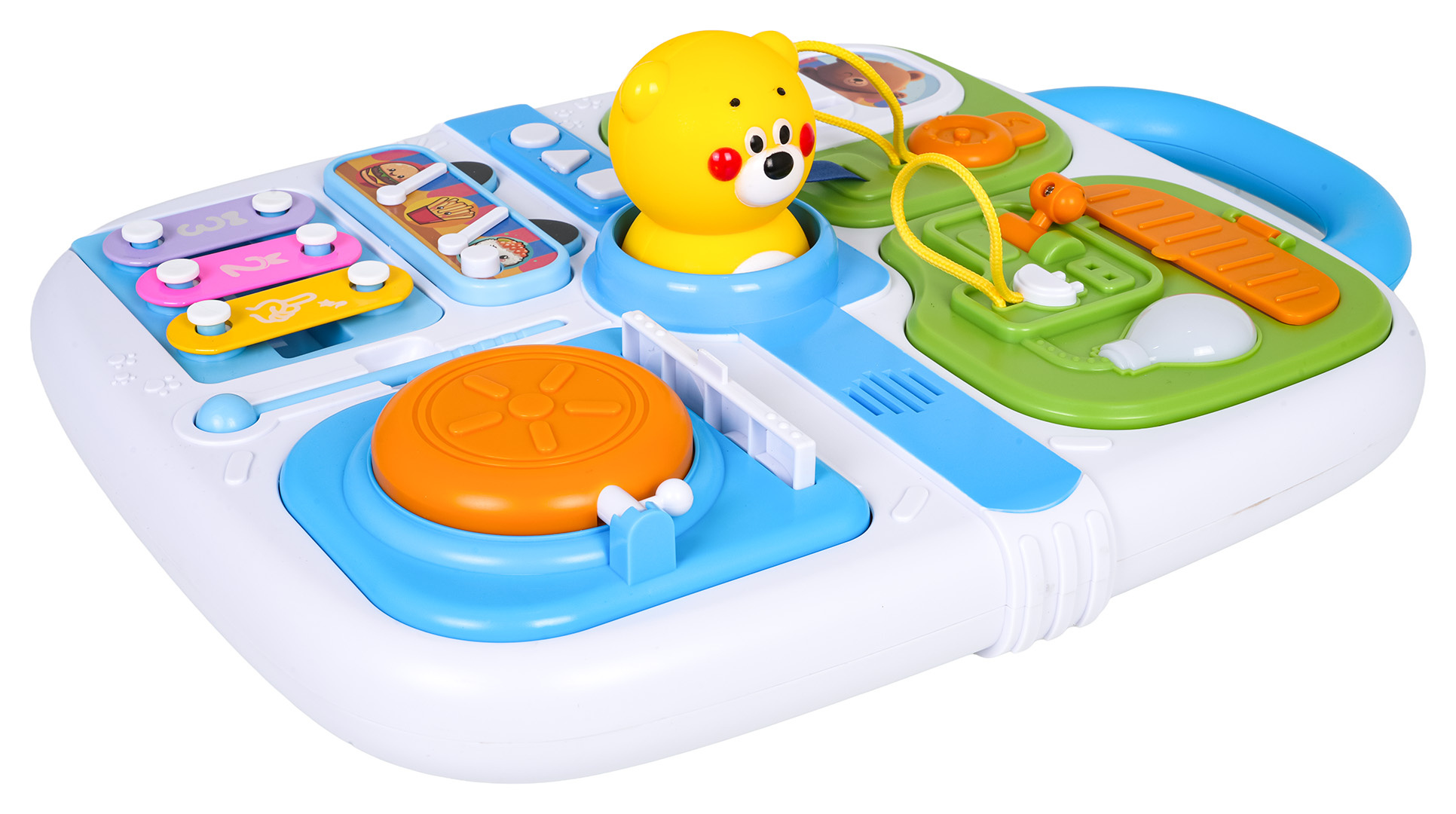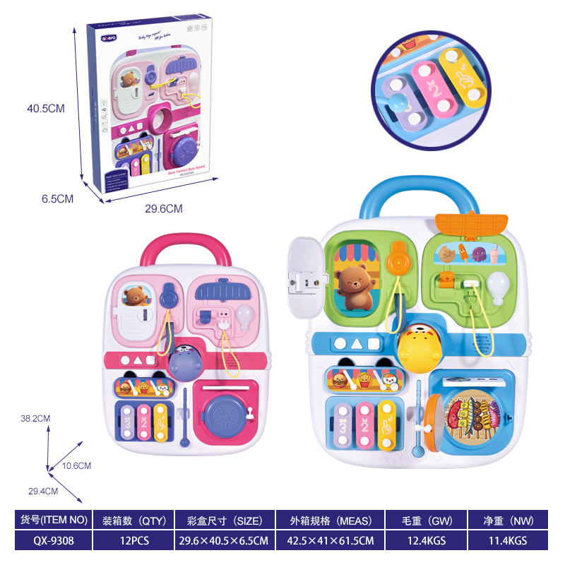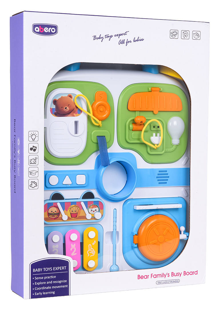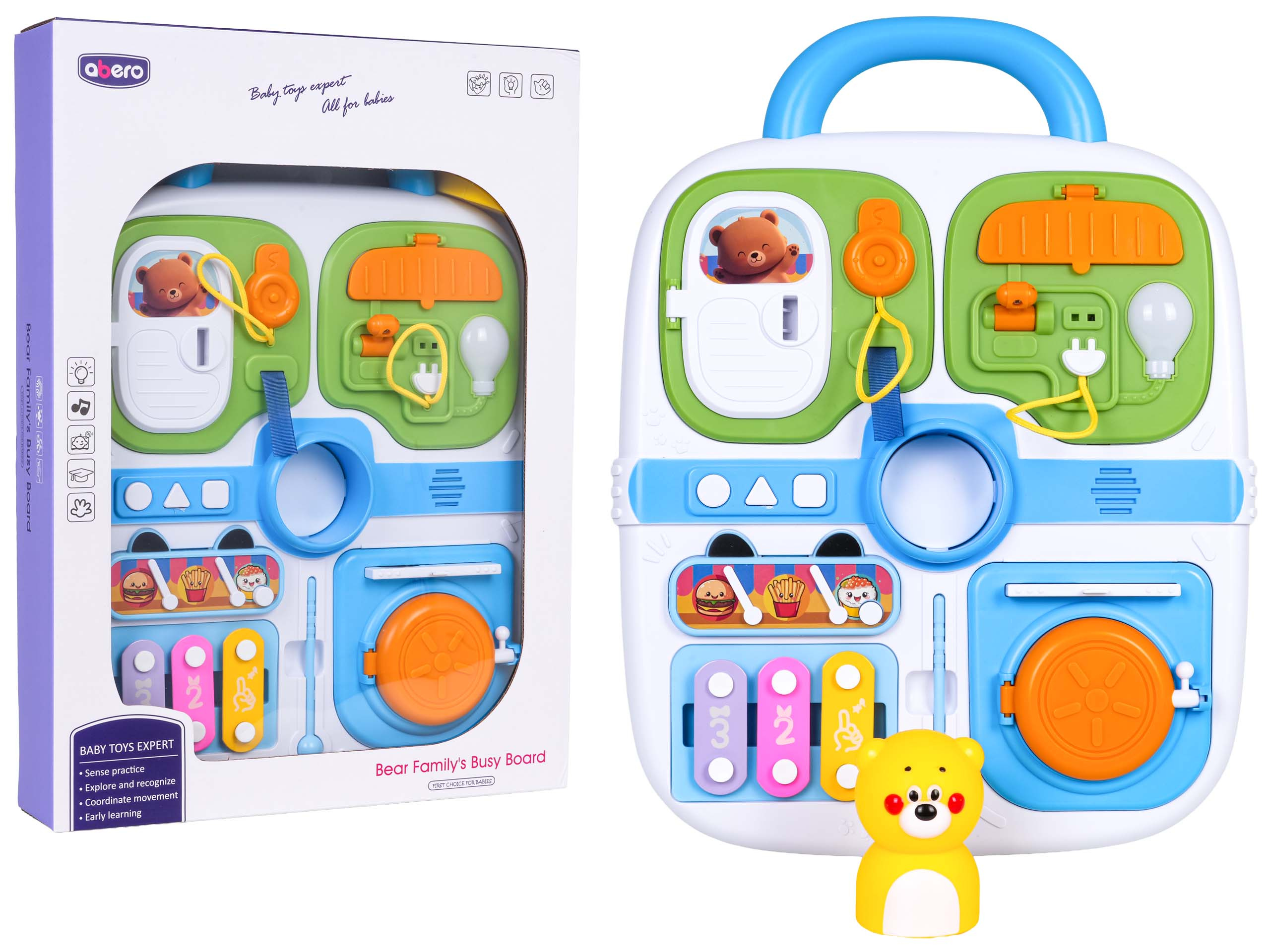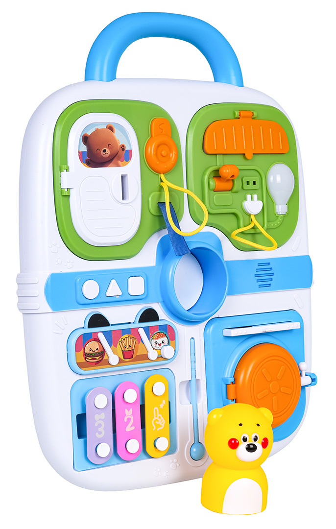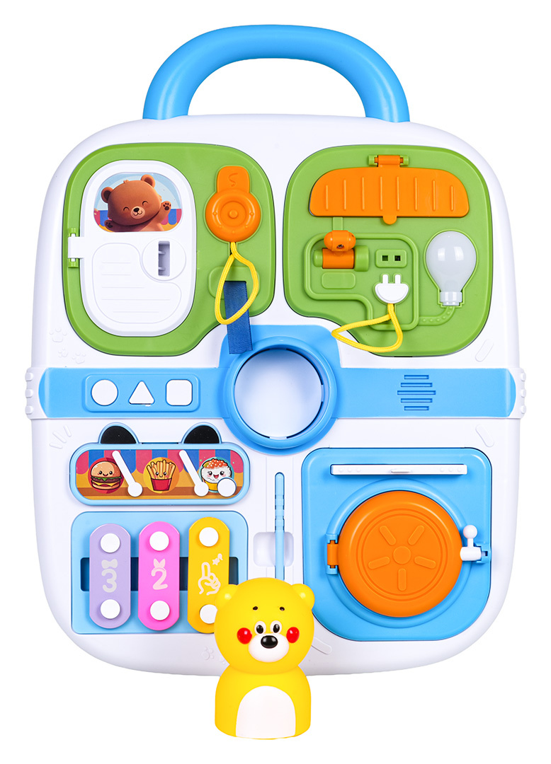 Multifunkční manipulační kufřík pro malé děti od osmnácti měsíců věku. Hračka je vyrobena z nejkvalitnějších materiálů bezpečných pro děti v živých barvách. Kufr je vybaven manipulačními prvky, které cvičí pohybovou koordinaci a podporují logické myšlení. Na horní straně kufříku se nachází rukojeť pro přenášení a na přední straně prvky pro otevírání, posouvání, stisknutí a mini činely s paličkou.