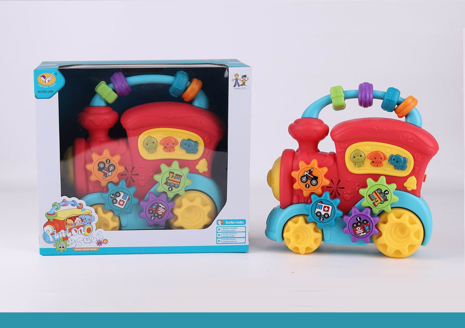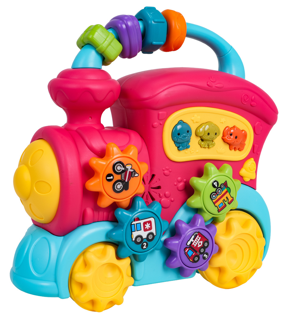 Interaktivní hračka, vlak s funkcí zvuku a světla pro děti od dvanáctého měsíce života. Hračka je vyrobena z nejkvalitnějšího plastu v živých barvách. Je bezpečná pro miminko, nemá ostré hrany. Hračka nabízí mnoho atrakcí a stimuluje dítě na různých úrovních. Na zadní straně vlaku se nachází dvoustupňová regulace hlasitosti, na střeše je posuvná hračka se smyslovými korálky, na boční straně vlaku jsou ozubená kolečka s obrázky vozidel a tlačítka se zvířátky. Při posouvání vlaku po podlaze se spustí mechanismus ozubených kol umístěných na hračce, která se otáčejí a vydávají chrastivý zvuk. Po stisknutí ozubeného kola uslyšíme zvuk noty. Tlačítka se zvířátky spouštějí zvuky kachny, psa nebo slona, a také různé zvonky či melodie, v závislosti na nastaveném režimu (tlačítko se zvonečkem). Hračka vláček má podsvícený reflektor a je napájena bateriemi typu 3 x AA 1,5V (baterie nejsou součástí balení).