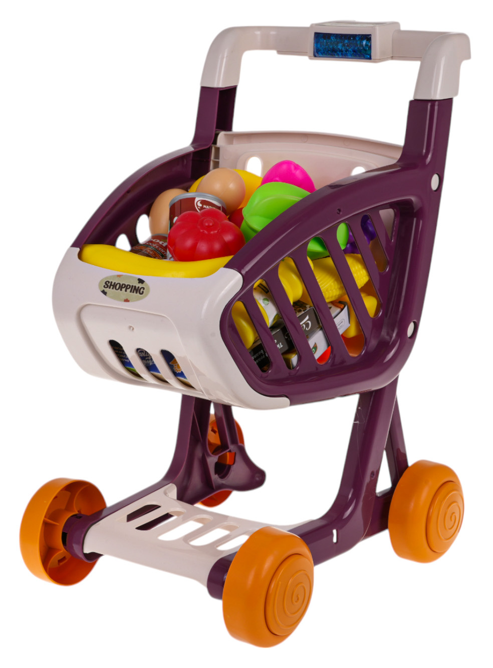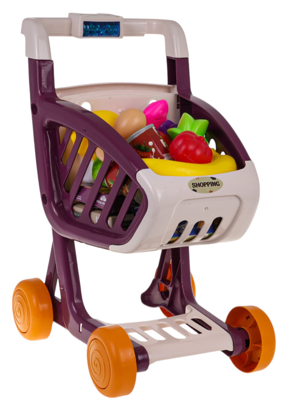Otočná kolečka usnadňují manévrování a rukojeť s tlačítky aktivuje zvukové a světelné efekty. Stisknutím modrého tlačítka začnou LED diody blikat a přehrávat veselé písničky , což nakupování učiní vzrušujícím a zábavnějším.