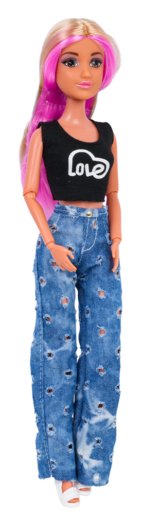 Krásná panenka, pro děti od tří let. Panenka je perfektně zpracovaná, s důrazem na každý detail a zcela bezpečná pro dítě. Je oblečená v halence, kalhotách a botách na podpatku. Oblečky můžeme sundávat a převlékat panenku do jiných. Pohyblivé nožičky a ručičky, ohýbatelné lokty a kolena usnadňují nastavení panenky do různých pozic.