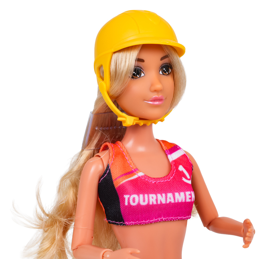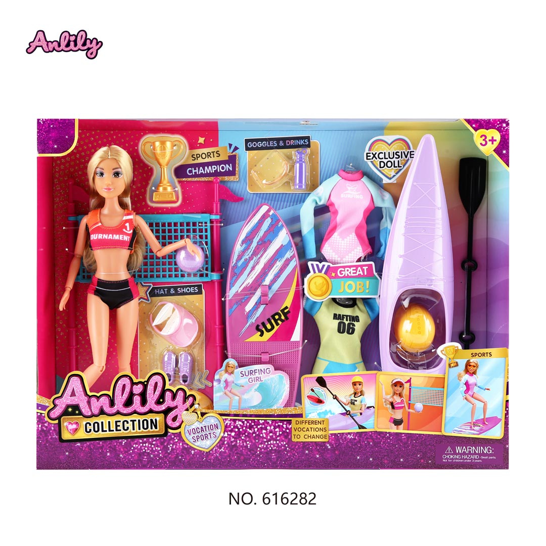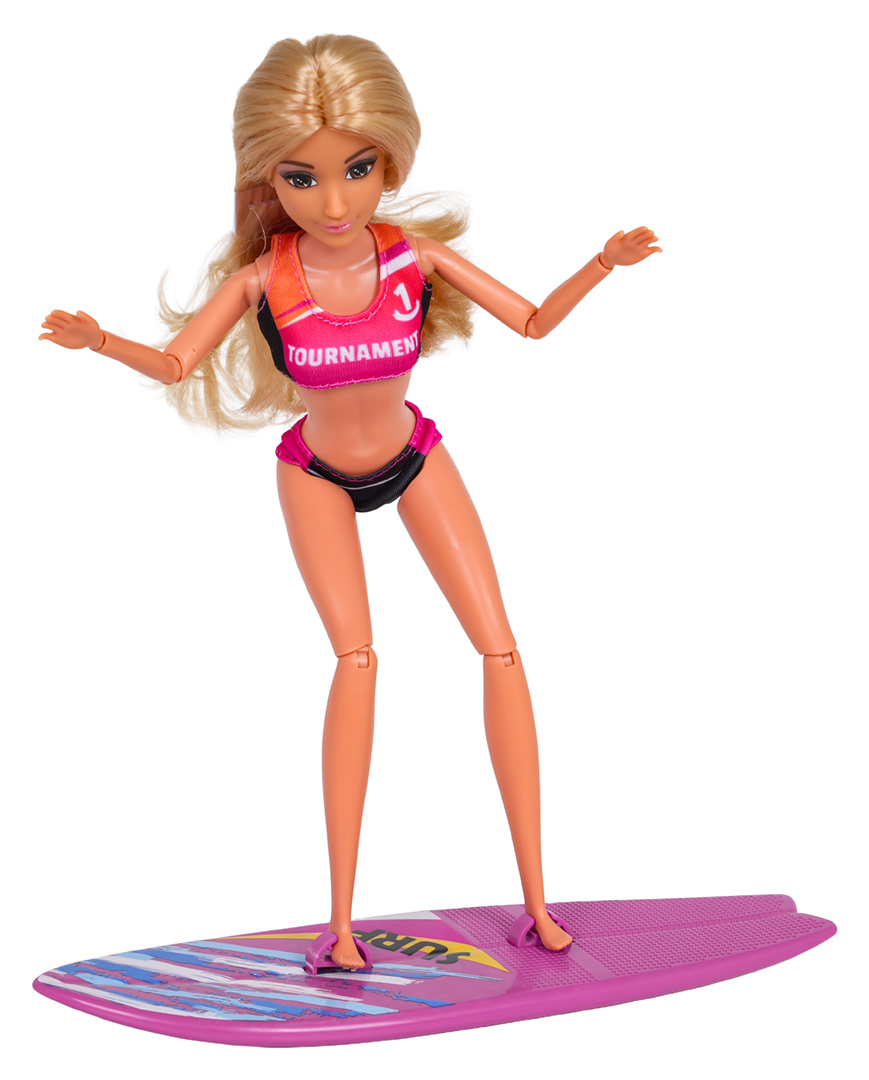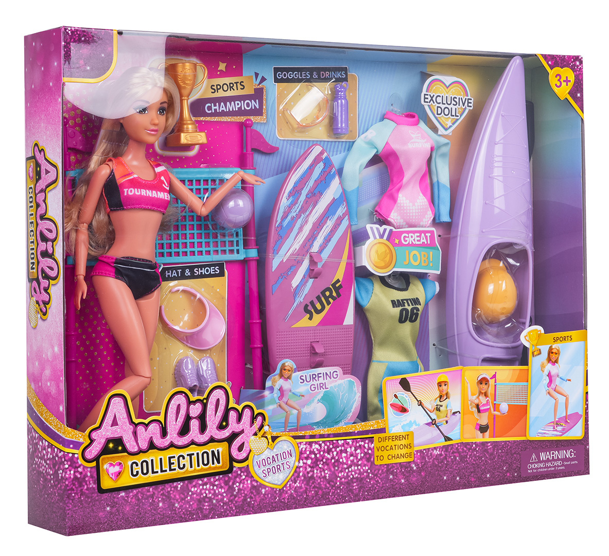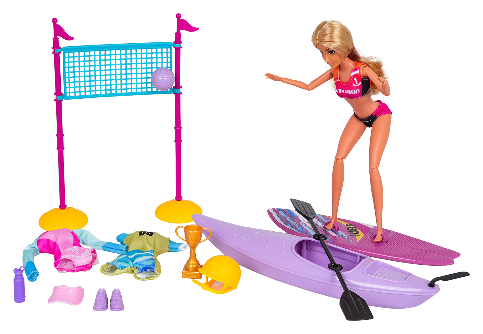 Sada panenka Olga na prázdninách a doplňky pro děti od tří let. Panenka je oblečena do pohodlného oblečení na volejbal, v sadě jsou dva další obleky na surfování a na kajak, do kterých můžeme panenku převlékat. Je tam také surfovací prkno, kajak, pádla, helma, síť na volejbal, kšiltovka, boty, brýle a láhev na vodu, a dokonce i vítězný pohár. S touto sadou se vaše ratolest nebude nudit. Panenka má pohyblivé ruce, nohy, ohýbatelná kolena, lokty, pohyblivé dlaně a hlavu, což usnadňuje její ztvárnění různých rolí.