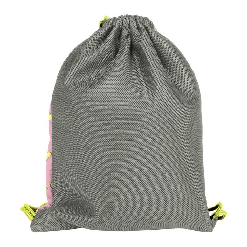 Tlusté, spletené stahovací šňůrky umožňují nošení tašky na zádech nebo přes rameno. Zadní část tašky je vyztužená a zakrytá sítí.