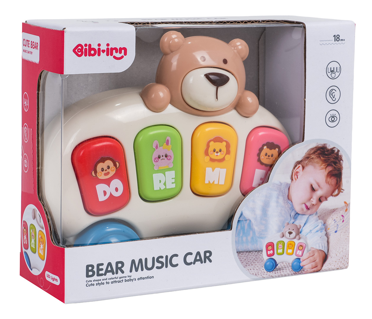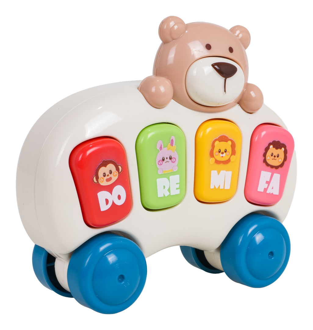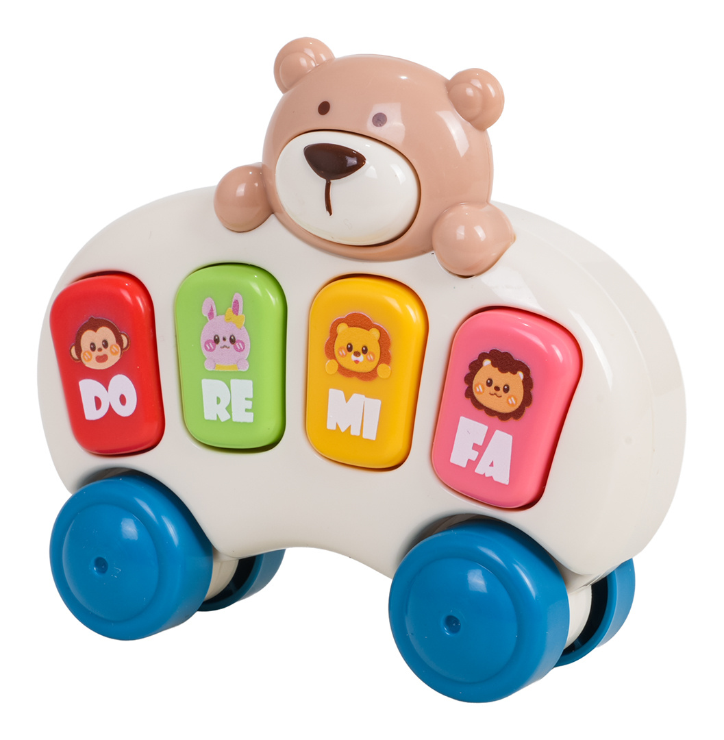 Pianinko s misemi a kolečky pro děti od osmnáctého měsíce života. Pianinko je vyrobeno z nejkvalitnějších materiálů v živých barvách, nemá ostré hrany. Pianinko připomíná autíčko s medvídkem a má čtyři zvukové klávesy s obrázky zvířátek a podsvícením. Stisknutí klávesy spustí režim piana (zvuky not, podsvícení klávesy). Dvojité stisknutí stejné klávesy spustí zvuky zvířátka. Stisknutí medvídka nahoře spustí veselé melodie. Hračka je napájena bateriemi typu 2 x AAA 1,5V.