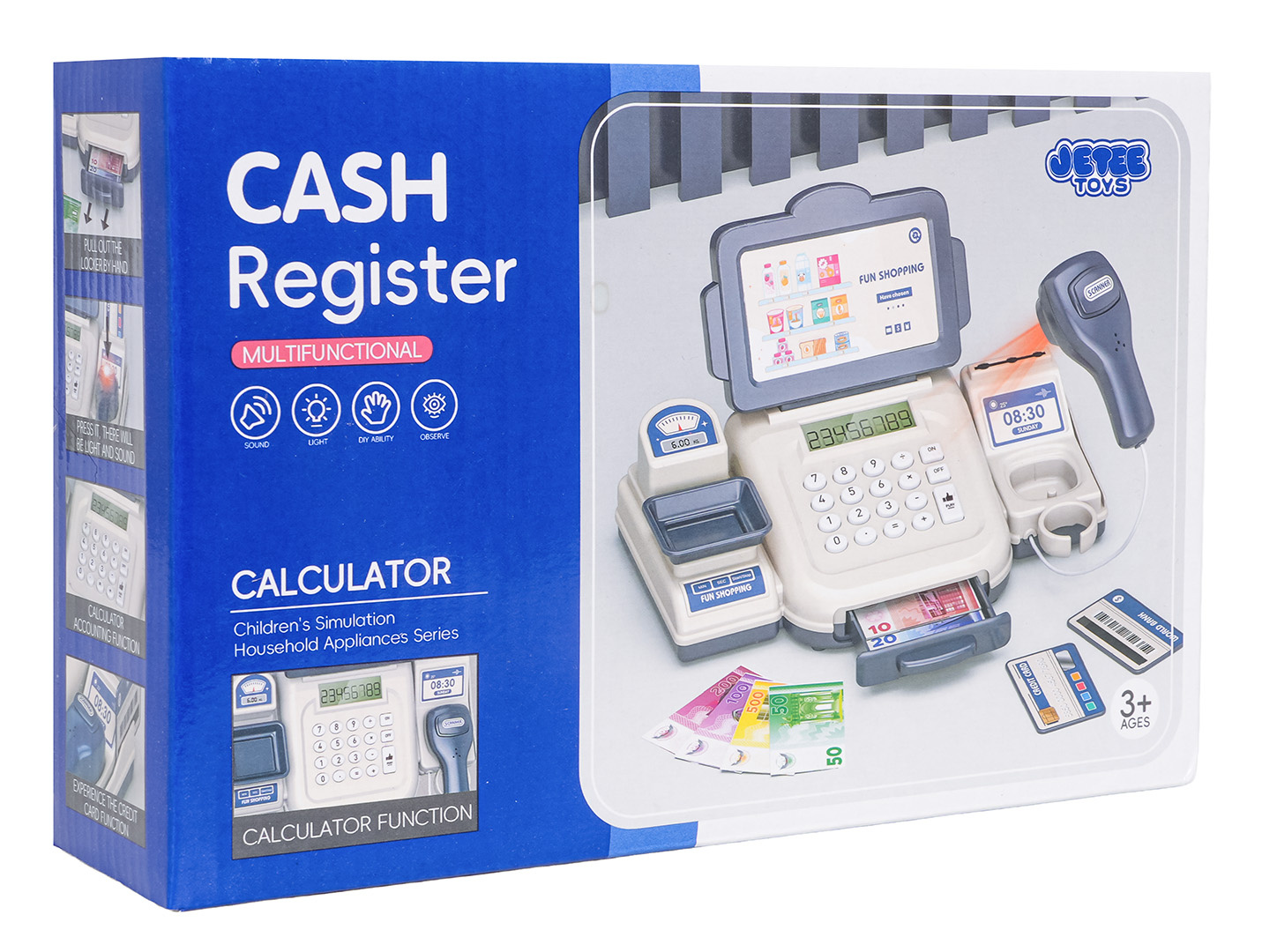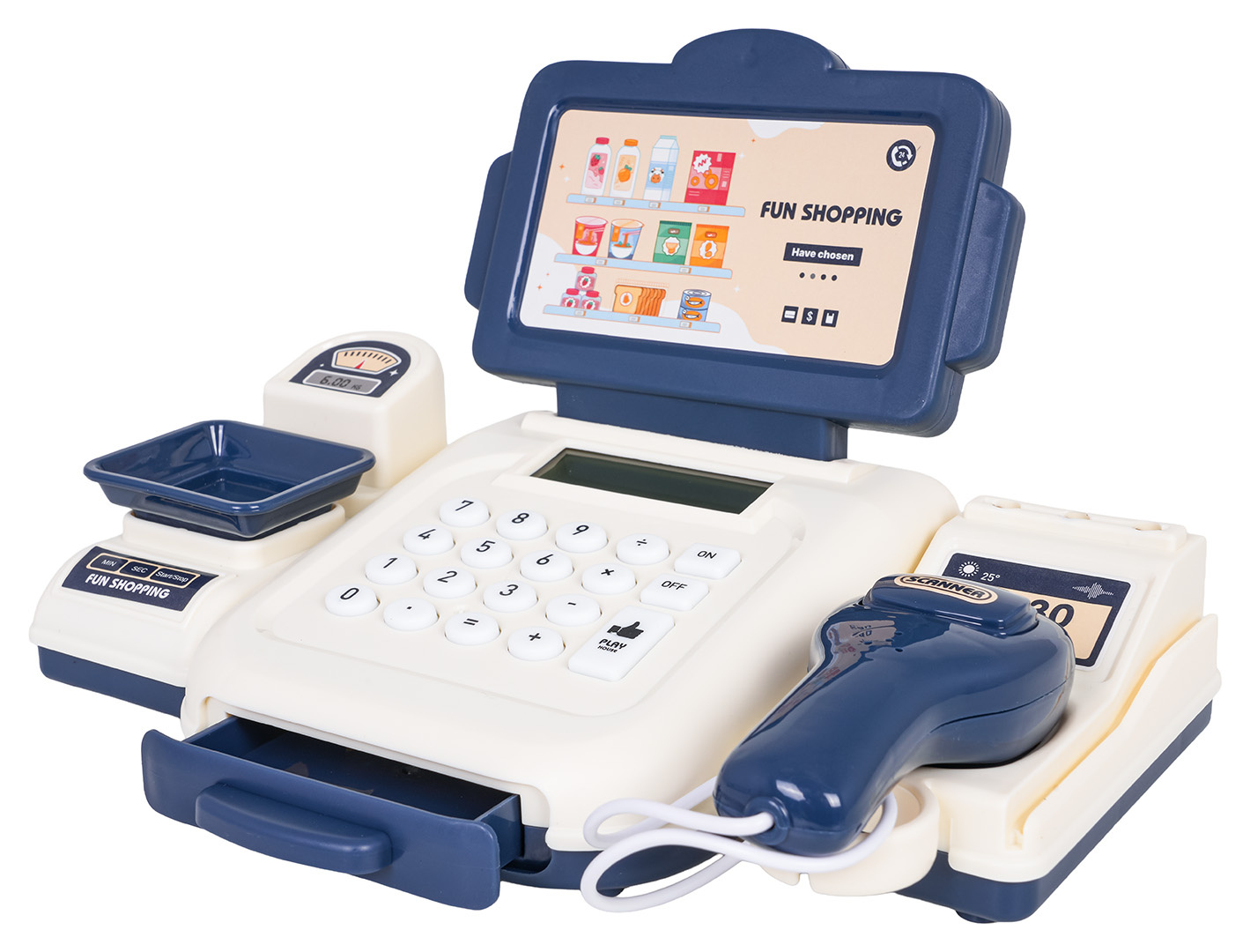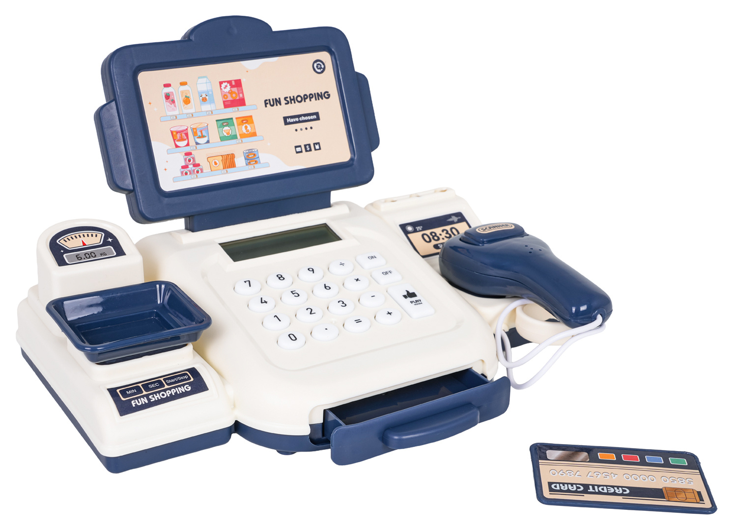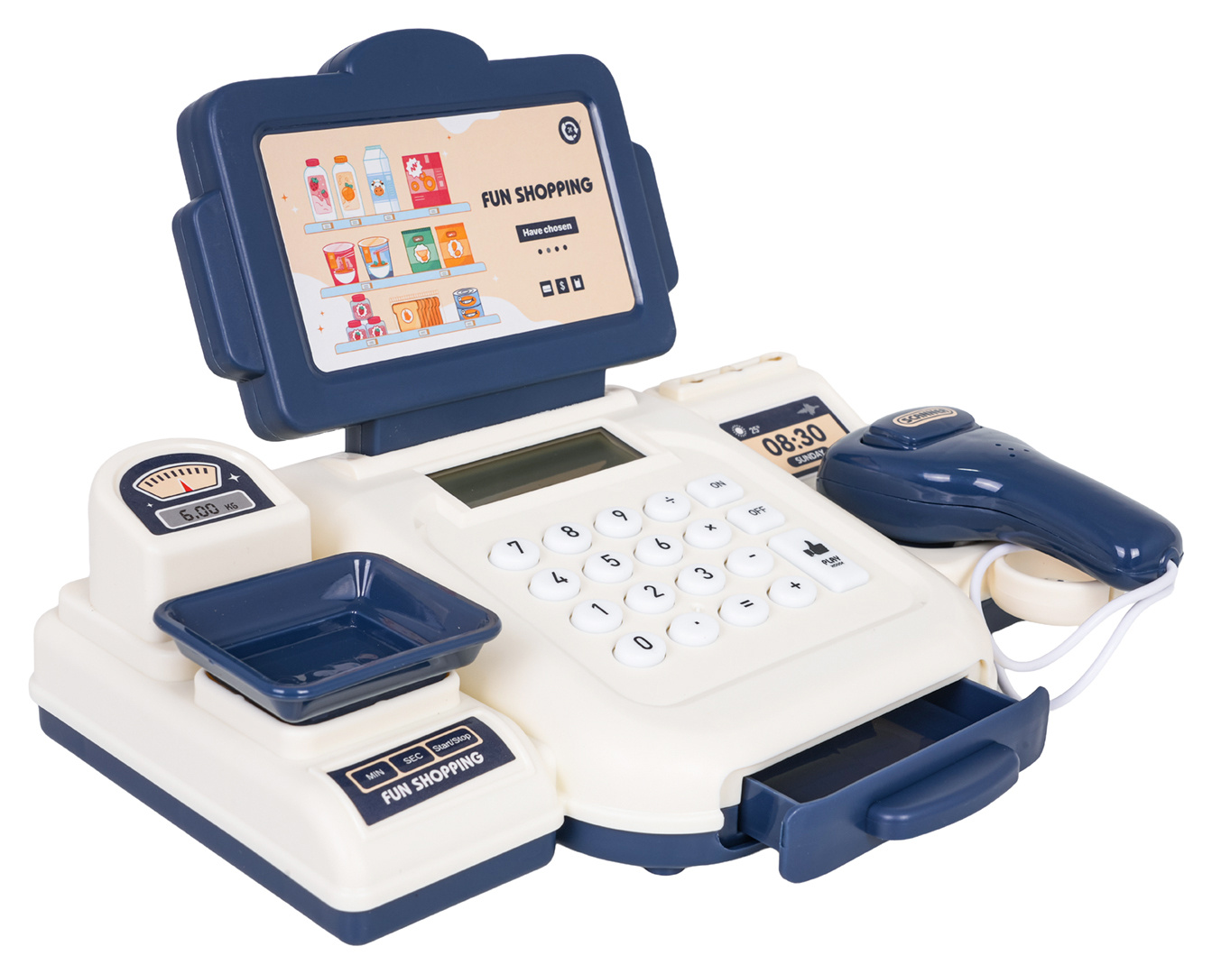Interaktivní pokladna s příslušenstvím pro děti od tří let. Sada je vyrobena z nejkvalitnějších materiálů bezpečných pro děti. Pokladna je vybavena váhou, otevíratelnou zásuvkou na peníze, kalkulačkou, platební kartou a skenerem. Skenner má zvukové a světelné funkce. Kalkulačka vydává zvuk po stisknutí každého tlačítka. V sadě s pokladnou se nacházejí také peníze v nominálních hodnotách 500, 200, 100, 50, 20, 10 a platební karta. Hračka je napájena bateriemi typu 2 x AA 1,5V (baterie nejsou součástí balení).