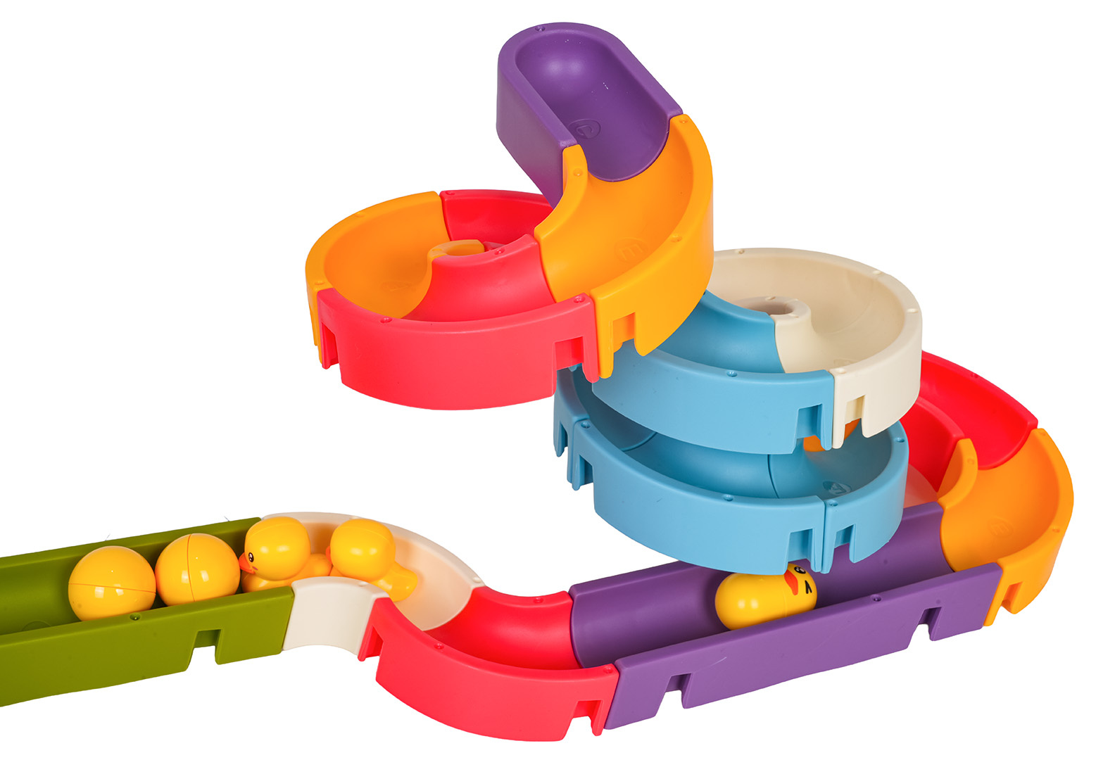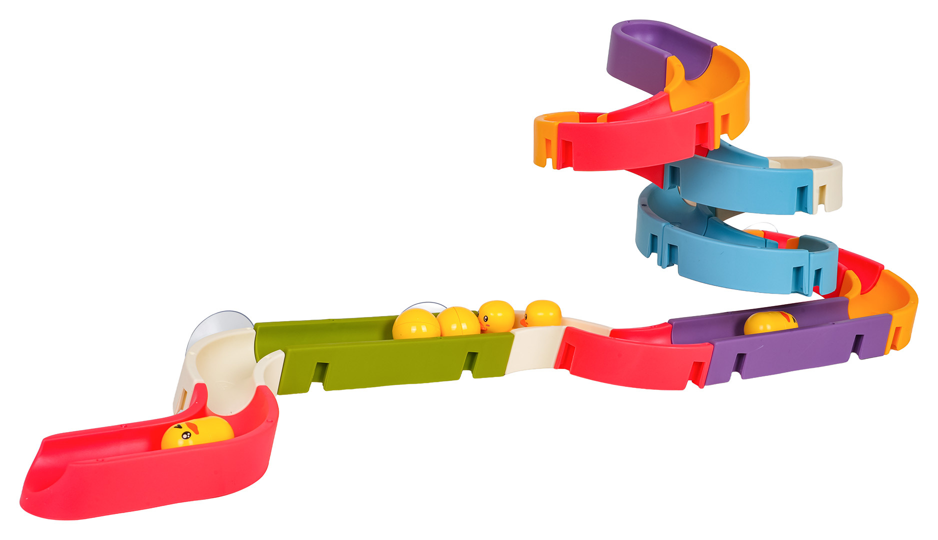 Dráha, skluzavka s kachničkami do koupele pro děti od tří let. Barevná dráha zpříjemní nejednu koupel. Byl vyroben z nejkvalitnějších materiálů, bezpečných pro dítě, v živých barvách. Sada má přísavky, díky kterým ji lze připevnit k vaně nebo jiné rovné ploše. Po umístění kačenek na start dráhy stačí je pokropit sprchou a rozběhnou se po dráze přímo do vody.