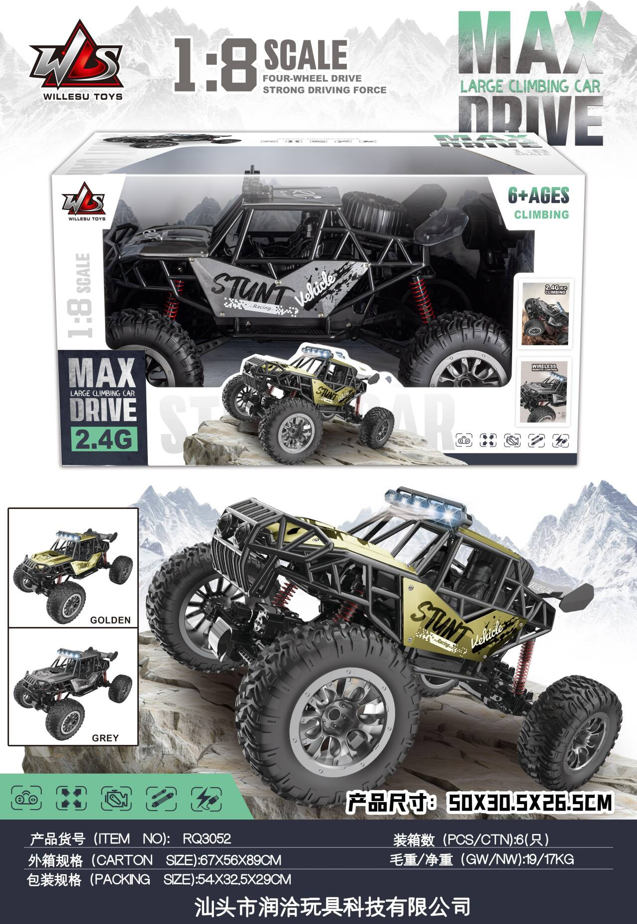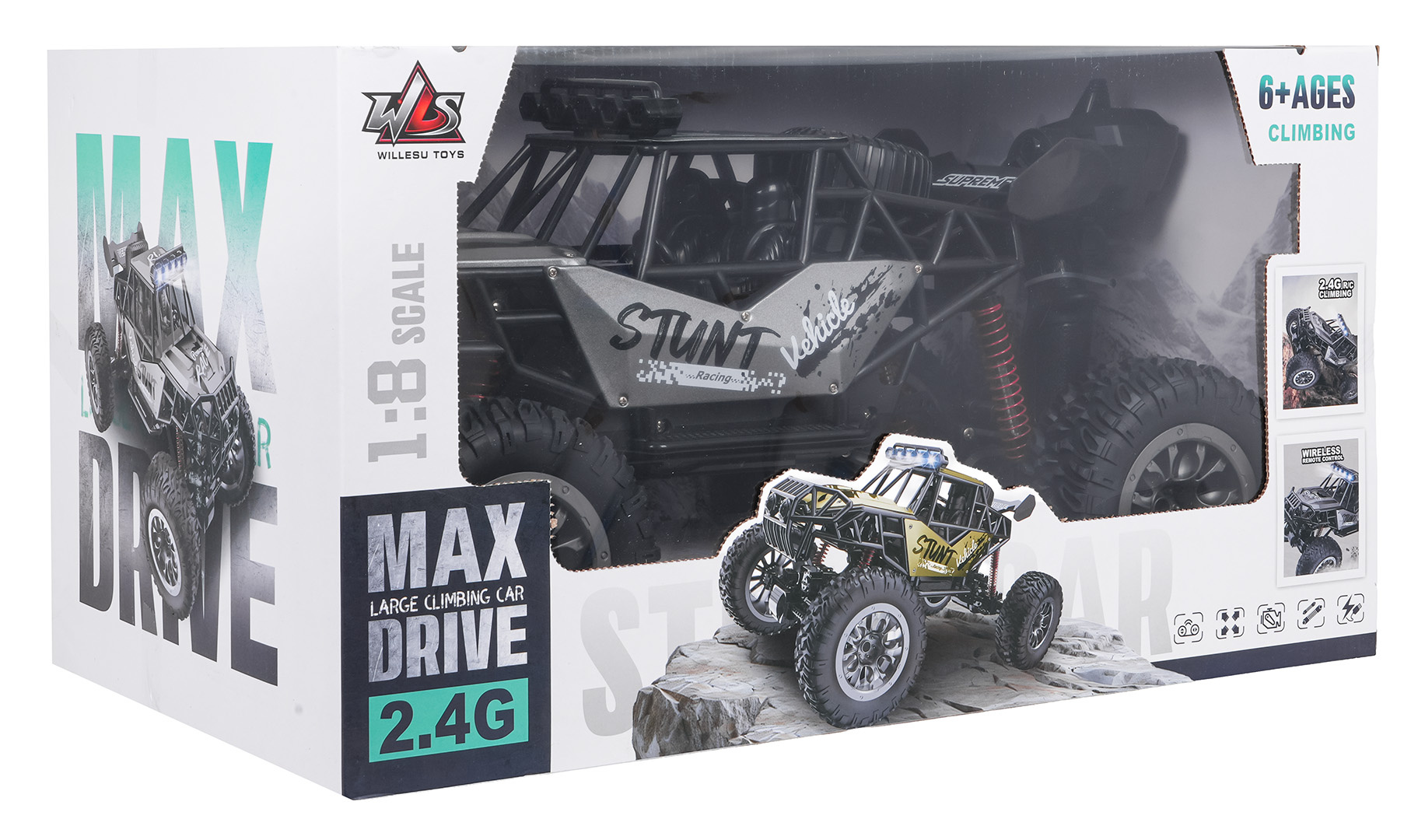 Kovový crawler STUNT Racing Šedý v měřítku 1:8, dálkově ovládaný s pohonem na čtyři kola je určen pro děti od šesti let. Velké gumové, protiskluzové pneumatiky, pružinové zavěšení způsobuje, že vozidlo bez problémů překoná jakýkoli povrch. Crawler je vyroben z vysoce kvalitních materiálů, má kovovou karoserii, což mu zajišťuje odolnost. Motor použitý ve vozidle umožňuje dosažení vysoké rychlosti. Hračka je napájena akumulátorem typu 7,4V (v balení), ovladač bateriemi typu 4 x AA 1,5 V (nejsou součástí balení).