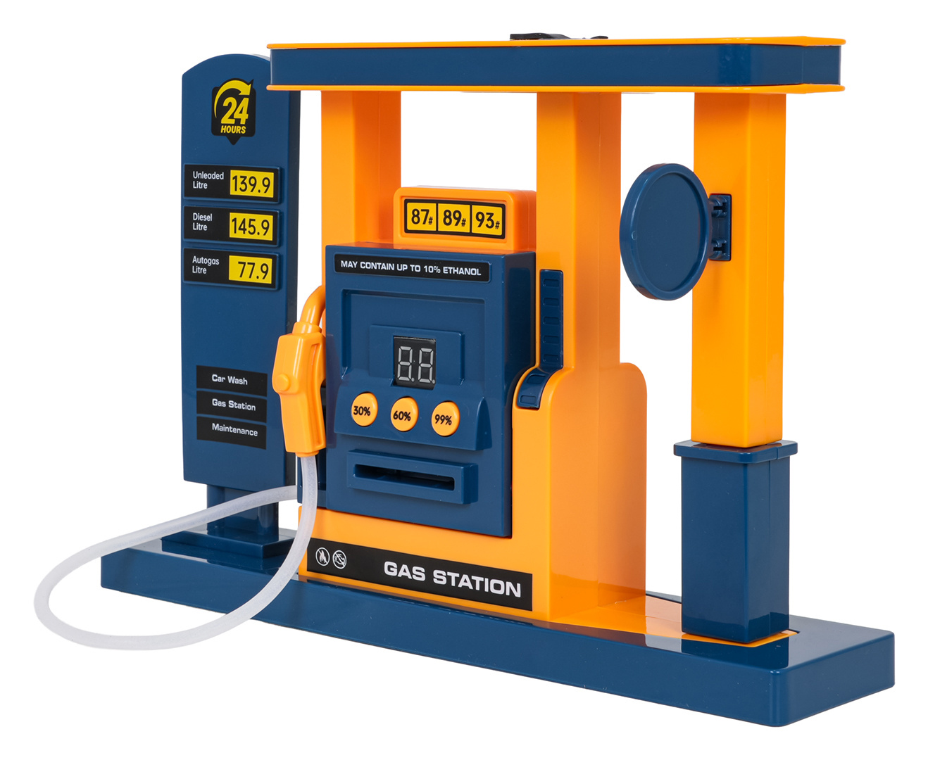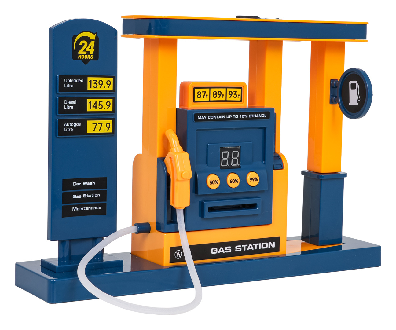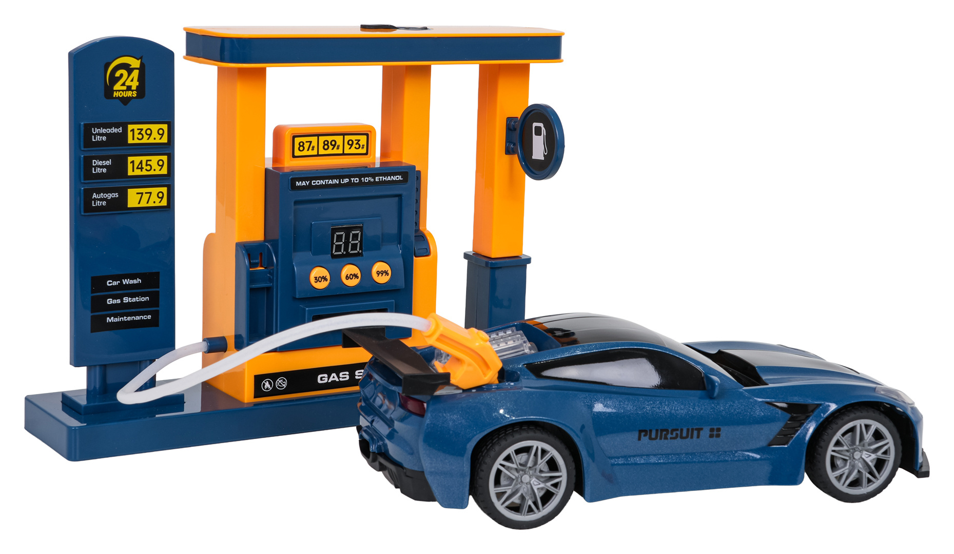 Dálkově ovládané vozidlo s čerpací stanicí pro děti od tří let. Vozidlo má odolnou karoserii, přední a zadní osvětlení a gumové pneumatiky, které mu zajišťují dobrou přilnavost. Je ovládán dálkovým ovladačem a jezdí všemi směry, dopředu, dozadu, doprava a doleva. Vozidlo má funkce tankování s ukazatelem hladiny paliva 30 %, 60 %, 99 %. Je třeba pipetou doplnit stanici vodou, vložit platební kartu, vybrat úroveň tankování a natankovat vozidlo. Pozor, vozidlo jezdí pouze s natankovanou nádrží!!! Během jízdy se z zadní části vozidla uvolňuje kouř, což přidává hře na realističnosti. Auto je napájeno bateriemi typu 4 x AA 1,5 V (nejsou součástí balení), čerpací stanice bateriemi typu 3 x 1,5 V AA (nejsou součástí balení), ovladač bateriemi typu 2 x AAA 1,5 V (nejsou součástí balení).