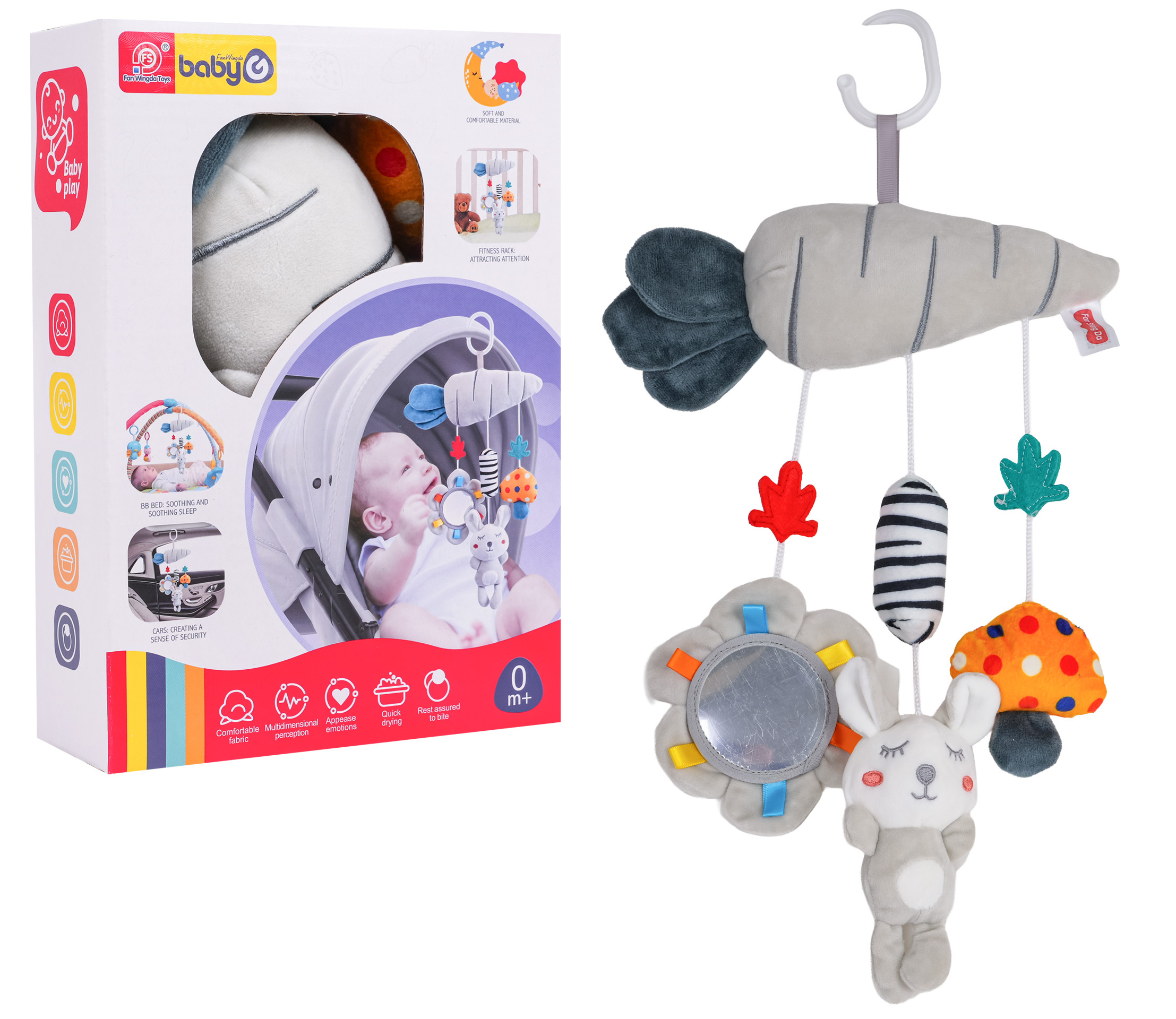 Senzorická závěsná hračka na kočárek, postýlku nebo autosedačku pro děti od prvních dnů života. Sada je vyrobena z měkkých a pro dítě bezpečných materiálů, nejlepší kvality. Stimuluje smysly miminka na mnoha úrovních. Jednotlivé prvky šustí nebo chrastí a živé barvy přitahují pozornost dítěte a povzbuzují ho ke hře.
