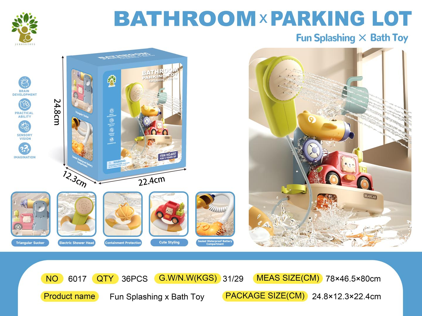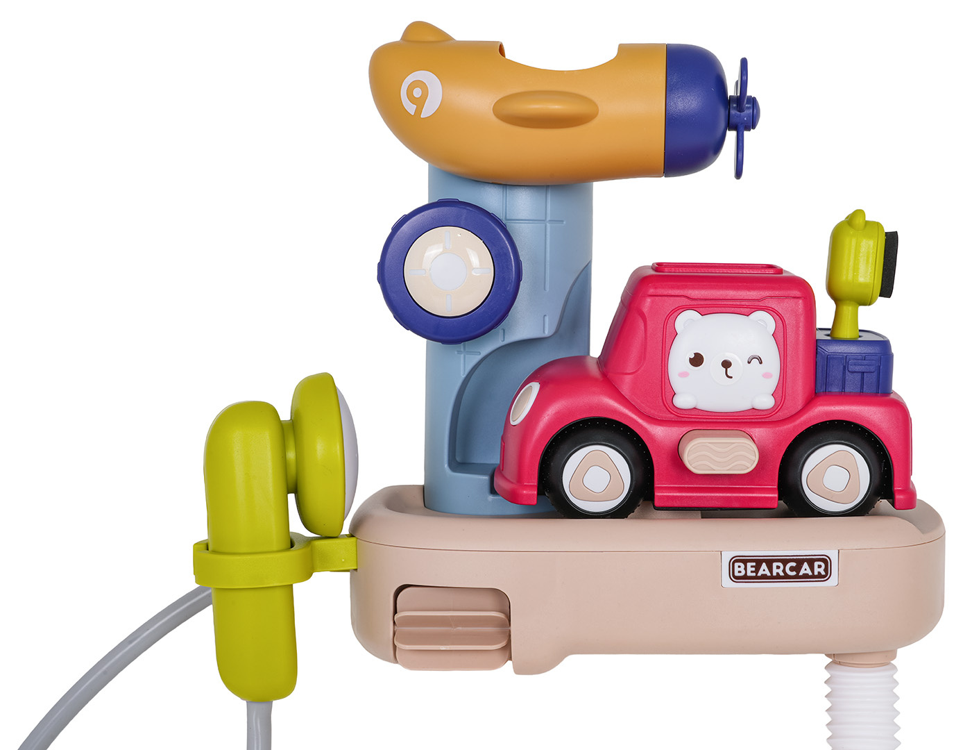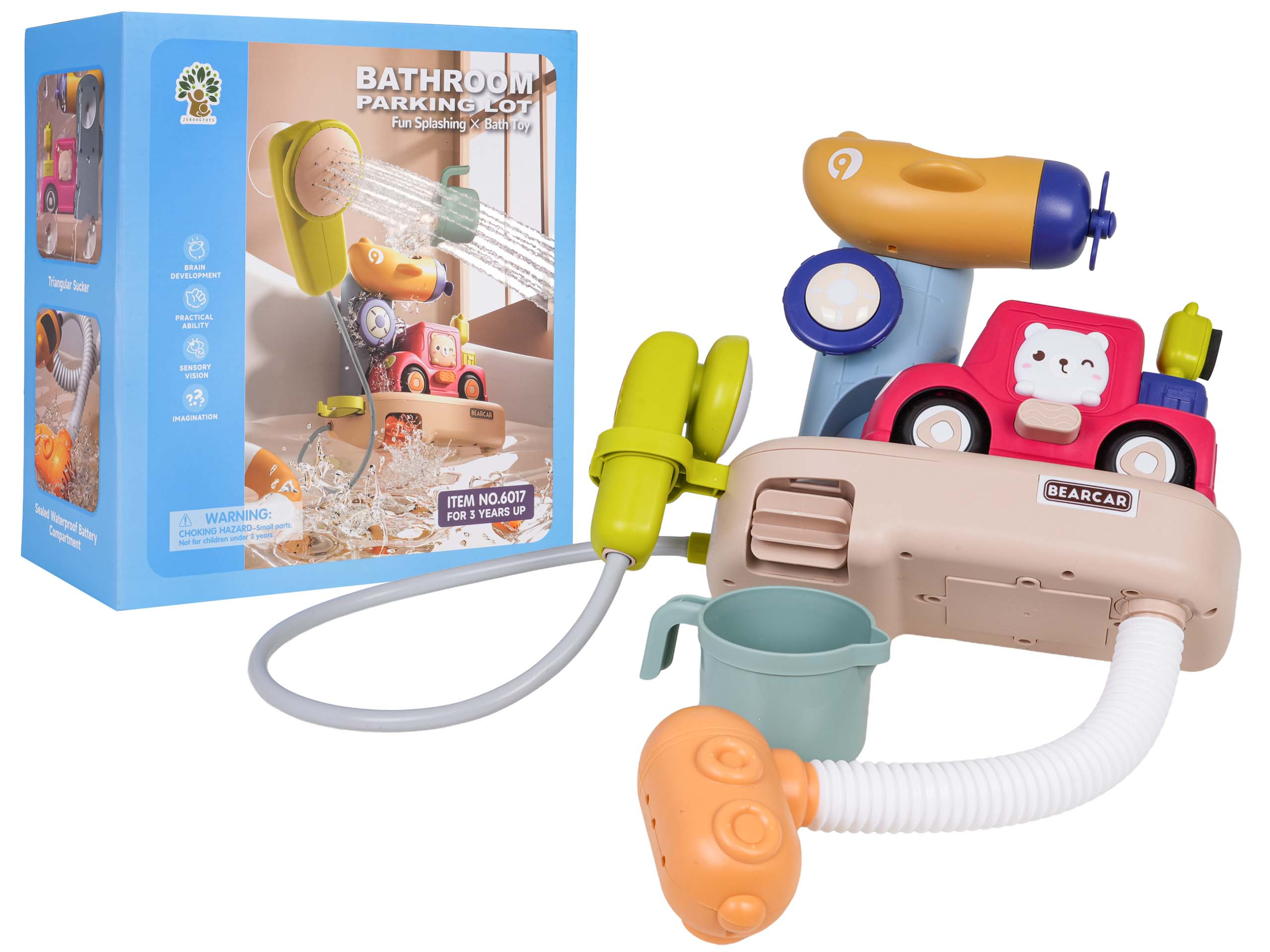 Sada na koupání se sprchou a doplňky pro děti od tří let. Barevná sada hraček do vody je vyrobena z nejkvalitnějších materiálů bezpečných pro miminko. V sadě můžeme najít sprchu, hrnek, autíčko. Sada má odolné přísavky, díky kterým ji můžeme připevnit na vanu nebo jiný rovný povrch. Pro fungování sprchy jsou nezbytné baterie typu 3 x 1,5 V (nejsou součástí balení), po jejich instalaci je třeba ponořit spodní část sprchy do vody a stisknout tlačítko. S touto sadou se vaše dítě nebude nudit během koupele.