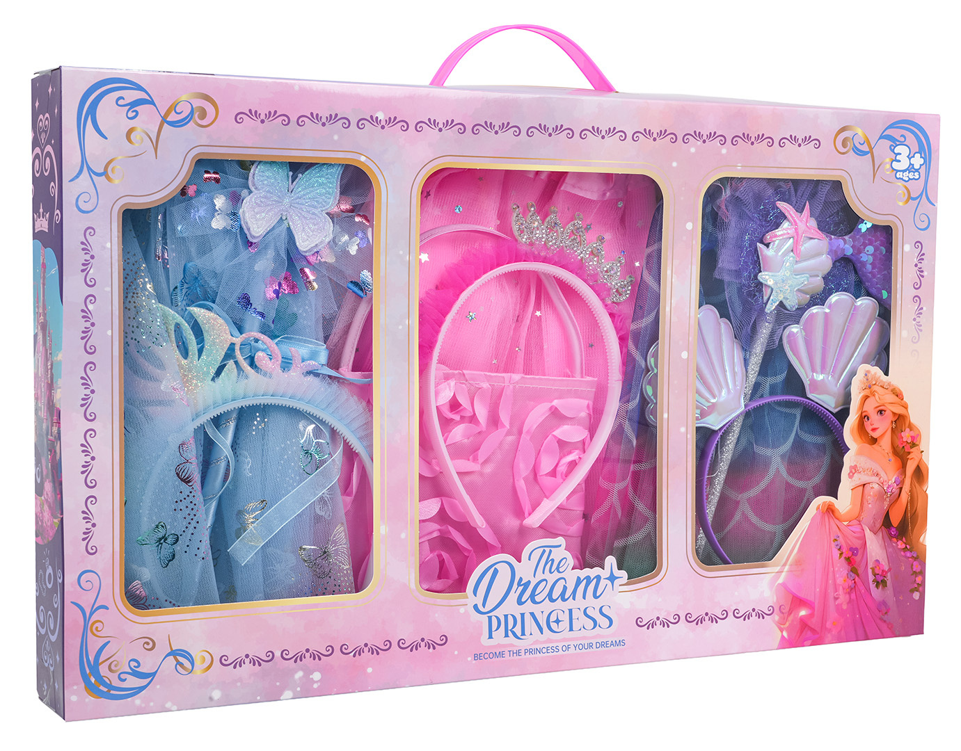 Barevná sada malé princezny pro děti od tří let. Sada byla vyrobena s důrazem na detaily v živých barvách. Skládá se ze tří různobarevných tylových sukní, tří čelenek, kabelky a dvou hůlek. Sada ideální bude na ples, představení nebo pro každodenní zábavu. Teď se vaše ratolest bude moci vžít do role princezny.