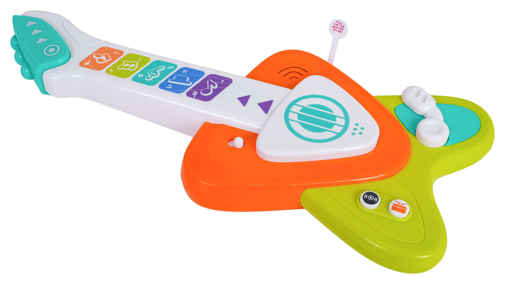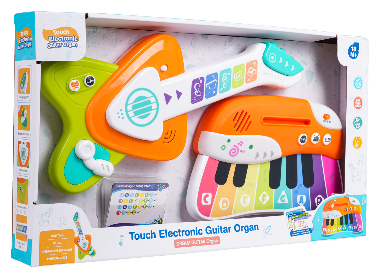 Sada prvních dotykových nástrojů pro děti od osmnáctého měsíce života. Součástí sady je kytara, klávesy a notové listy. Hračkové nástroje jsou vyrobeny z nejlepšího plastu, který je zcela bezpečný pro dítě. Sada přitahuje pozornost dítěte bohatstvím barev a vybízí ke hře. Hra na nástroje rozvíjí u dětí hudební dovednosti a sluch, učí je rozlišovat zvuky. Kytara je napájena bateriemi typu 3 x AAA 1,5V (baterie nejsou součástí balení), klávesy jsou napájeny bateriemi typu 3 x AAA 1,5 V (nejsou součástí balení).