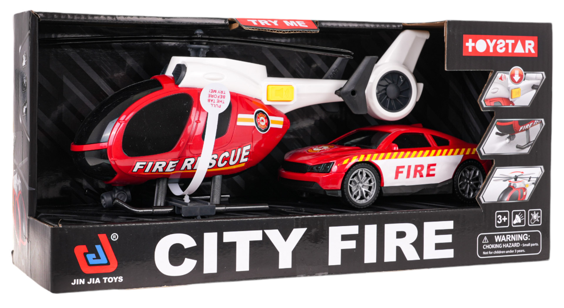 Interaktivní sada hasičského sboru, vrtulník a autíčko pro děti od 3 let. Sada byla vyrobena z nejkvalitnějšího plastu v živých barvách. Helikoptéra má tlačítko aktivující světelné a zvukové funkce. Stisknutí tlačítka spouští přední a zadní osvětlení vrtulníku a zvuky motoru, alarmy a zvuky letu. Helikoptéra je napájena bateriemi typu 3 x AG13 (v balení). Hasičské vozidlo má gumové pneumatiky a volné kolo, které usnadňuje jeho volný pohyb po podkladu. Lopatky vrtulníku můžeme otáčet ručně.