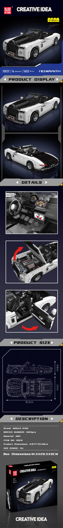 Vysoce kvalitní stavební kostky Mould King pro děti od čtrnácti let. Sada ze série vozidel se skládá z 1688 dílků, ze kterých lze postavit bílý kabriolet. Tento skvělý model jistě upoutá pozornost svými detaily. Vozidlo má detailní interiér, otevíratelnou kapotu a boční dveře.