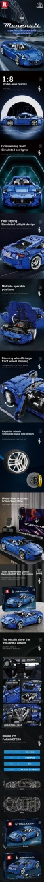 Vysoce kvalitní stavební kostky pro děti od čtrnácti let. Sada se skládá z 5480 prvků, ze kterých lze postavit modré auto Maserati v měřítku 1:8. Tento skvělý model auta jistě upoutá pozornost svými detaily. Vozidlo má detailně zpracovaný interiér, otevírací boční dveře a kapotu.