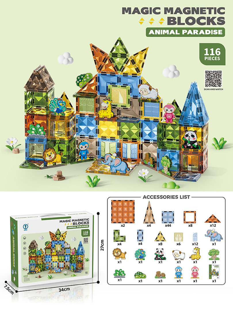 | Bohatě vybavená sada magnetických kostek se zvířátky pro děti od tří let. Sada se skládá z magnetických kostek, konstrukčních prvků a postaviček se zvířátky (lev, slon, panda, ovečka, páv). Kostky byly vyrobeny z nejkvalitnějších materiálů, pevně drží, jsou barevné a figurky s postavami navíc dodávají celému setu na půvabu. Skládání kostek pozitivně ovlivňuje rozvoj kreativity, učí trpělivosti a soustředění.