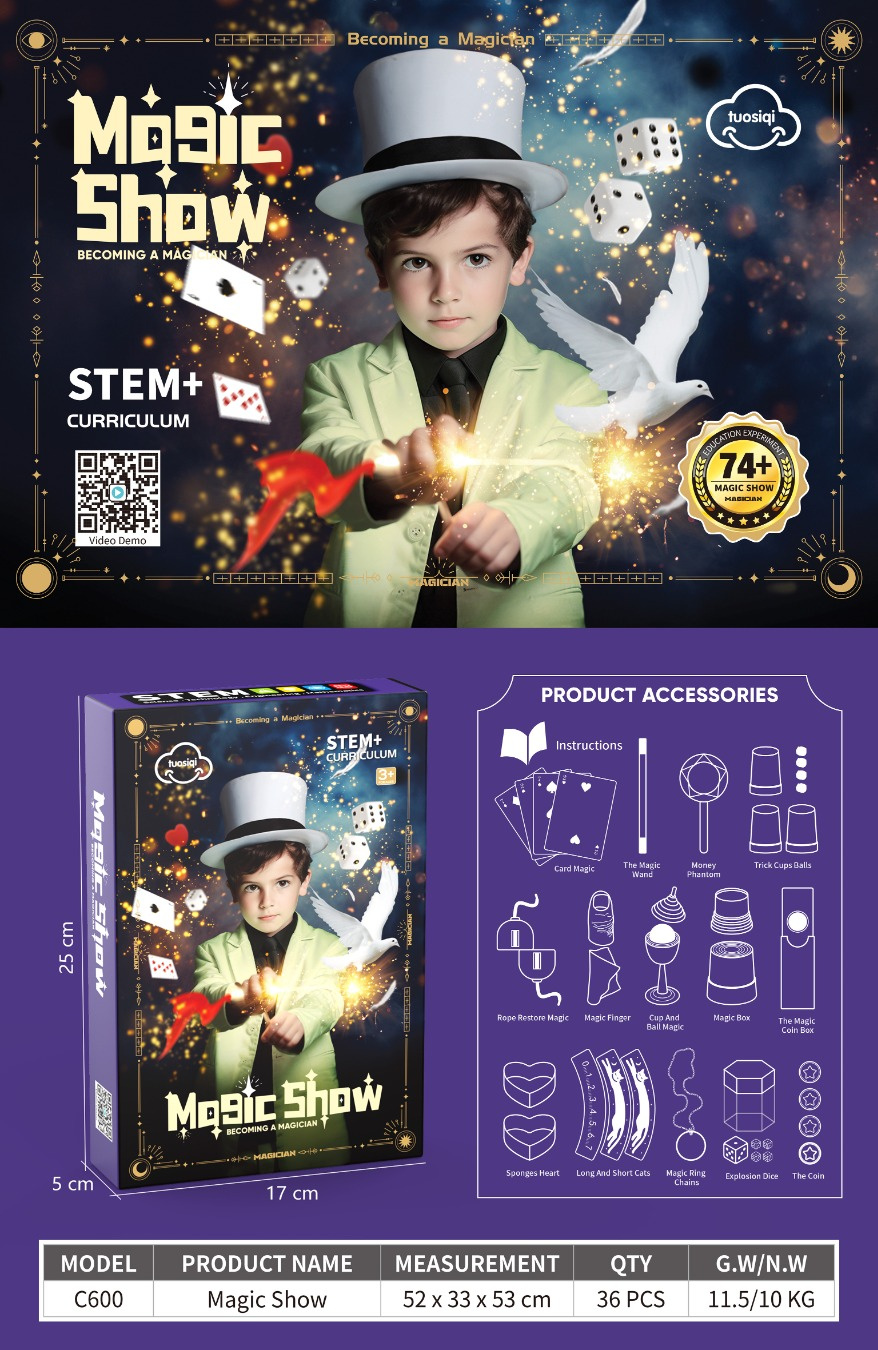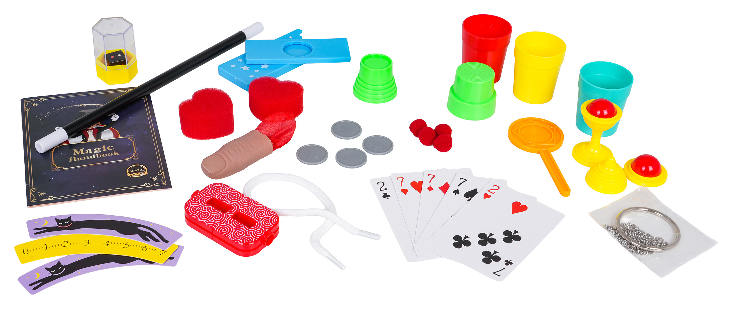 Sada malého kouzelníka, iluzionisty pro děti od tří let. Sada kombinuje zábavu, učení a zábavu. Ovládni tajné triky a překvap své blízké. Sada rozvíjí kreativitu, koncentraci a zručnost. Sada bude ideální pro každého, začátečníky i pokročilé. Každý trik je podrobně vysvětlen v návodu nebo na záznamu. V balení se nachází přístupový kód k instruktážním videím. S touto sadou lze provést až 74 kouzelnických triků.