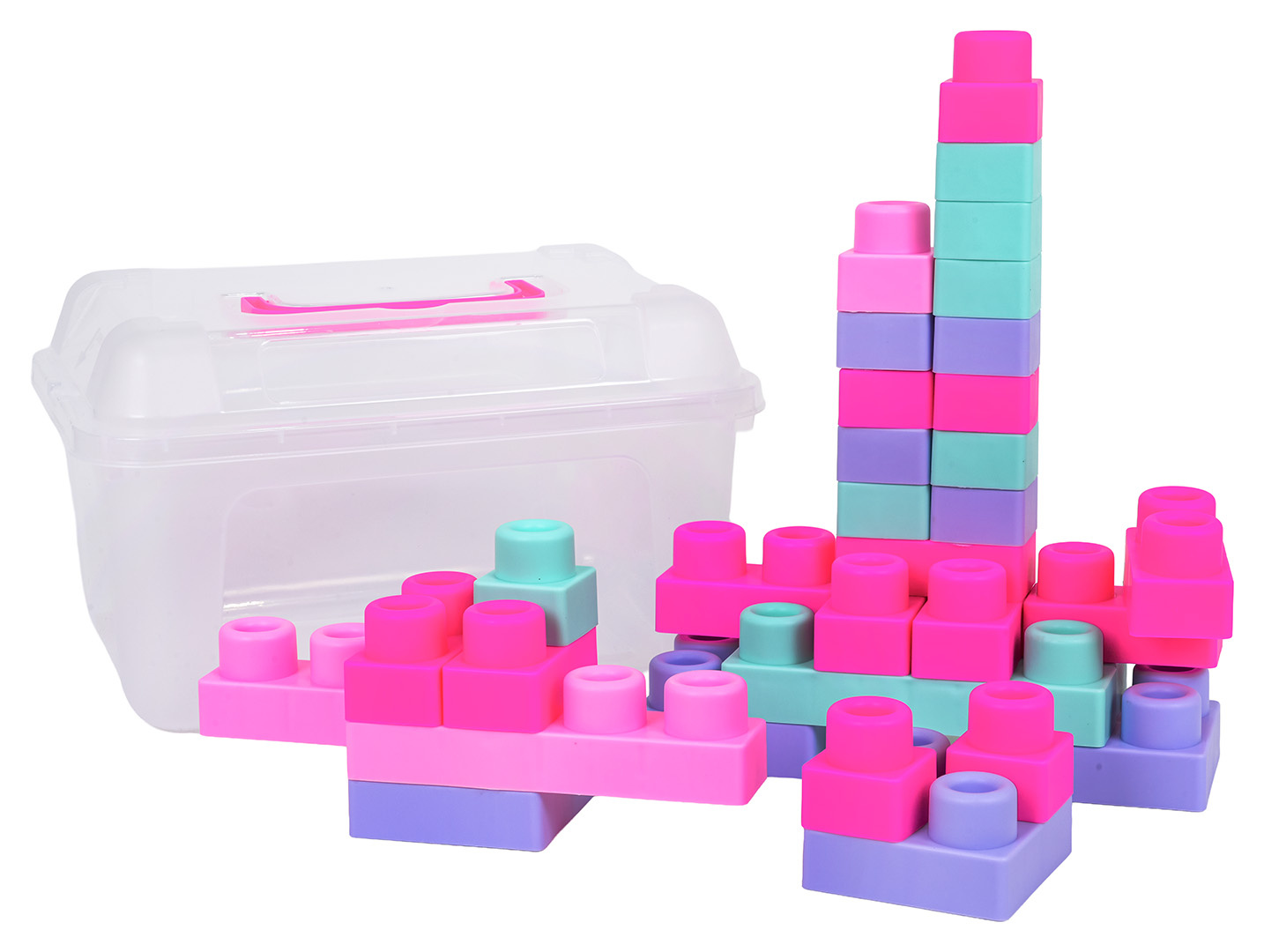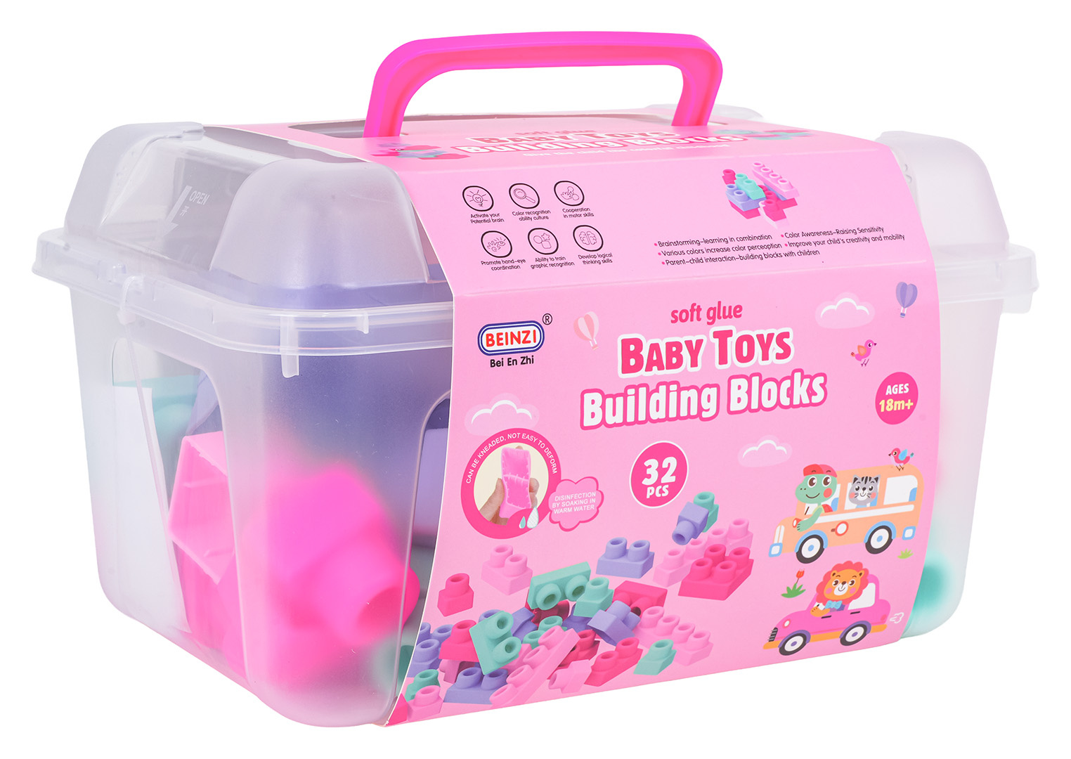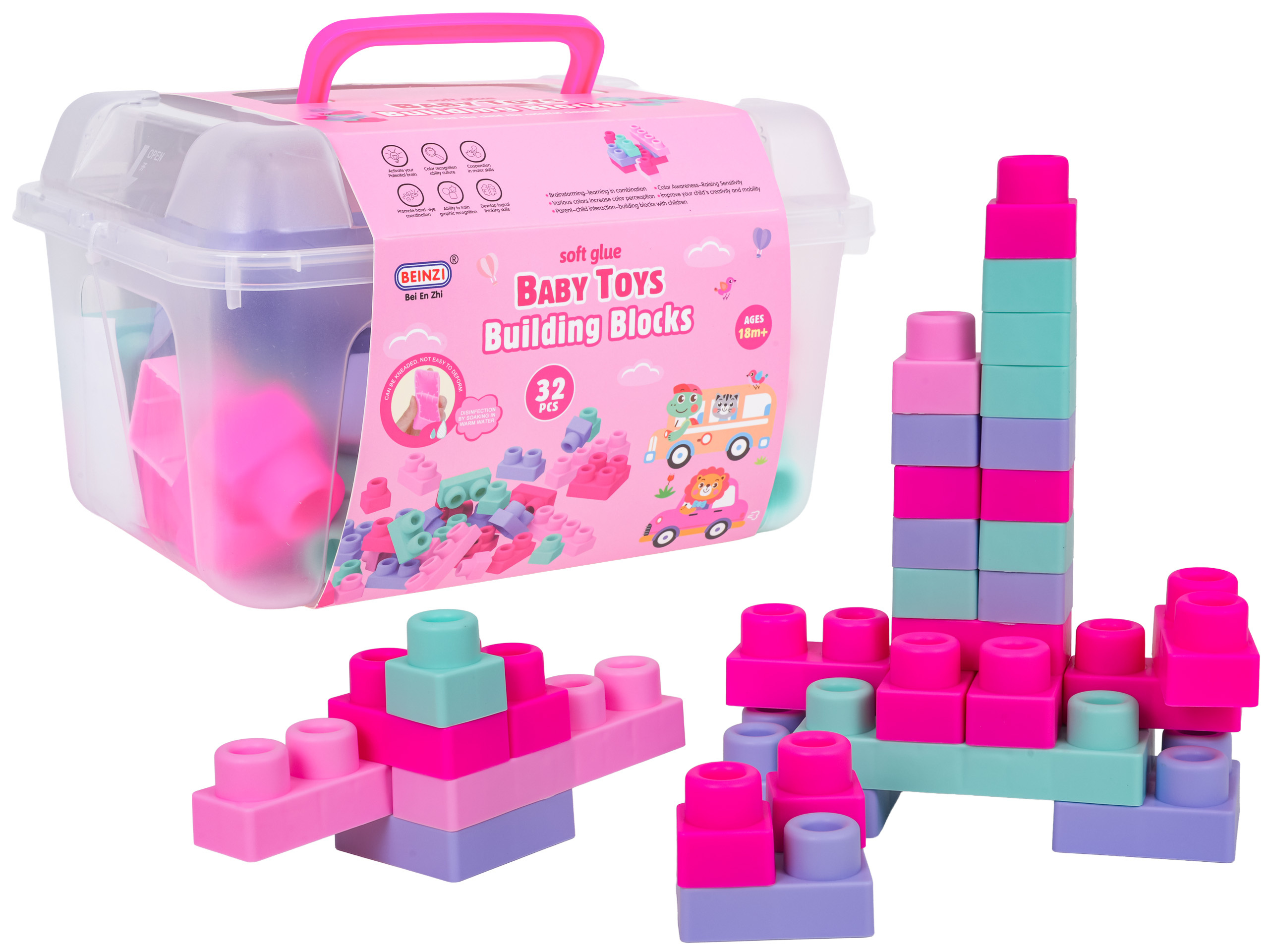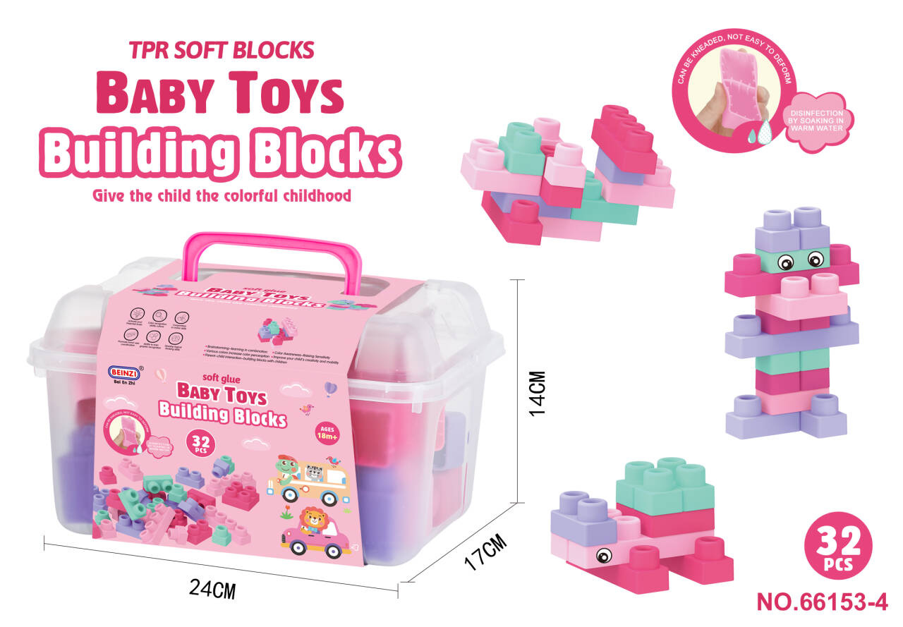 Sada barevných měkkých kostek s kufříkem pro děti od osmnácti měsíců. Sada je vyrobena z materiálu PVC, který je bezpečný pro děti i životní prostředí. Kostky jsou lehké a nemají ostré hrany. Velmi snadno se udržují v čistotě, po vyvaření neztrácejí barvy. Knedlíčky můžeme libovolně ohýbat, a po ohnutí se vracejí do svého předchozího tvaru.