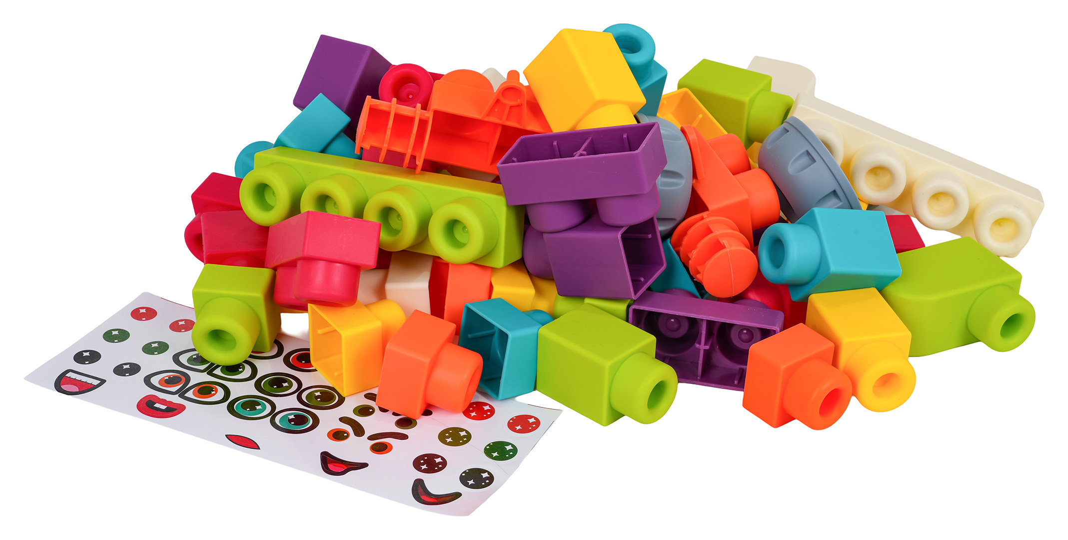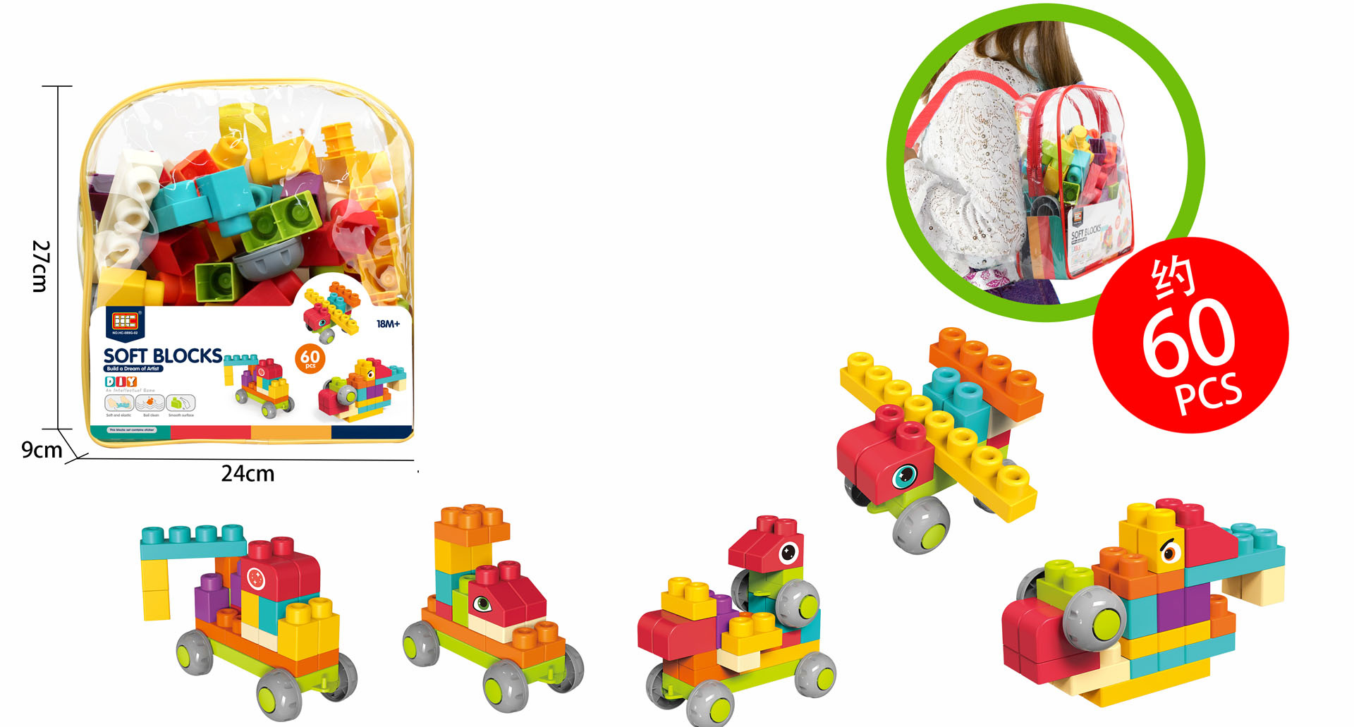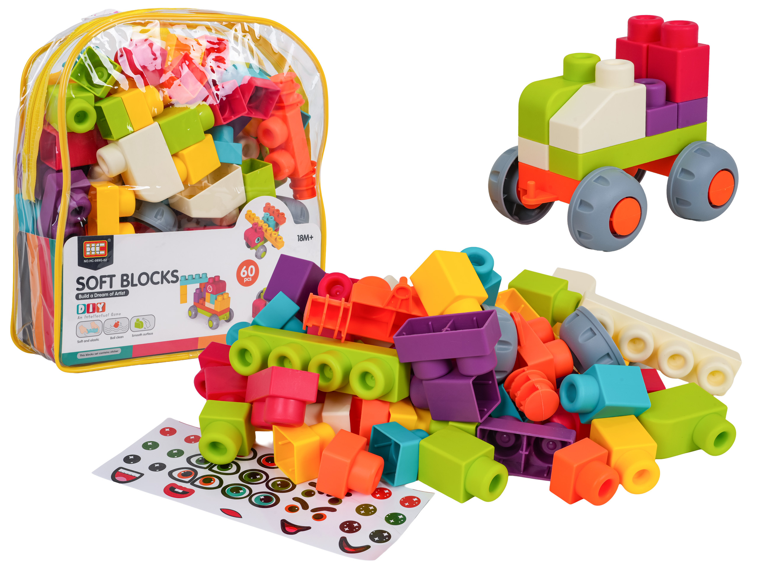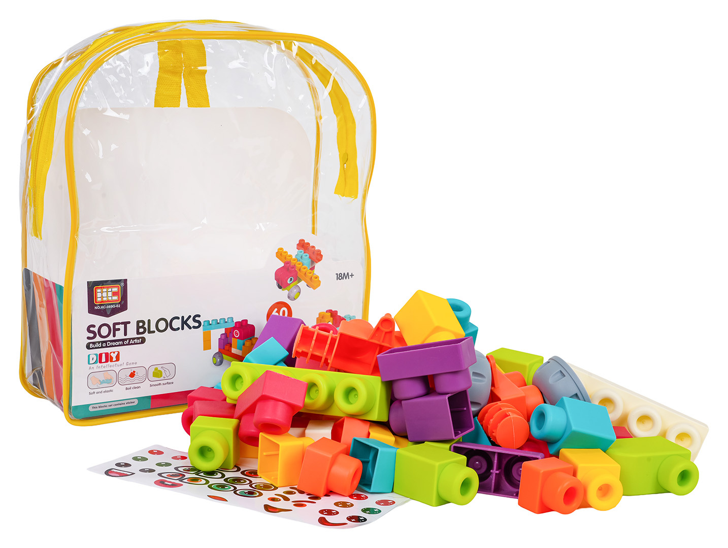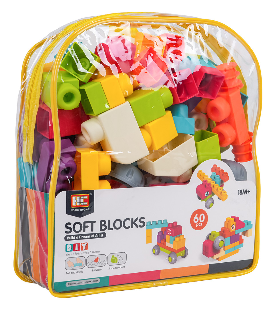 Sada barevných měkkých kostek s batohem pro děti od osmnácti měsíců věku. Sada je vyrobena z materiálu PVC, který je bezpečný pro děti i životní prostředí. Kostky jsou lehké a nemají ostré hrany. Velmi snadno se udržují v čistotě, po vyvaření neztrácejí barvy. Knedlíčky můžeme libovolně ohýbat, a po ohnutí se vracejí do svého předchozího tvaru.