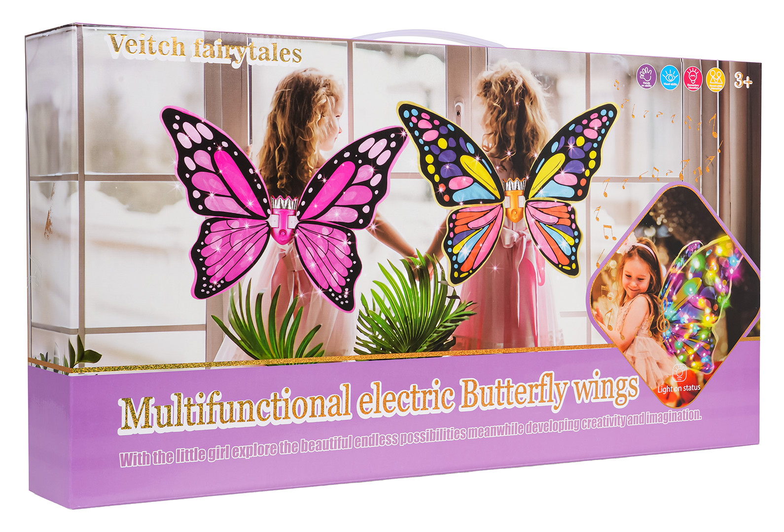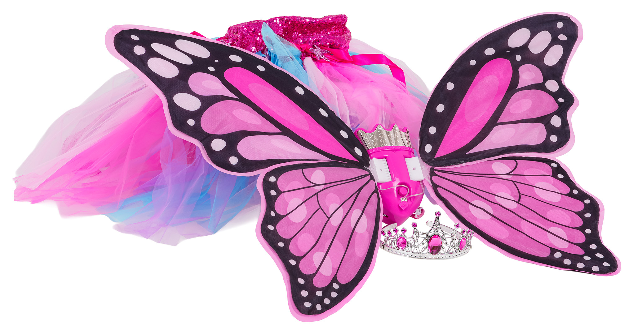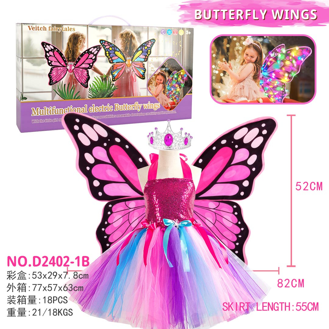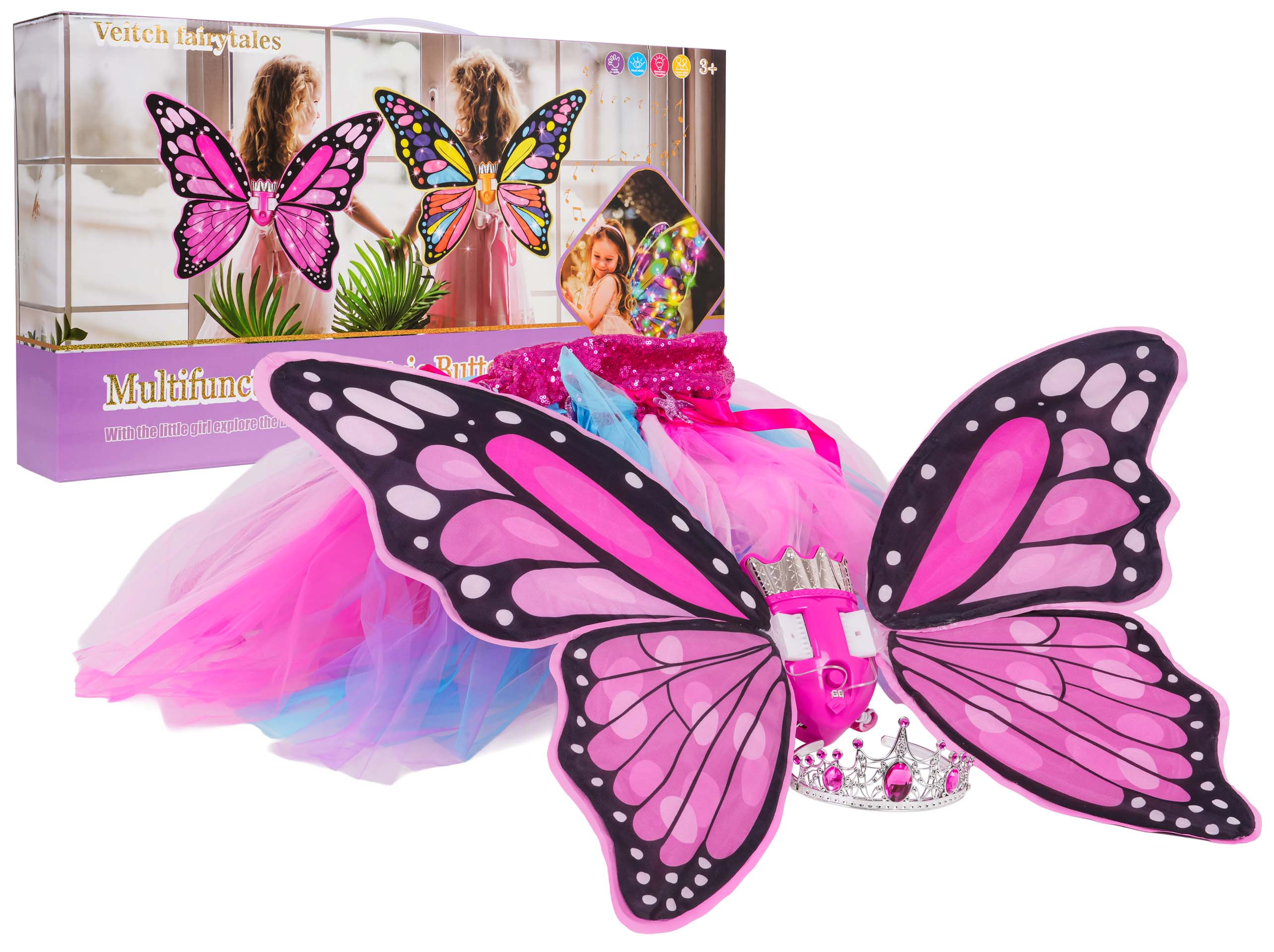Nádherná sada, motýlí křídla, duhové šaty a koruna pro děti od tří let. Sada byla vyrobena s důrazem na detaily, okouzluje bohatstvím barev. Vaše ratolest se bude cítit pohádkově a výjimečně v tomto kostýmu. Ideální sada na ples, představení nebo pro každodenní zábavu. Křídla jsou napájena bateriemi typu 4 x AA 1,5 V (nejsou součástí balení).