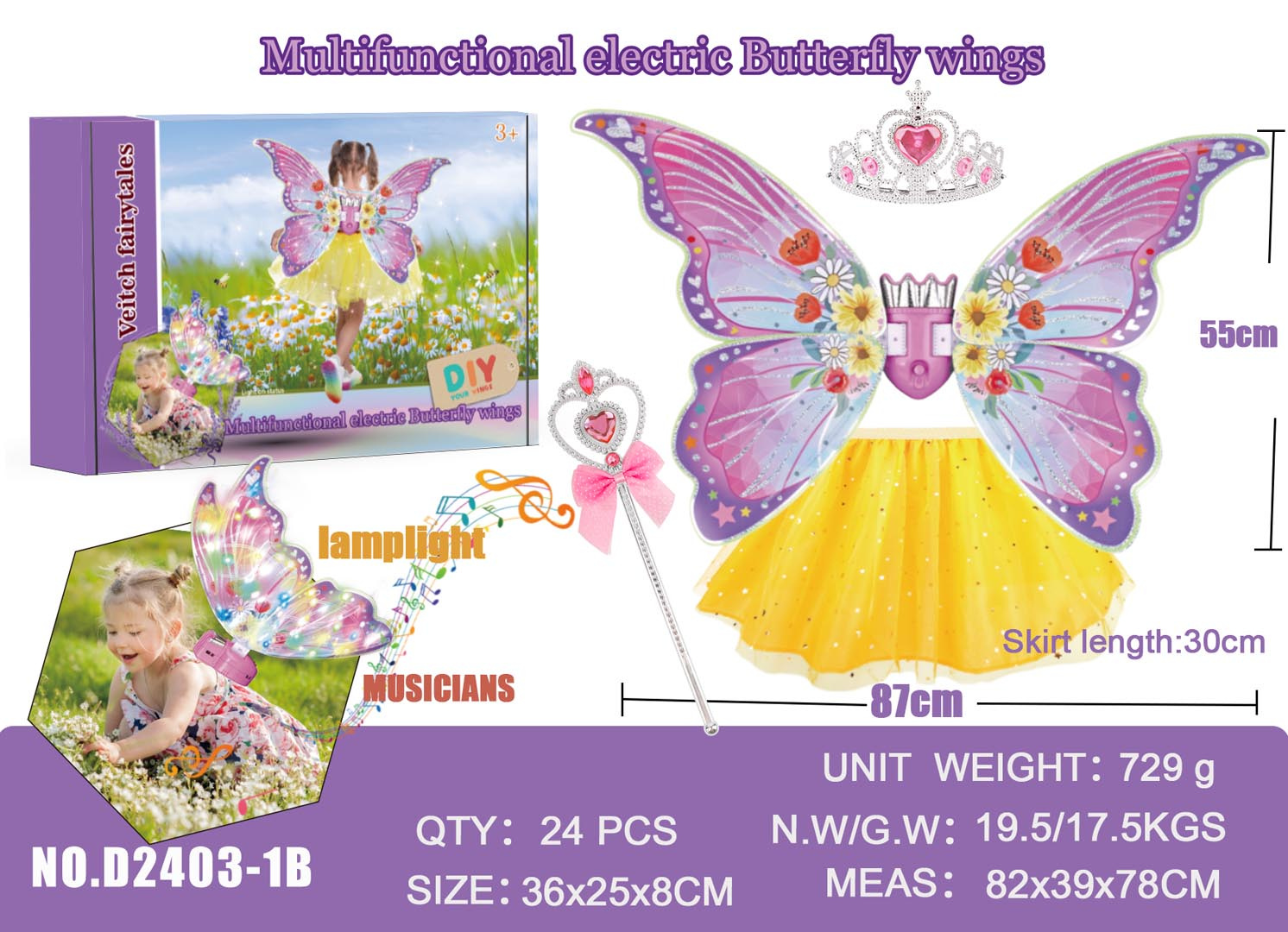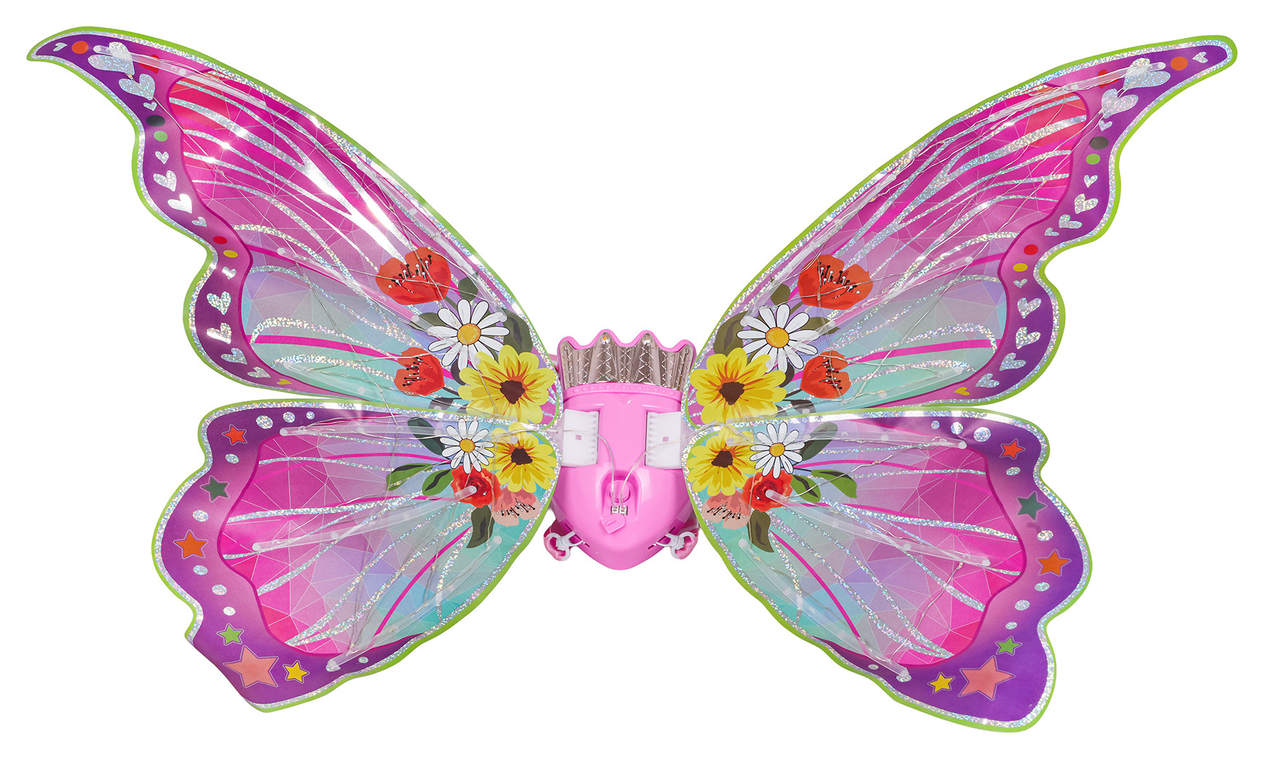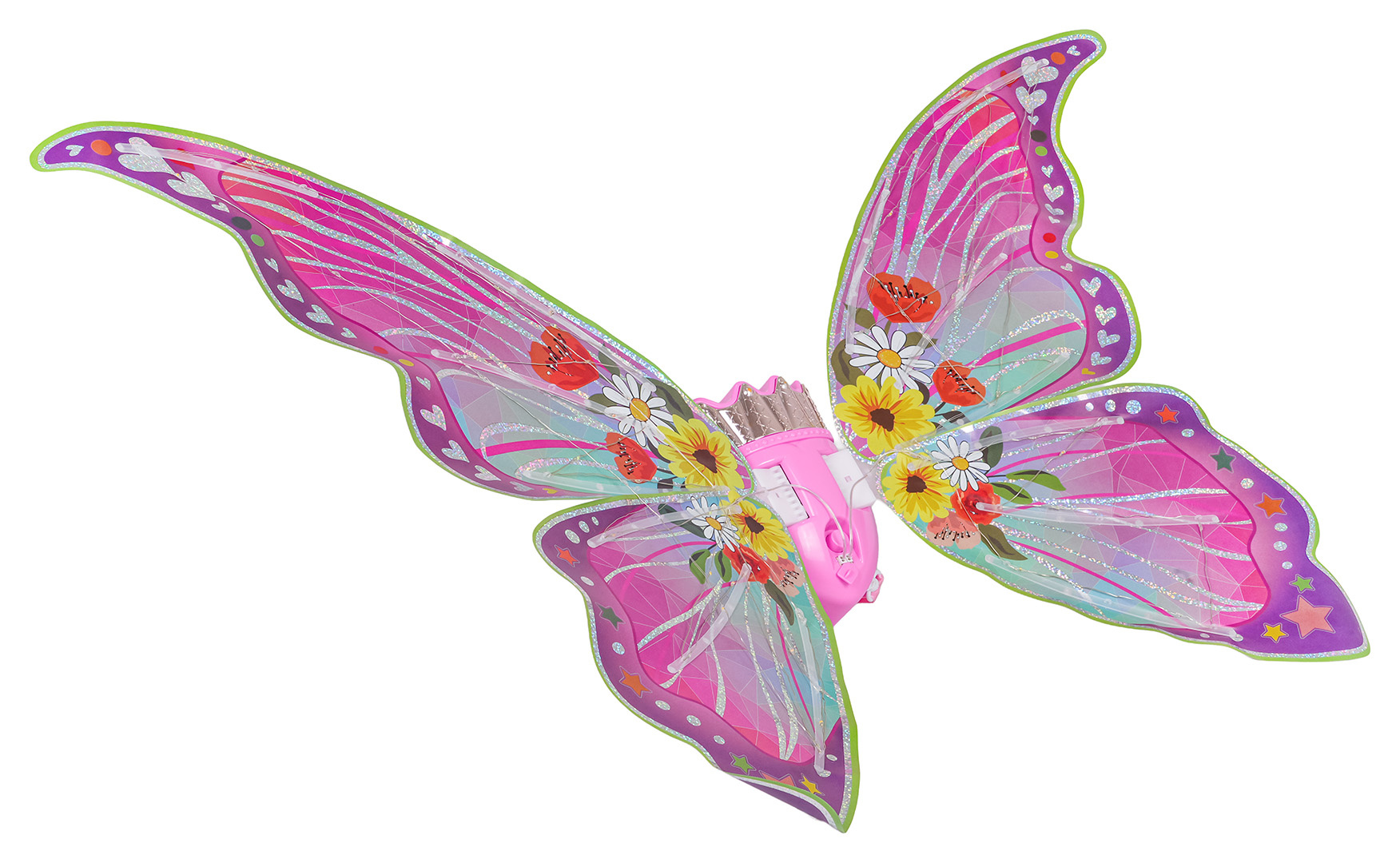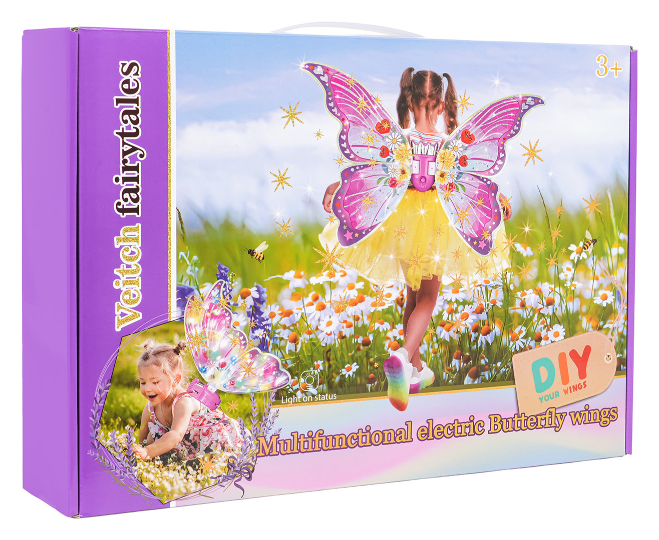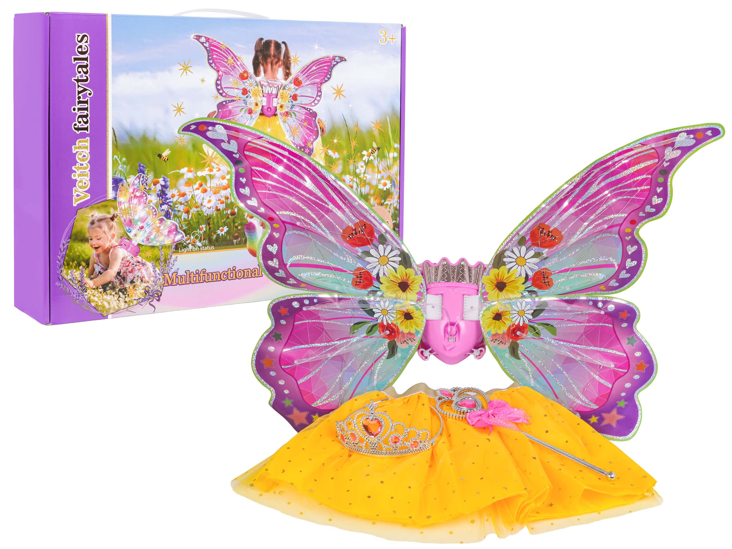 Báječný set, motýlí křídla, sukýnka, koruna, kouzelná hůlka pro děti od tří let. Sada byla vyrobena s důrazem na detaily, okouzluje bohatstvím barev. Vaše ratolest se bude cítit pohádkově a výjimečně v tomto kostýmu. Ideální sada na ples, představení nebo pro každodenní zábavu. Křídla jsou napájena bateriemi typu 4 x AA 1,5 V (nejsou součástí balení).