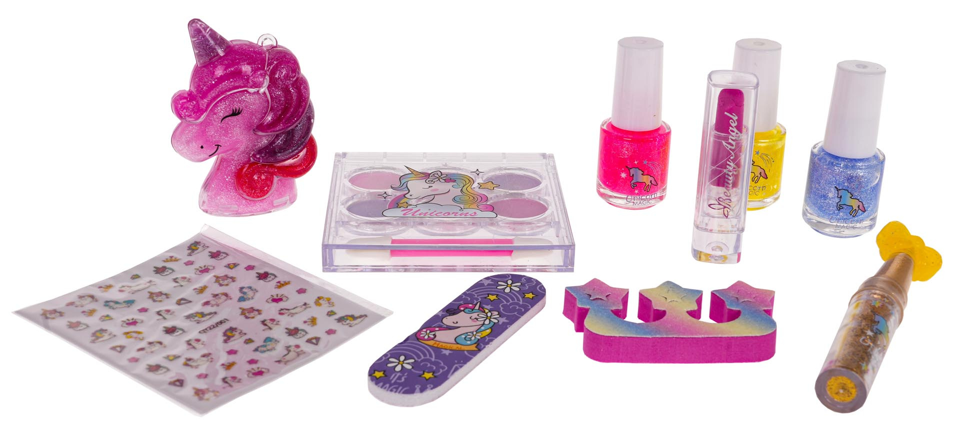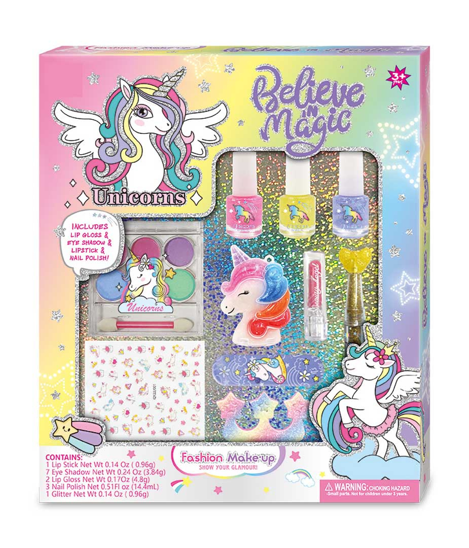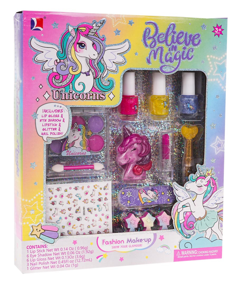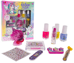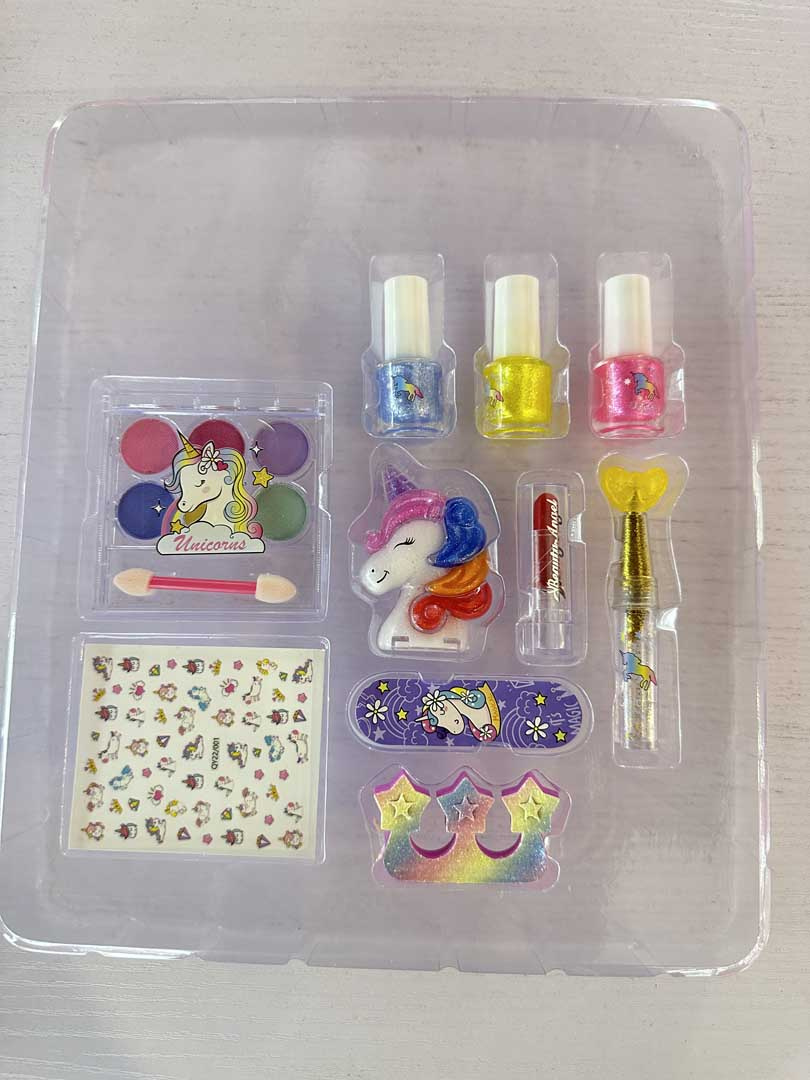 Sada na malování nehtů a obličeje s jednorožcem pro děti od 3 let. V sadě se nacházejí 3 třpytivé laky na nehty, rtěnka, aplikátor s třpytkami, pilník na nehty, oddělovač prstů, oční stíny se štětečkem, lesk na rty v krabičce ve tvaru jednorožce a nálepky na nehty. Všechny kosmetiky jsou bezpečné pro dítě a snadno se smývají.