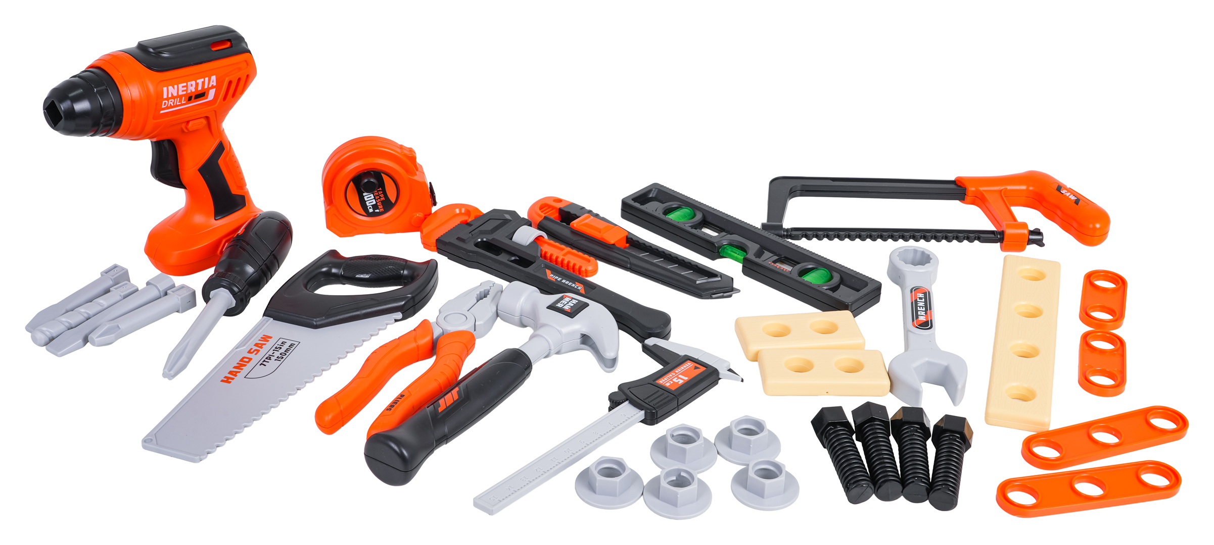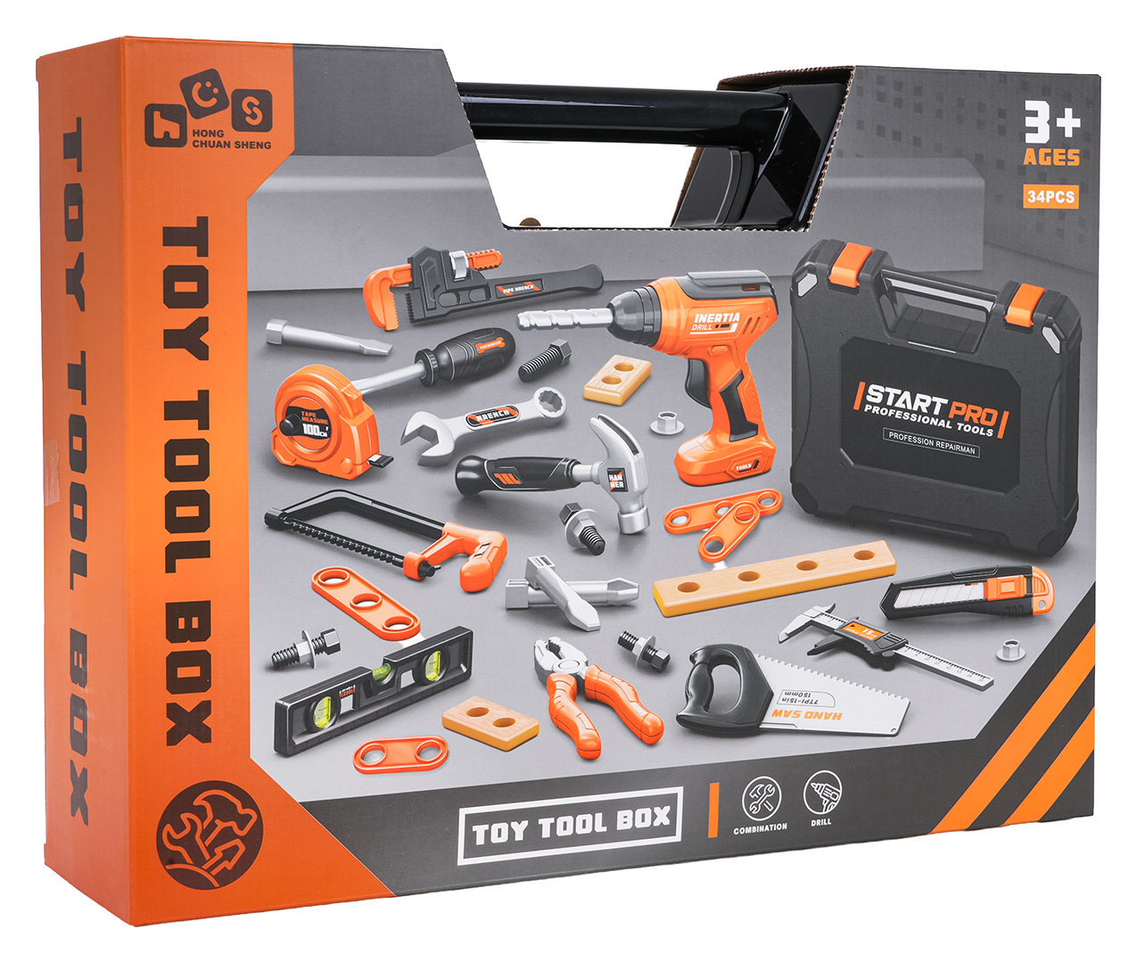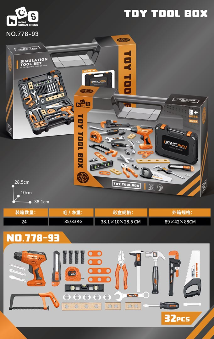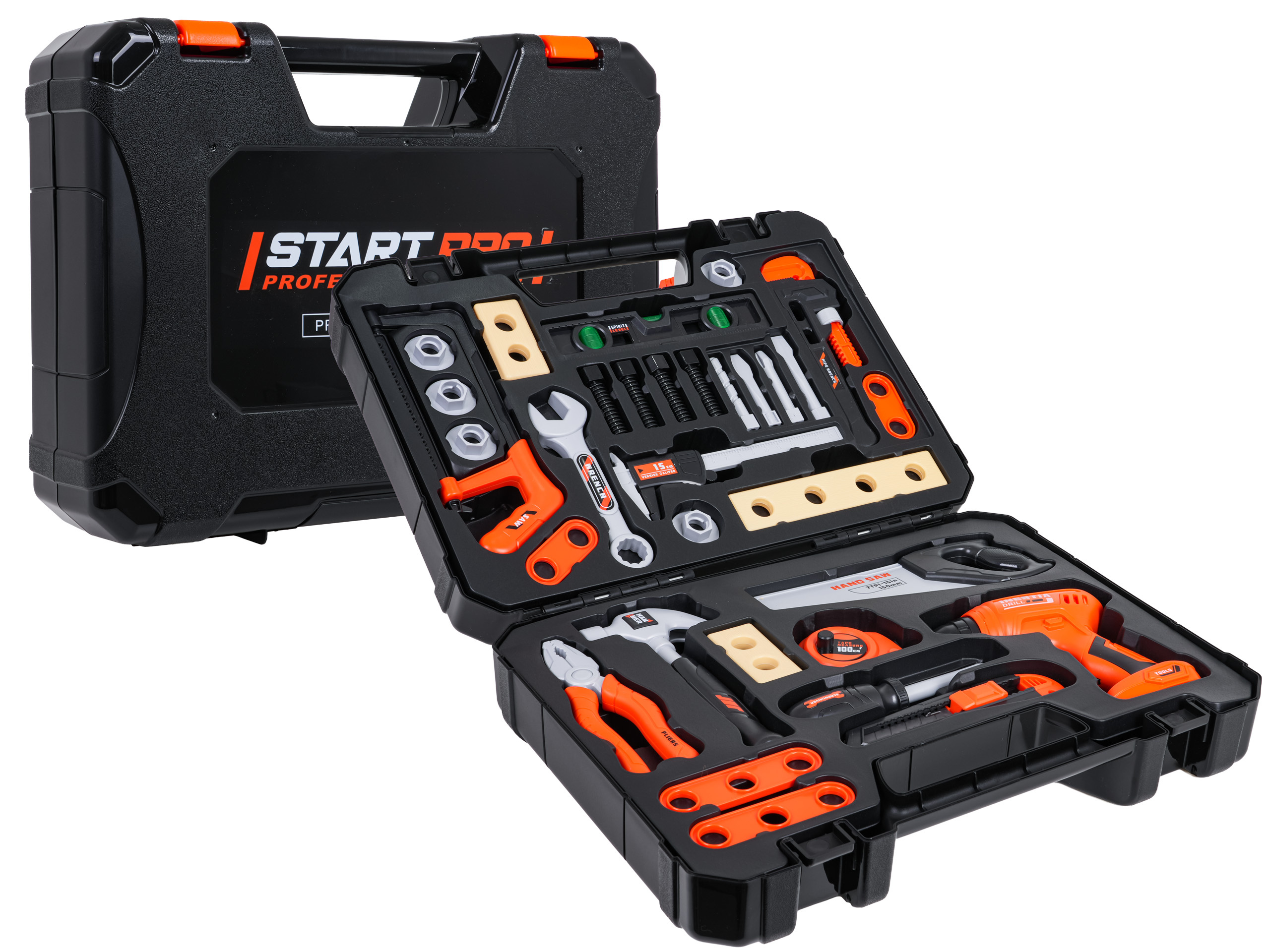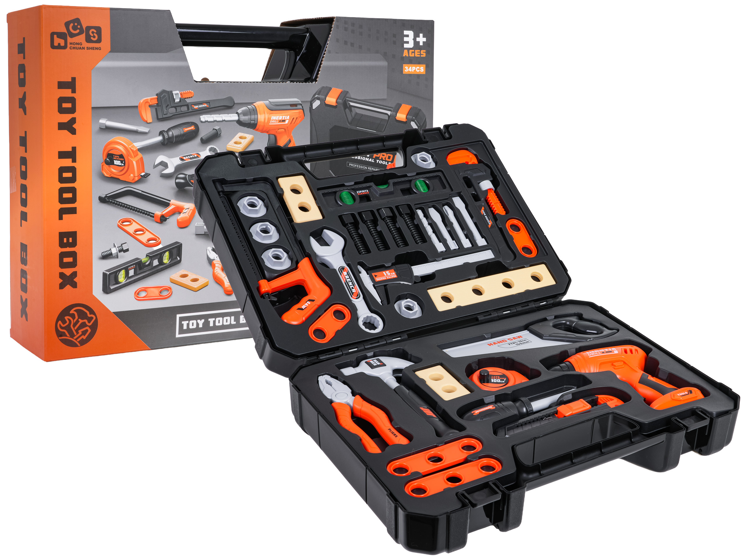Bohatě vybavená sada nástrojů s interaktivní vrtačkou a šroubovákem a nářaďovým boxem pro děti starší tří let. Sada byla vyrobena z nejkvalitnějšího plastu a obsahuje až 34 prvků. Kromě velké profesionálně vypadající skříňky na nářadí máme v sadě také: vrtačku-šroubovák s vyměnitelnými bity, posuvné měřítko, klíč na šrouby, metr, šroubovák, kladivo, ruční pilu, kleště a mnoho šroubků, nástavců, dřevěných špalíků na šroubování.