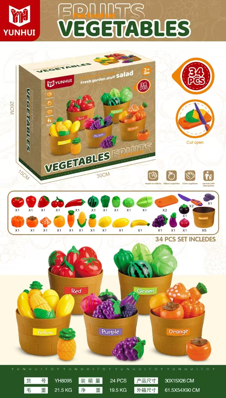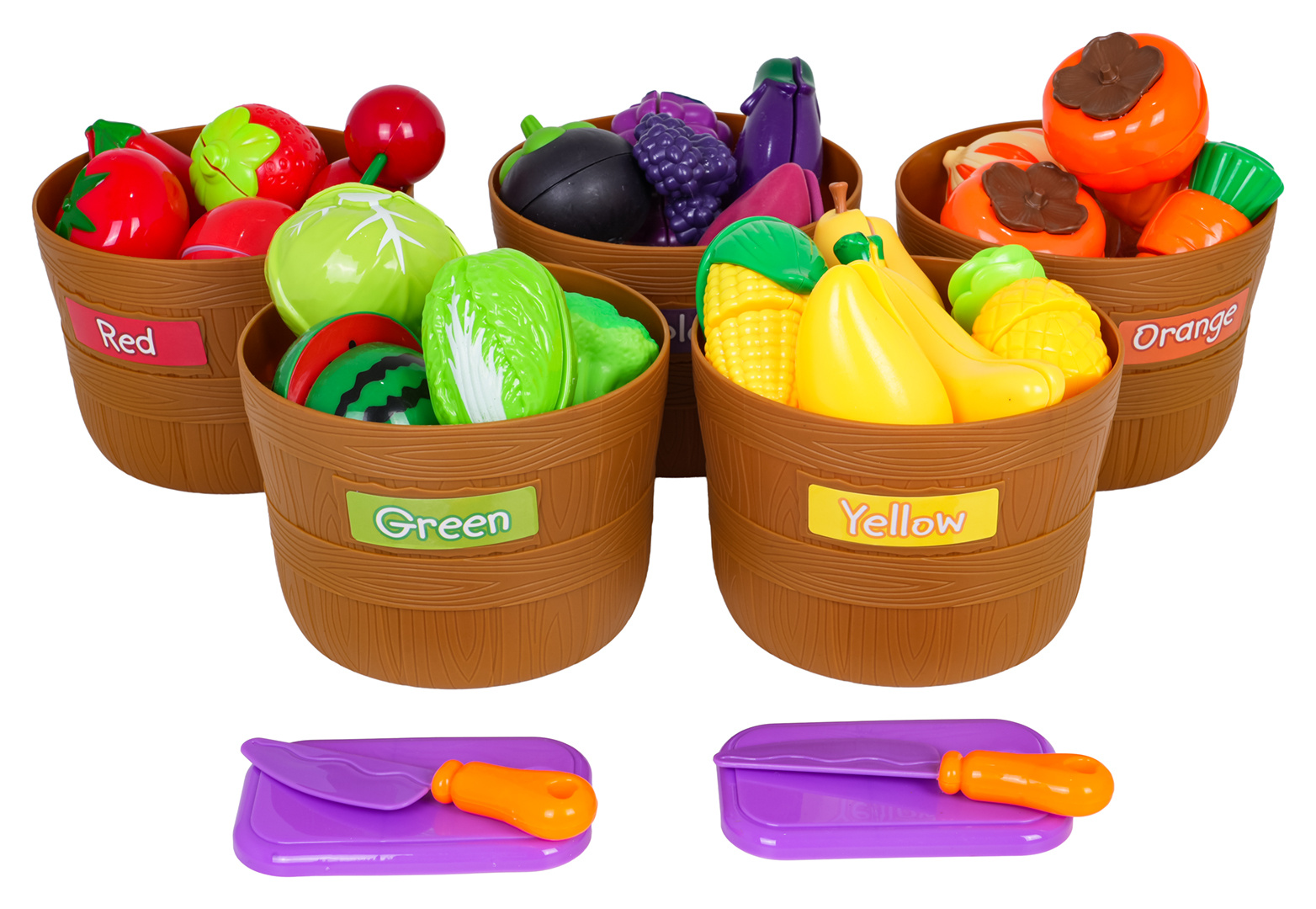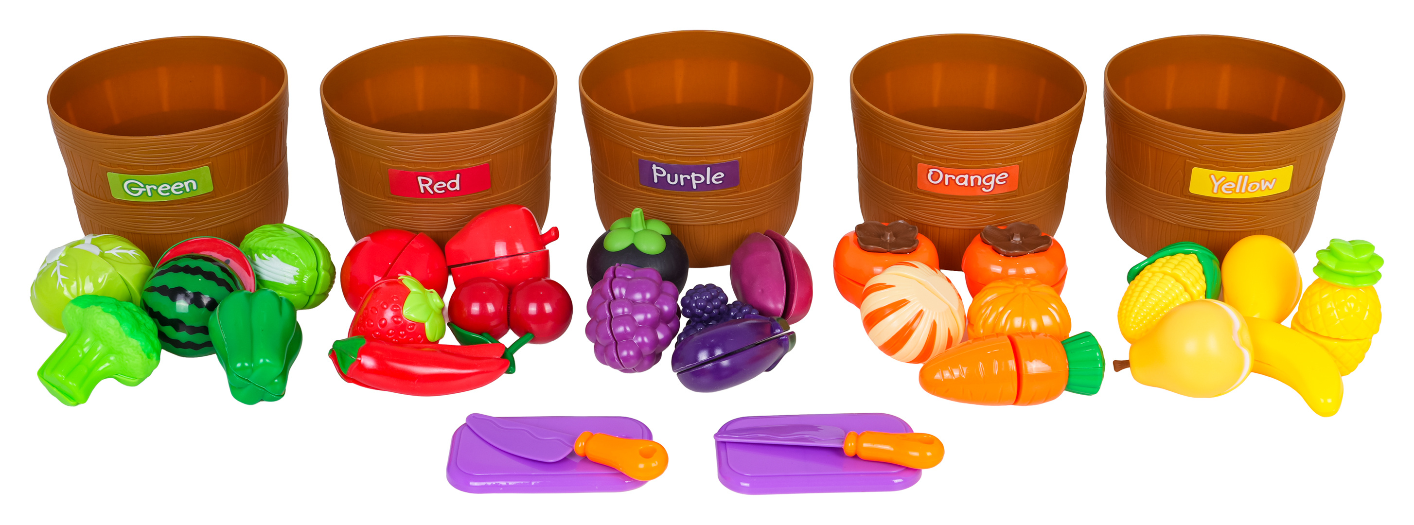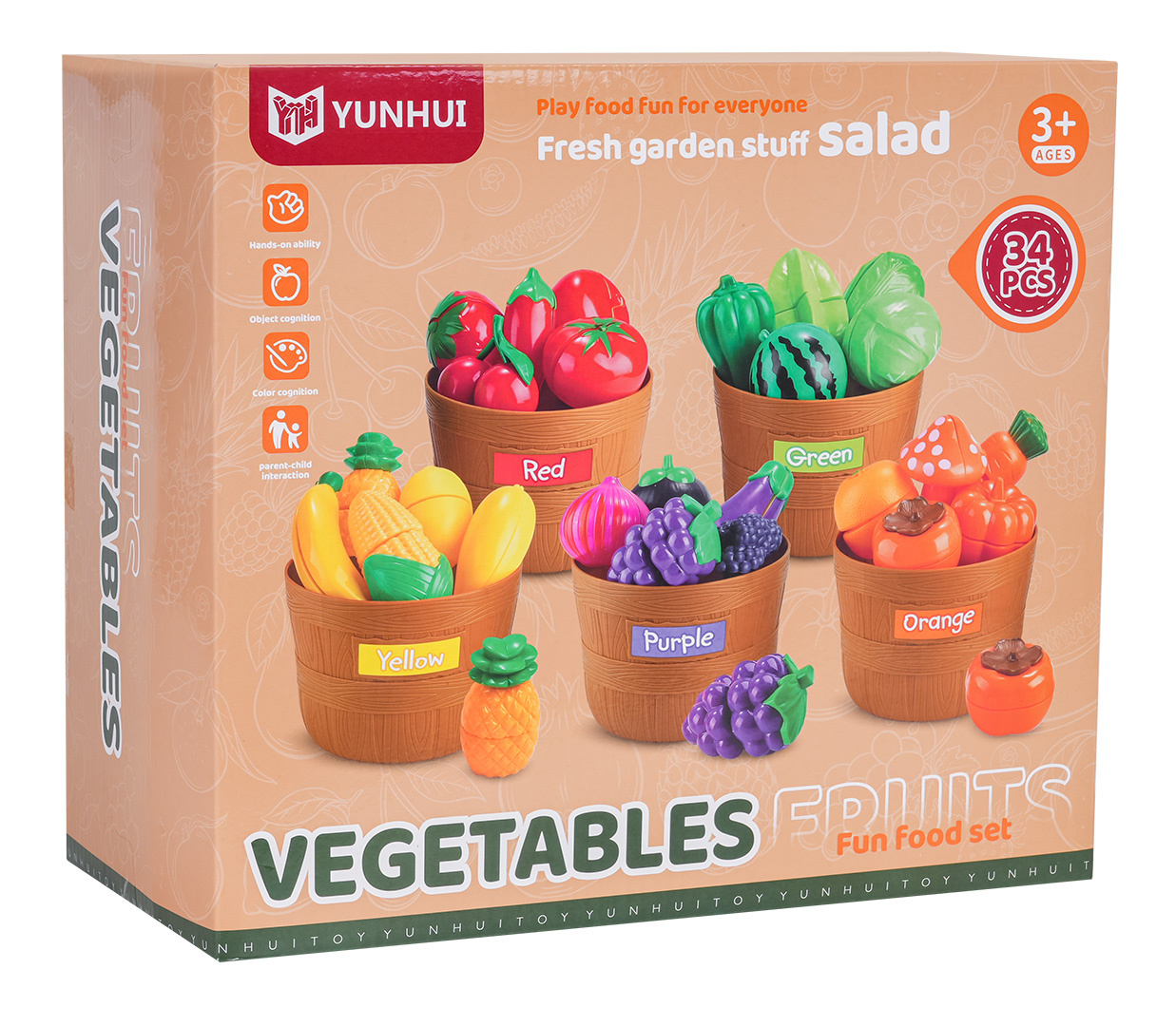 Barevná, bohatě vybavená sada ovoce a zeleniny pro děti od tří let. Prvky sady byly vyrobeny z nejkvalitnějšího plastu a bohatství barev přitahuje pozornost dítěte. V sadě se nachází až 34 prvků: zelenina, ovoce na suchý zip, koše na třídění ovoce a zeleniny, nože a prkénka na krájení.