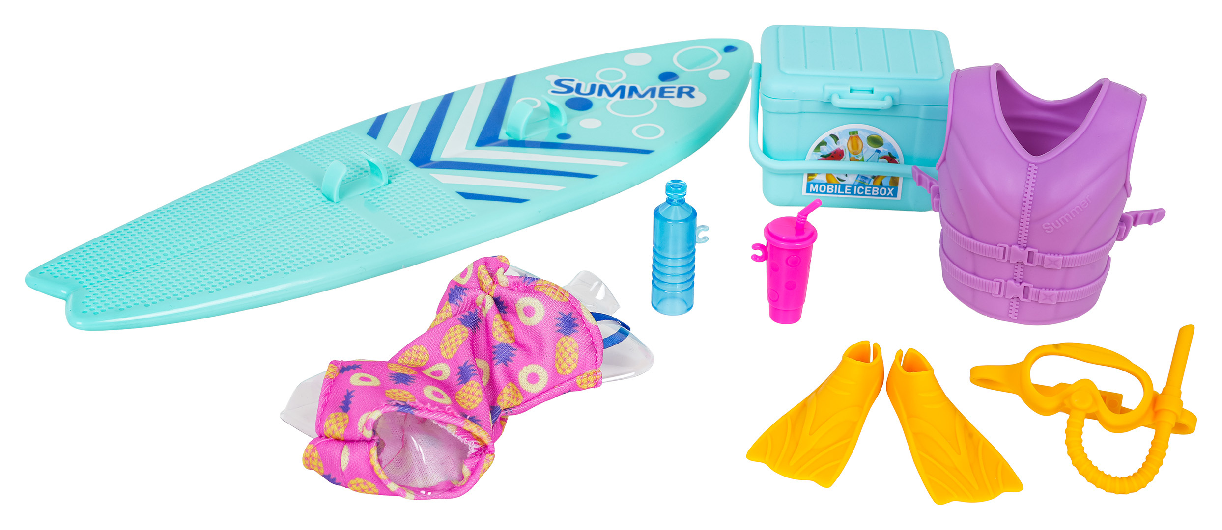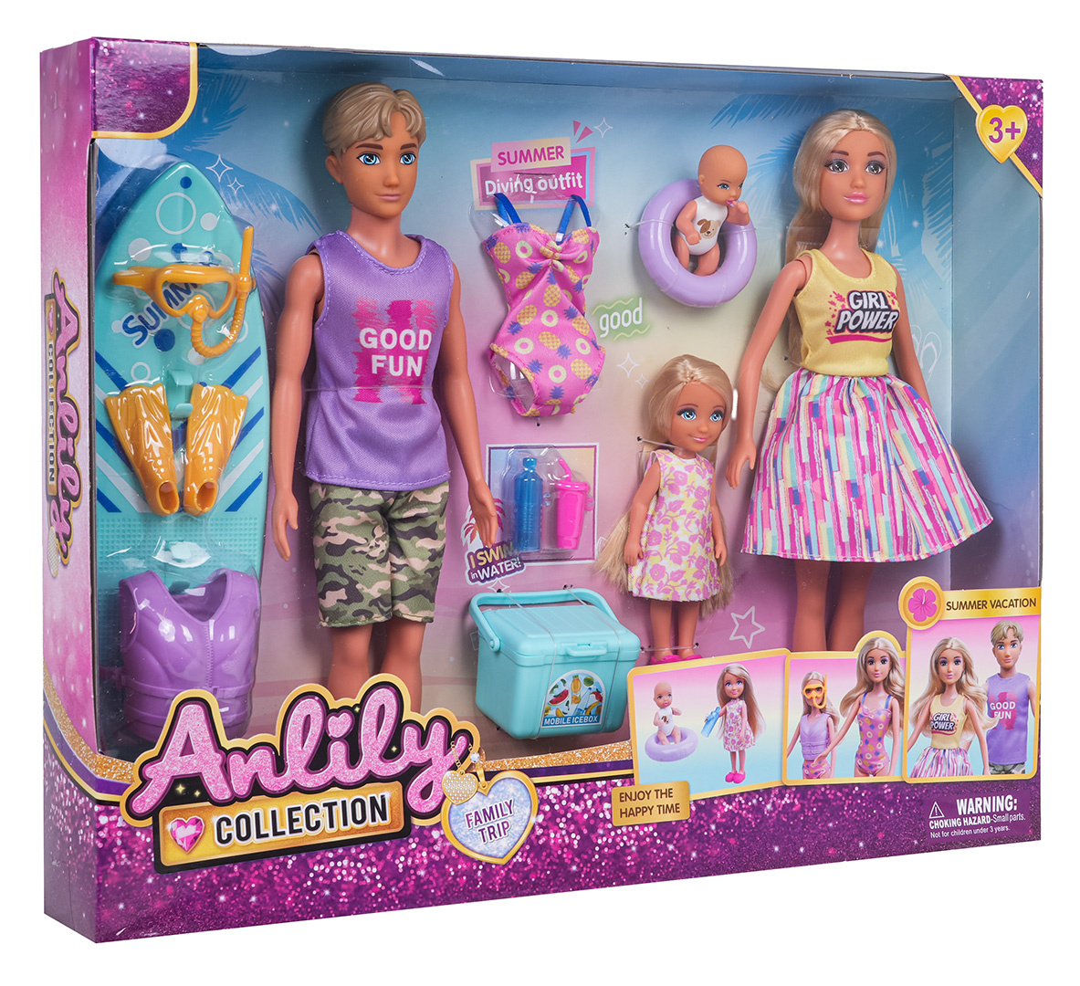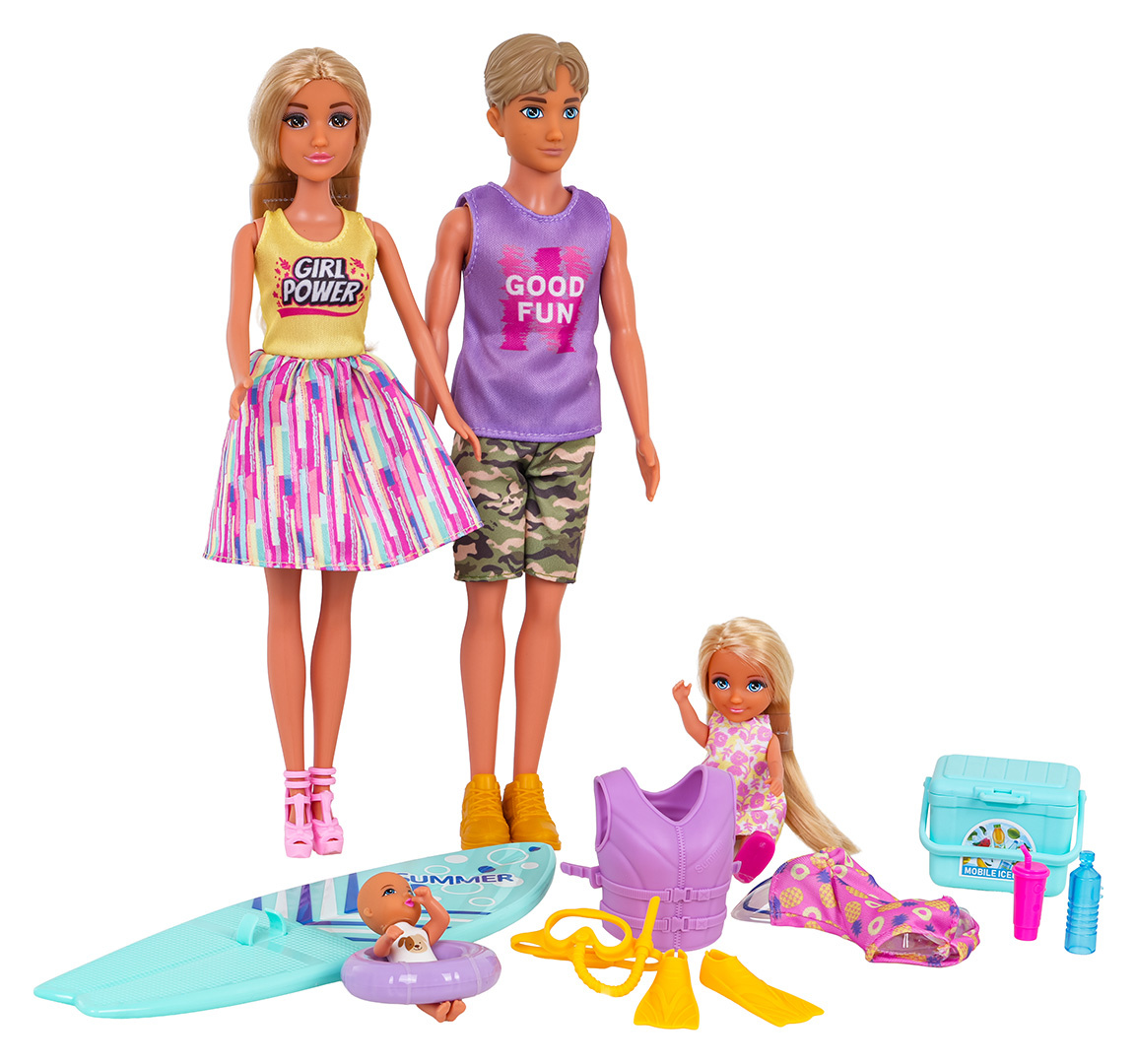 Sada panenek a doplňků z řady na prázdniny pro děti od tří let. Všechny prvky sady jsou vyrobeny z nejkvalitnějších materiálů s důrazem na detaily. V sadě můžeme najít panenku maminku, panenku tatínka, panenku dceru a panenku miminko. Ke panenkám byly přiloženy následující doplňky: surfovací prkno, kyslíková maska na potápění, ploutve na potápění, ochranná vesta, plavky, chladicí box, 2 nádoby na nápoje, plavecký kruh. S touto sadou zábava nikdy nekončí.