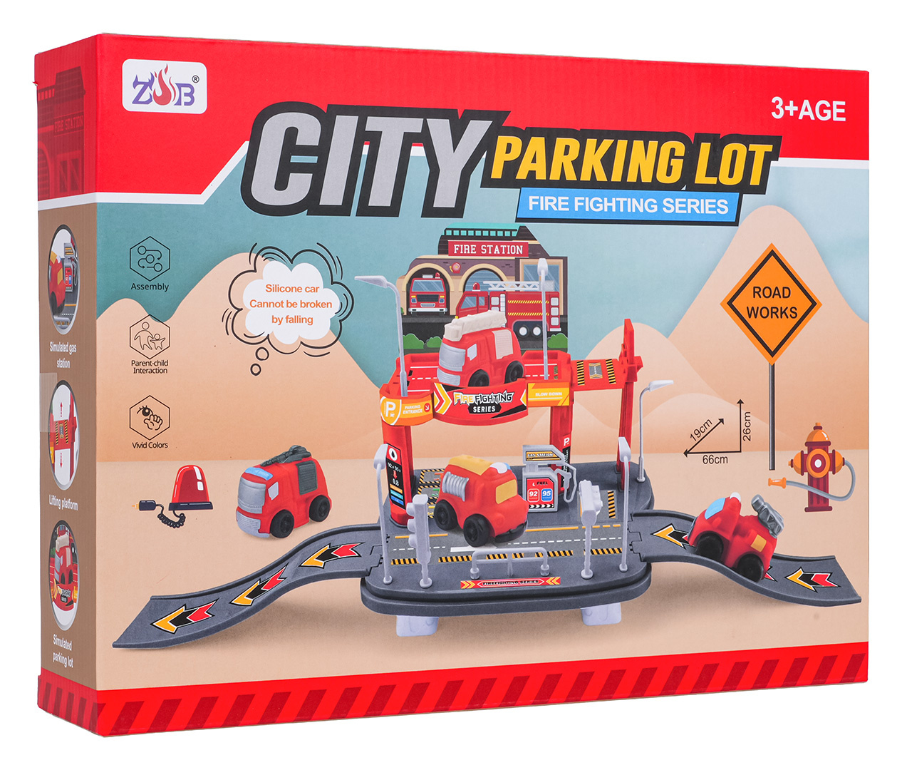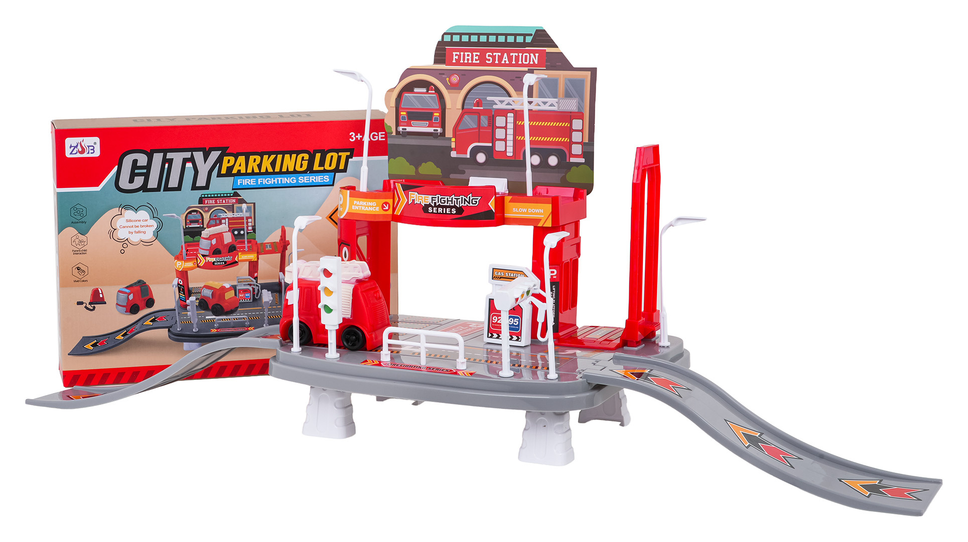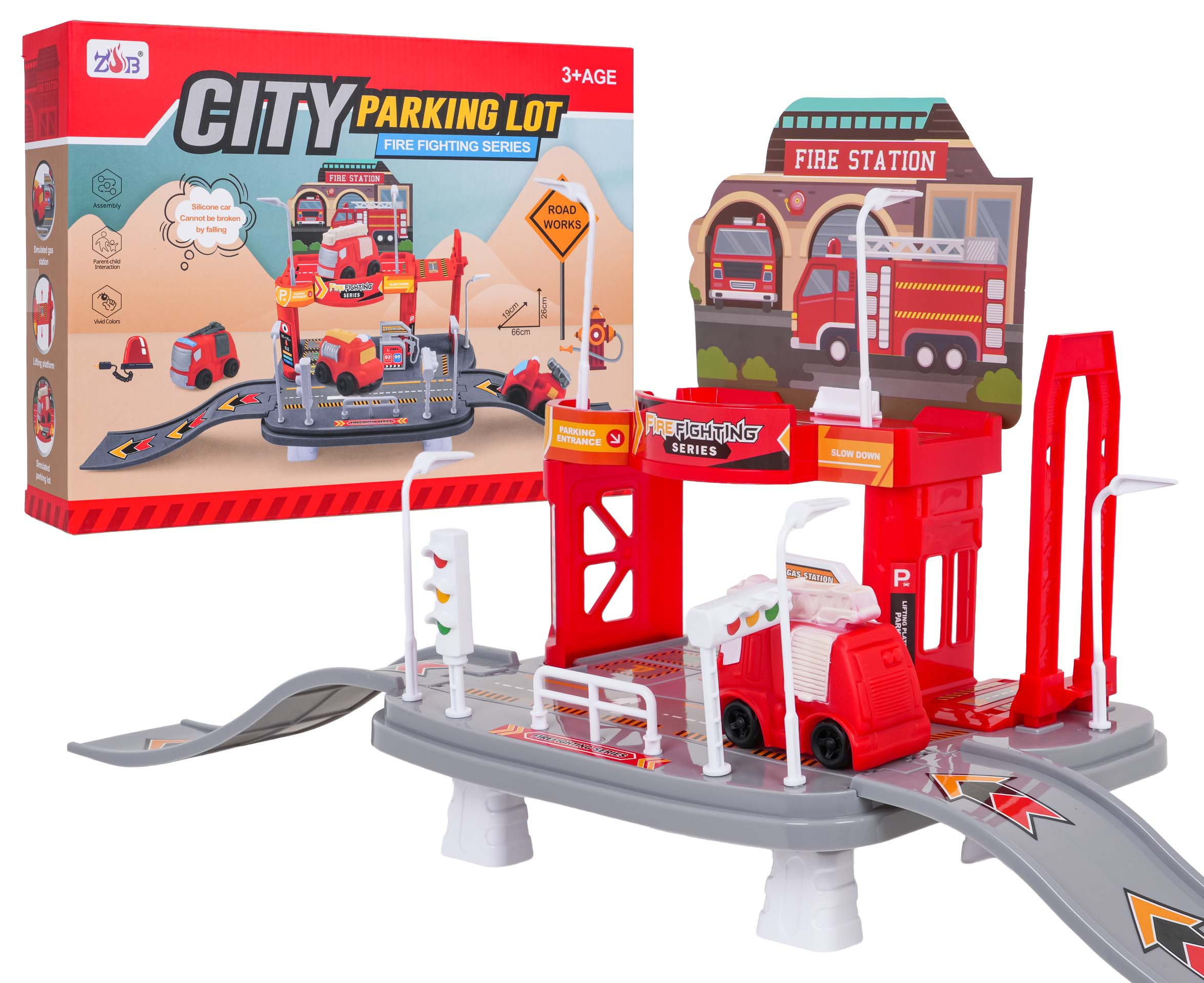 Sada parkoviště Hasičského sboru s hasičským vozidlem je určena pro děti od tří let. Sada se skládá z 25 prvků vyrobených z nejkvalitnějších materiálů v živých barvách. Autíčko bylo vyrobeno ze silikonu. Parkoviště je dvoupatrové, v prvním patře se nachází parkoviště, ze kterého můžeme sjet výtahem do přízemí (manuálně). Přízemí obsahuje čerpací stanici, silnici se značkami a vjezd a výjezd ve formě skluzavky. Sada ideální pro malé milovníky hasičů.