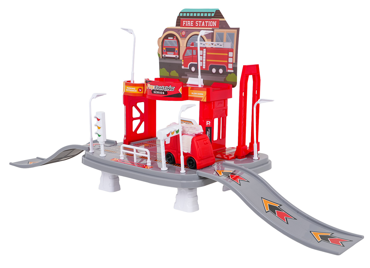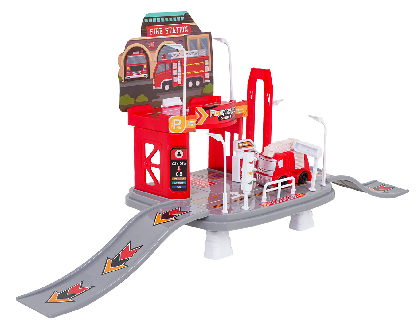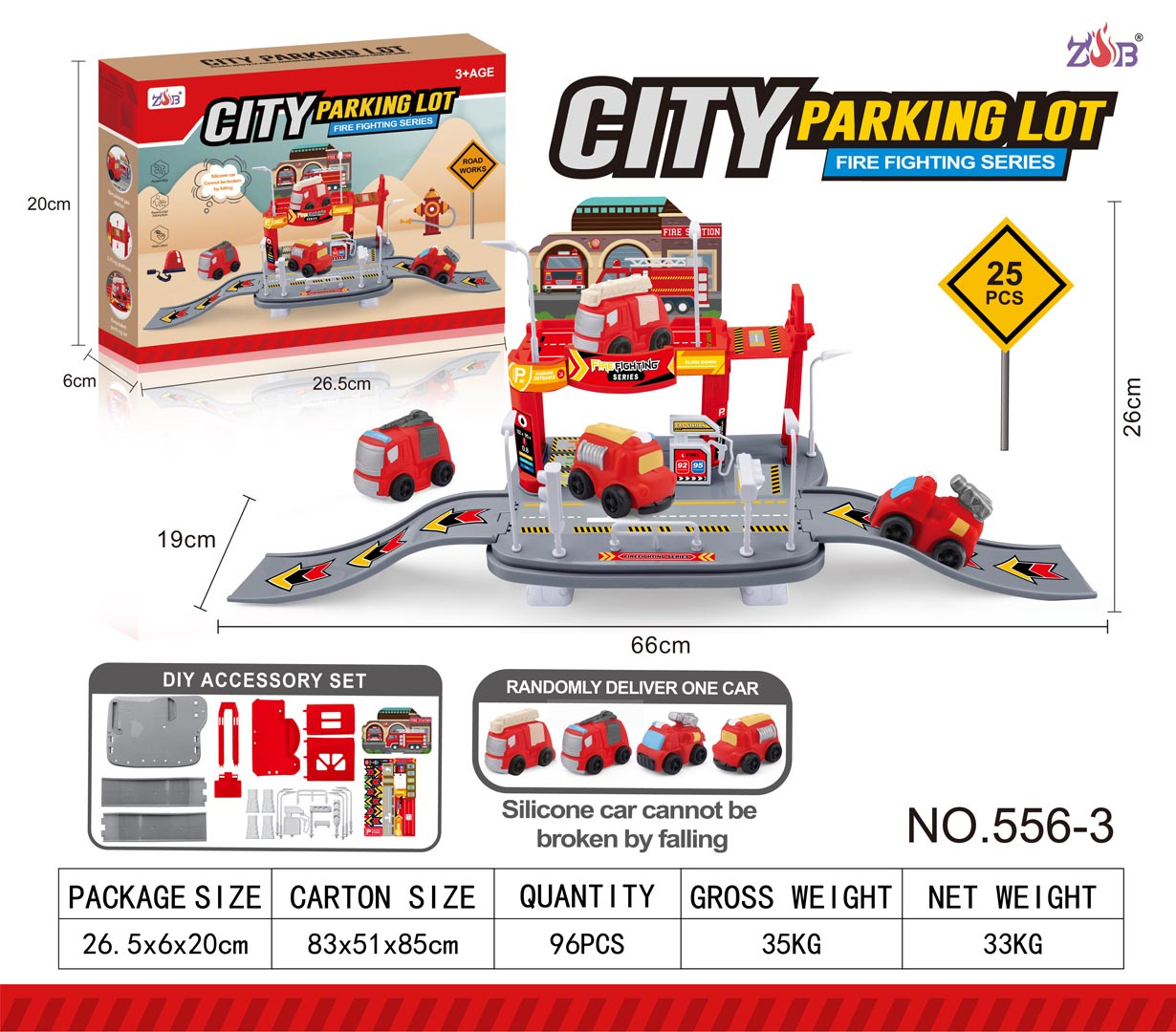 Sada parkoviště Hasičského sboru s hasičským vozidlem je určena pro děti od tří let. Sada se skládá z 25 prvků vyrobených z nejkvalitnějších materiálů v živých barvách. Autíčko bylo vyrobeno ze silikonu. Parkoviště je dvoupatrové, v prvním patře se nachází parkoviště, ze kterého můžeme sjet výtahem do přízemí (manuálně). Přízemí obsahuje čerpací stanici, silnici se značkami a vjezd a výjezd ve formě skluzavky. Sada ideální pro malé milovníky hasičů.