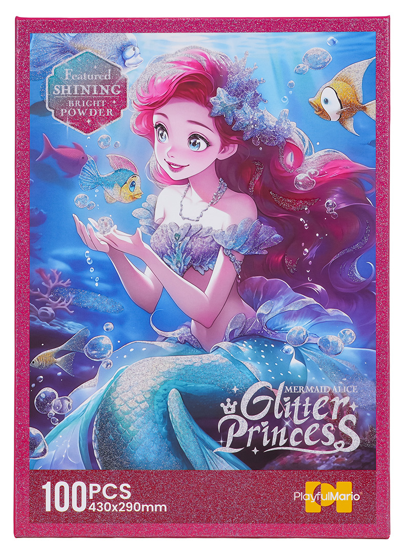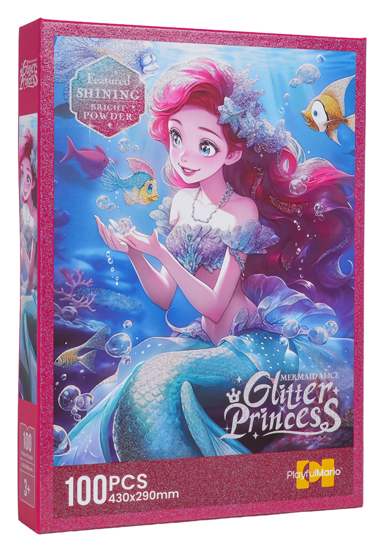 Sada puzzle 100 dílků s mořskou pannou pro děti od tří let. Po složení vznikne obrázek s prvky třpytu o rozměrech 43 cm x 29 cm. Skládání puzzle nás učí koncentraci a také zaměření na jednu věc. Umožňuje nám se odreagovat, zapomenout na problémy. Puzzle nás učí logickému myšlení, rozpoznávání tvarů a příznivě ovlivňují naši vizuální paměť.