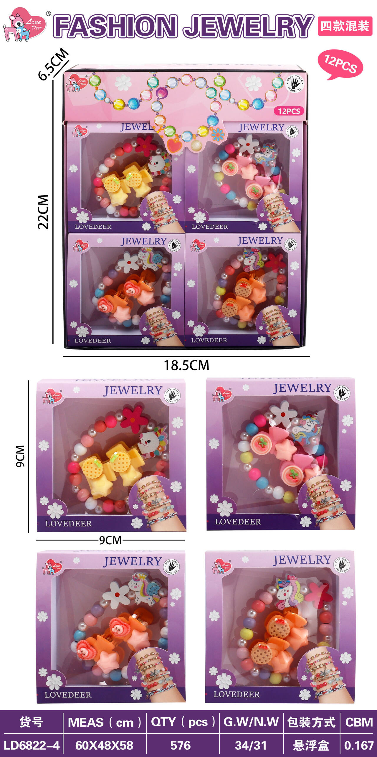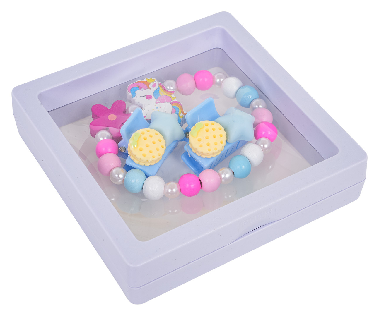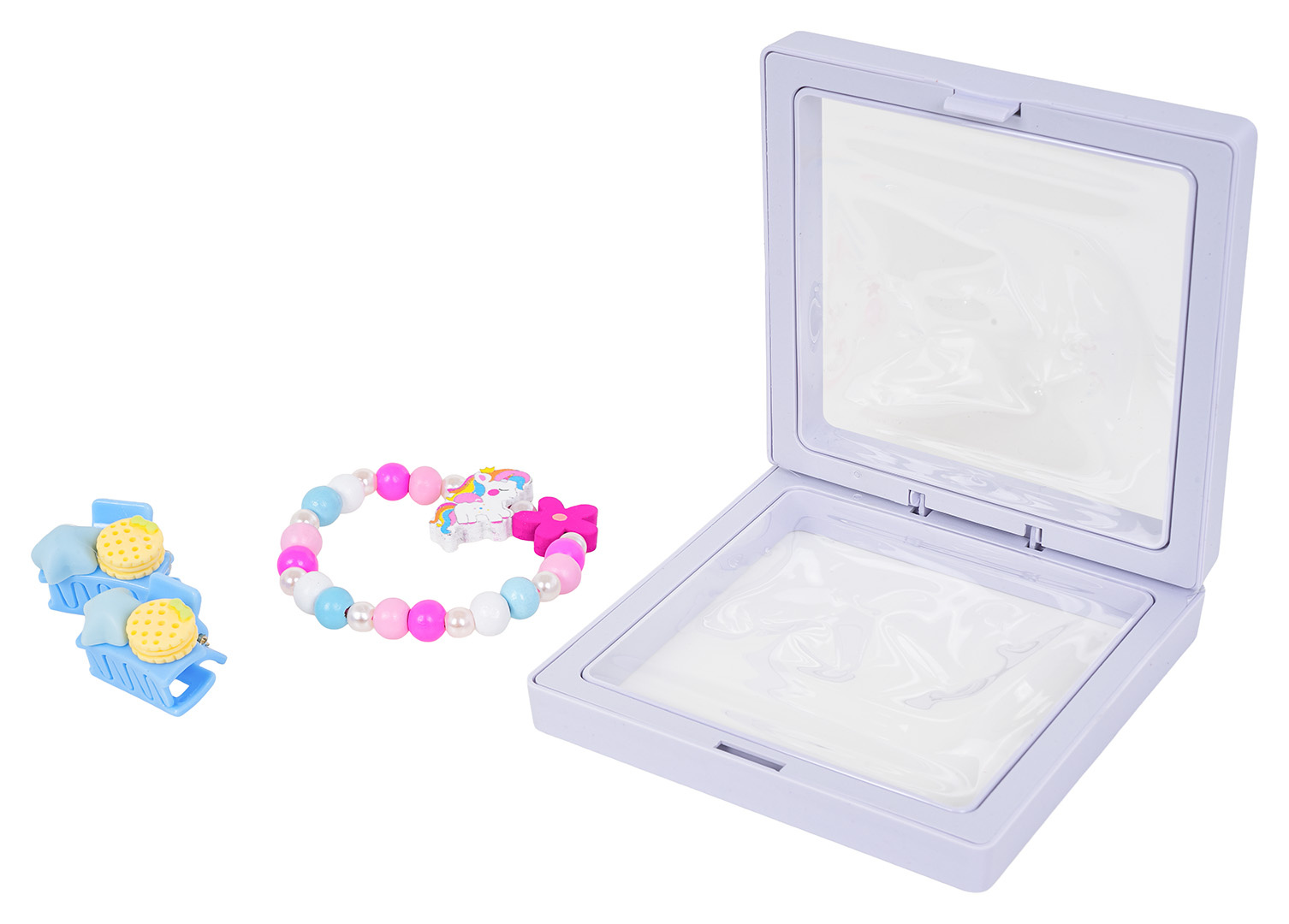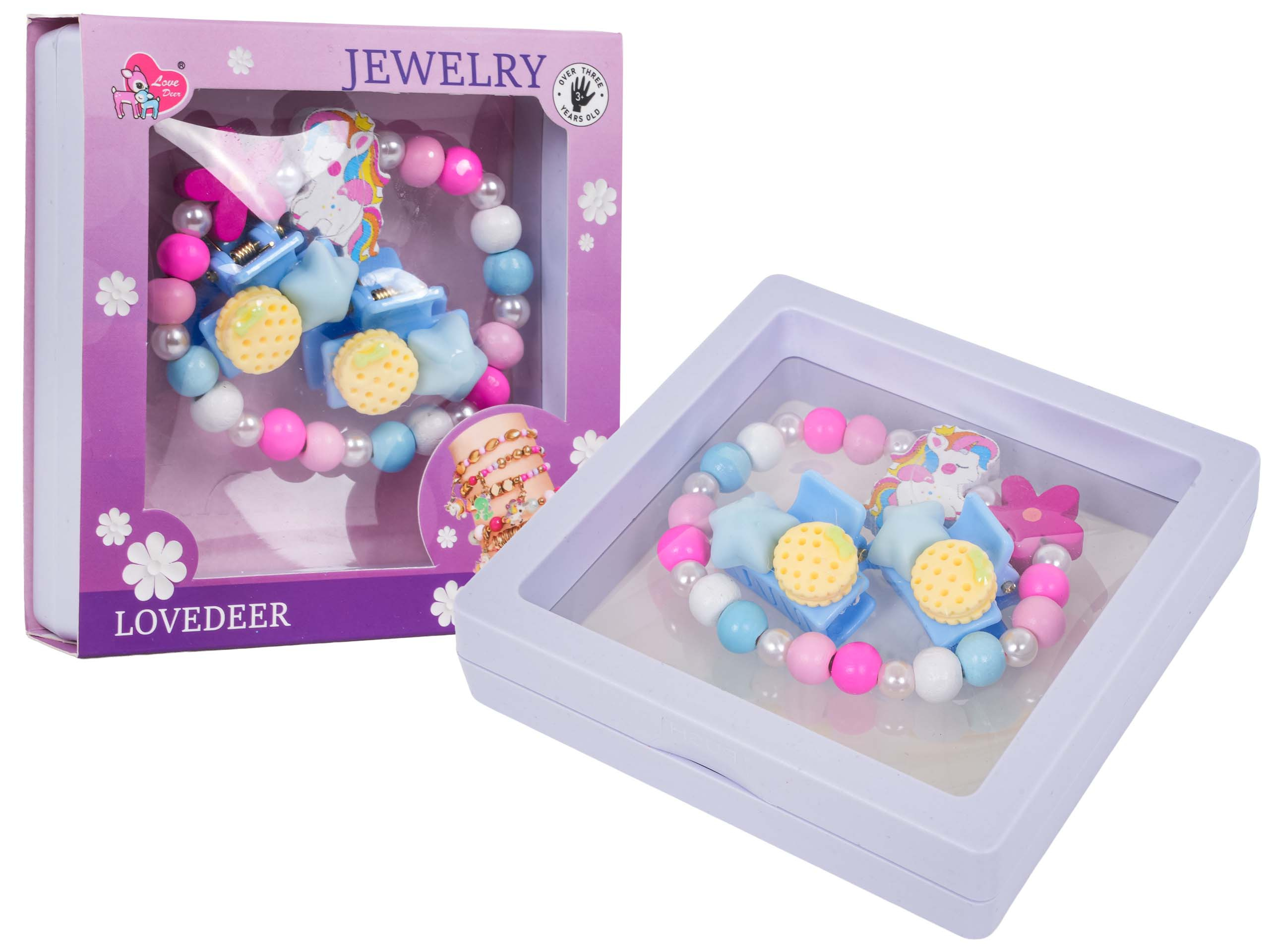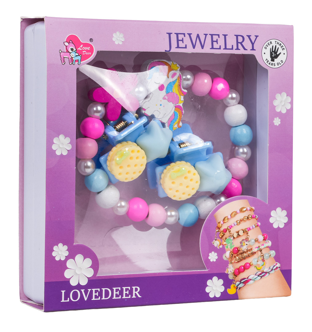 Sada šperků s jednorožcem pro děti od tří let. Sada se skládá z krásného náramku vyrobeného z různobarevných dřevěných korálků, perliček a prvku s jednorožcem, a také ze dvou sponek. Sada byla vyrobena s důrazem na detaily v živých barvách.