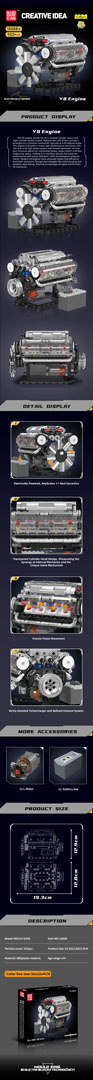 Vysoce kvalitní stavební kostky Mould King pro děti od čtrnácti let. Sada se skládá z 552 prvků, ze kterých lze postavit repliku osmiválcového benzínového motoru V8. Tento skvělý model jistě upoutá pozornost svými detaily. Pohyblivé prvky mu dodávají na realističnosti. Průhledná konstrukce hlavy válců umožňuje pozorovat vnitřní mechanismy: ventilový systém, precizní pohyb pístu, detailní turbodmychadlo a výfukový systém. Sada je vybavena motorkem L a boxem na baterie 6 x AAA 1,5V (baterie nejsou součástí sady).