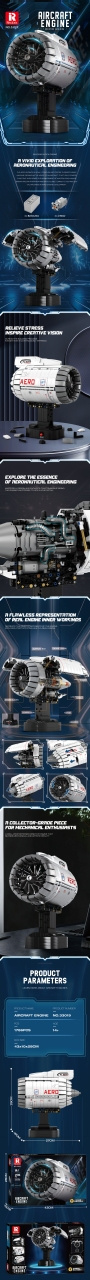 Vysoce kvalitní stavební kostky pro děti od čtrnácti let. Sada se skládá z 1786 prvků, ze kterých lze postavit letecký motor. Tento skvělý model jistě upoutá pozornost svými detaily. Motor má otevíratelný kryt, pod kterým můžeme obdivovat realistické pohyby práce motoru a otáčející se lopatky turboventilátoru. Sada je vybavena akumulátorem 7,4V, krabička na baterie vyžaduje použití šesti baterií typu AAA 1,5V (nejsou součástí balení).