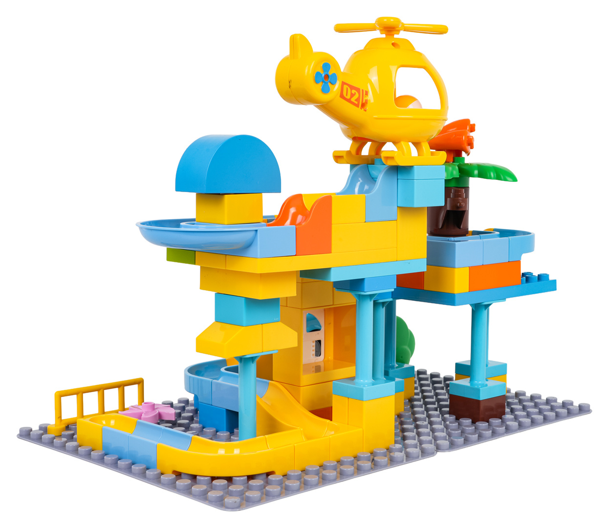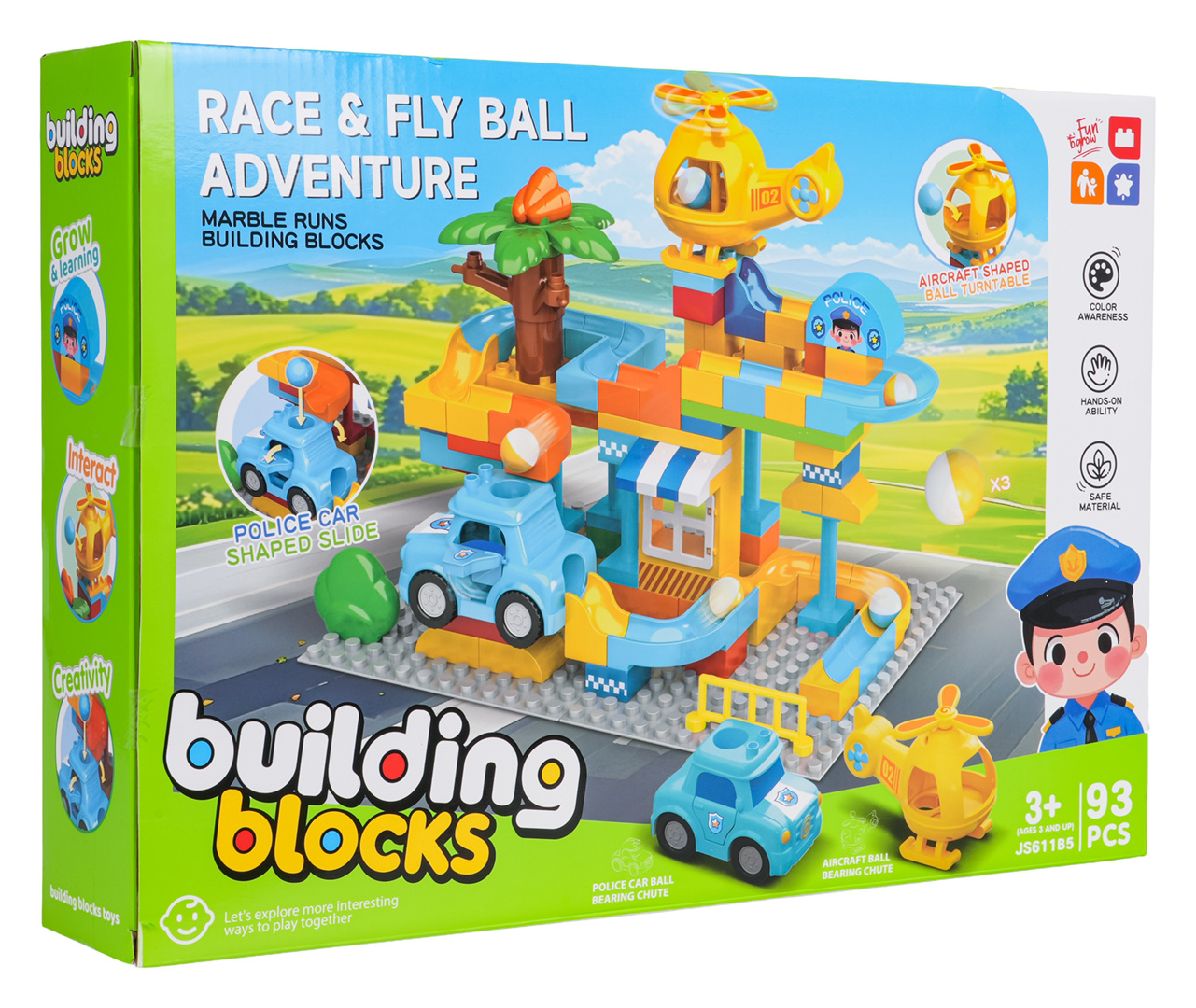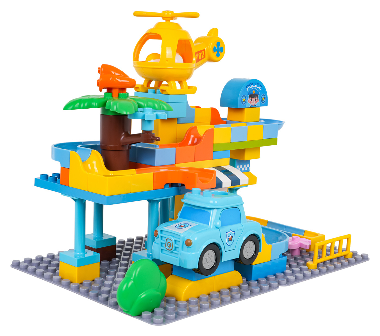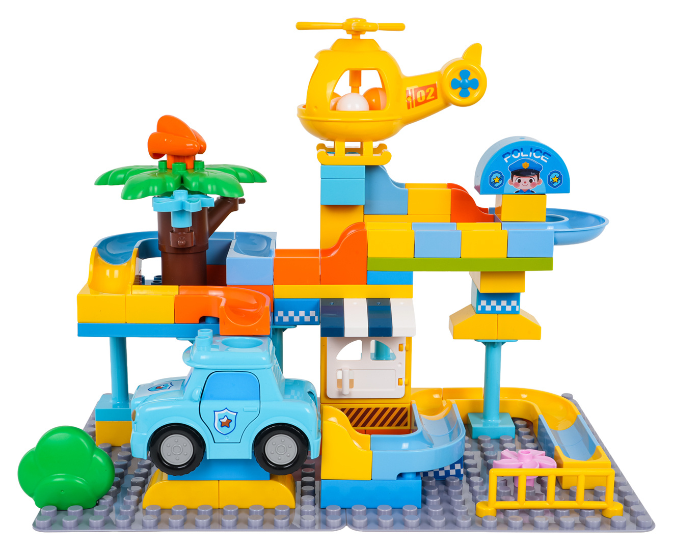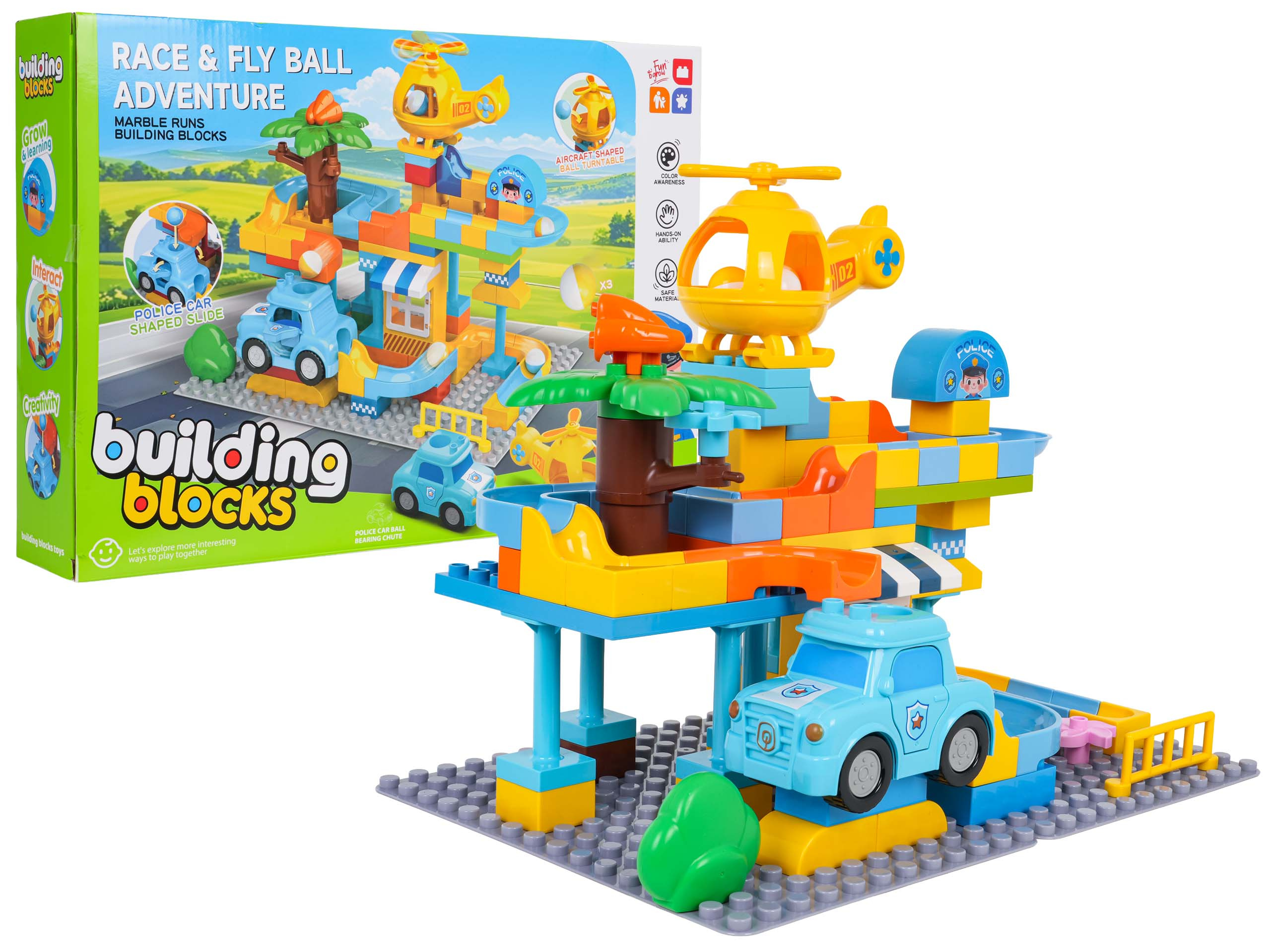 Sada velkých, barevných kostek umožňující postavit policejní stanici pro děti od tří let. Kloce se velmi snadno spojují a vytvářejí stabilní konstrukce. Bohatství barev povzbuzuje dítě ke kreativní hře. V sadě máme také skluzavku, autíčko, helikoptéru a tři míčky. Helikoptéra a policejní autíčko mají otvor umožňující prolétání míčku. Sada ideální pro kreativní zábavu.