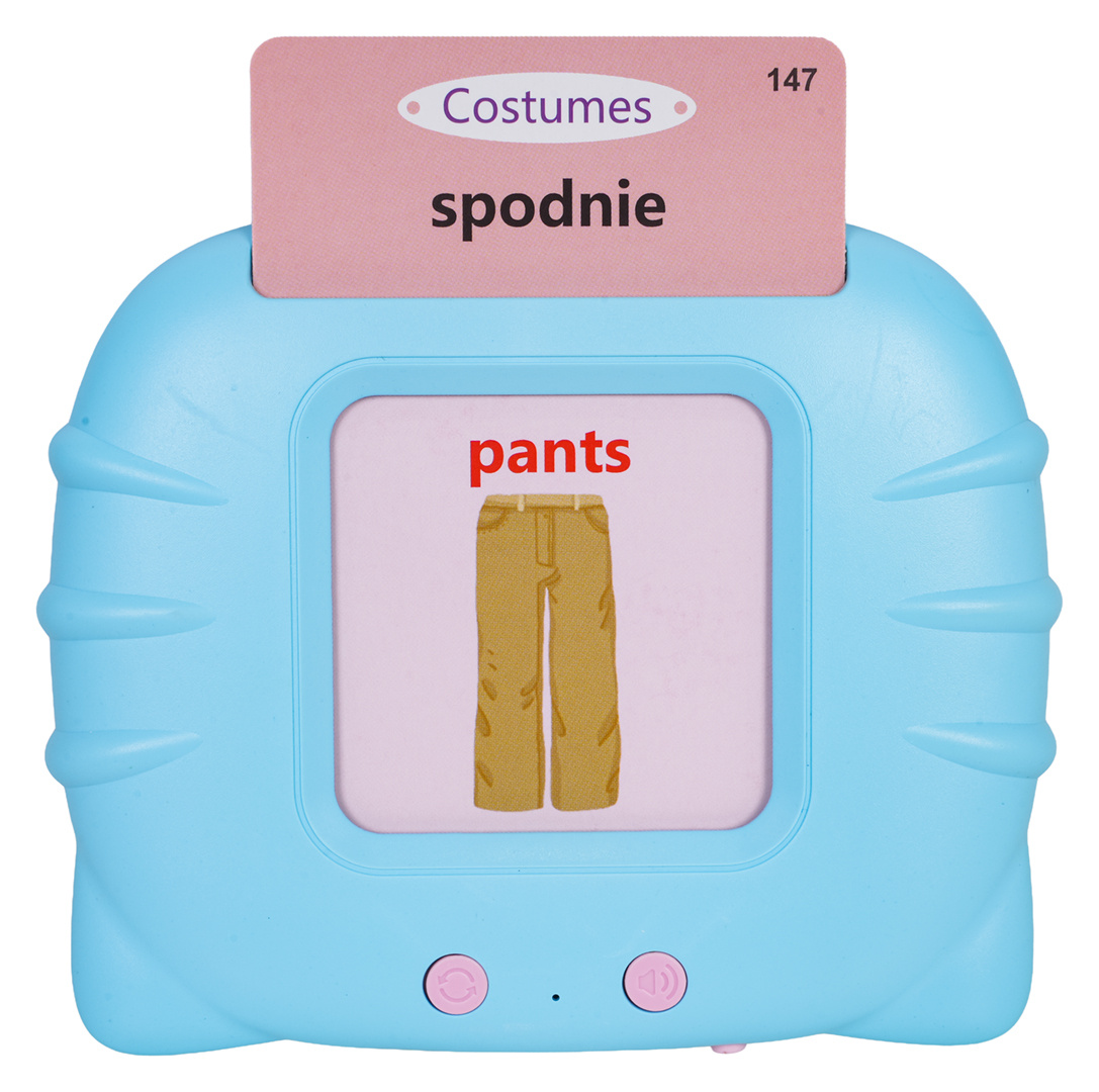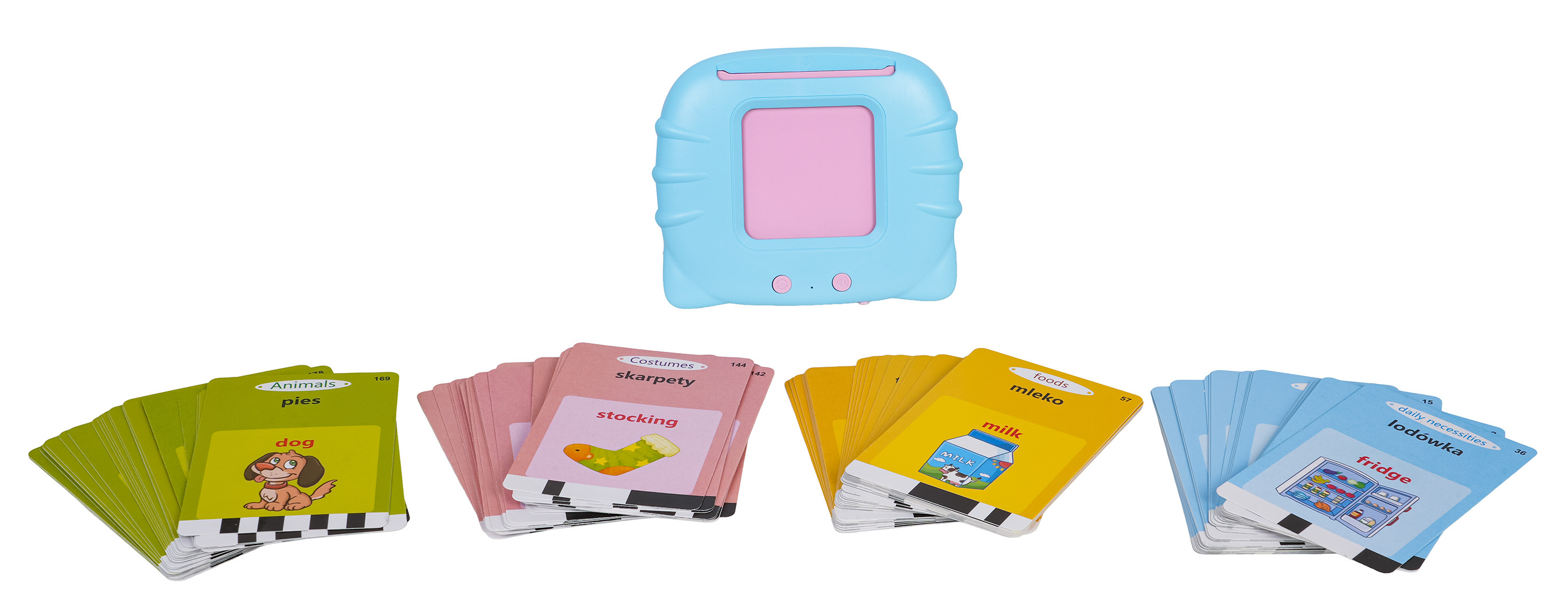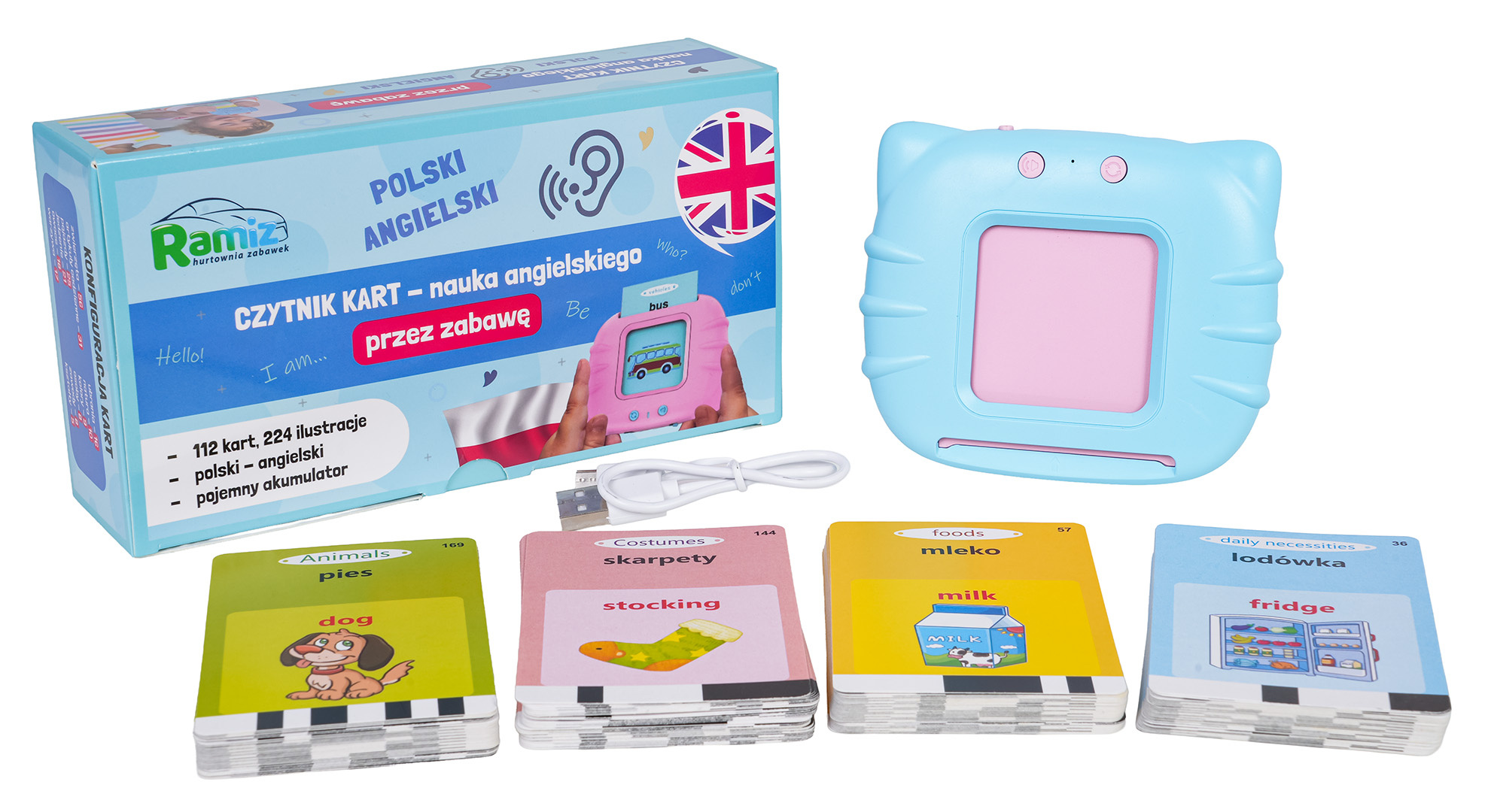 Vzdělávací čtečka karet v anglicko-polské jazykové verzi, pro děti od tří let. Skvělá zábava a učení jednoduchým a zajímavým způsobem. Sada obsahuje 112 oboustranných karet se slovíčky a obrázky a čtečku karet. Dítě vkládá kartu do čtečky a slyší název předmětu nakresleného na obrázku v polštině a angličtině, některé karty také generují hlas. Čtečka má regulaci hlasitosti a možnost opětovného poslechu slova. Je lehký a ideálně padne do dětských rukou. Čtečka je nabíjena pomocí USB kabelu, napájena akumulátorem typu 3,7 V (v balení), návod k použití v českém jazyce.