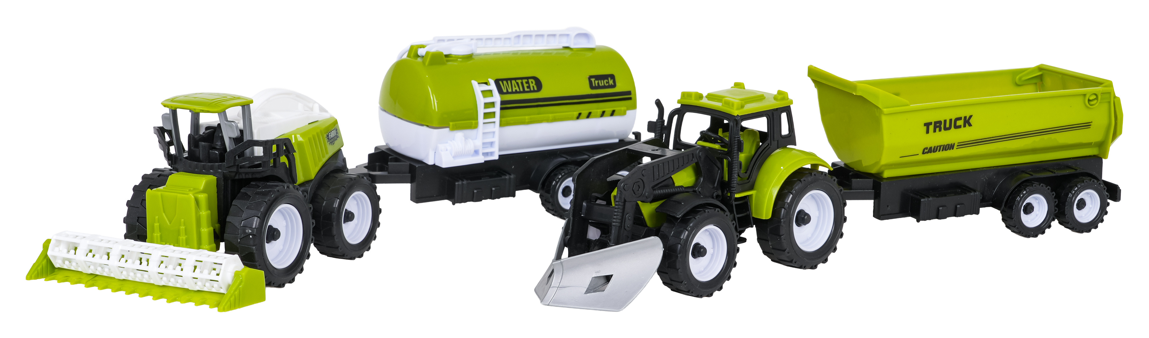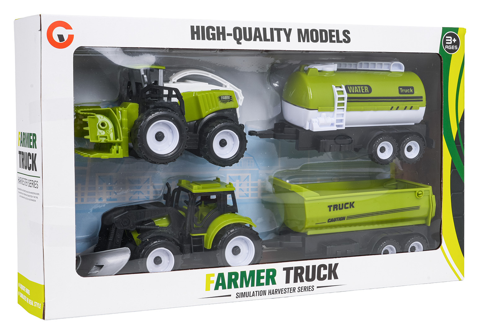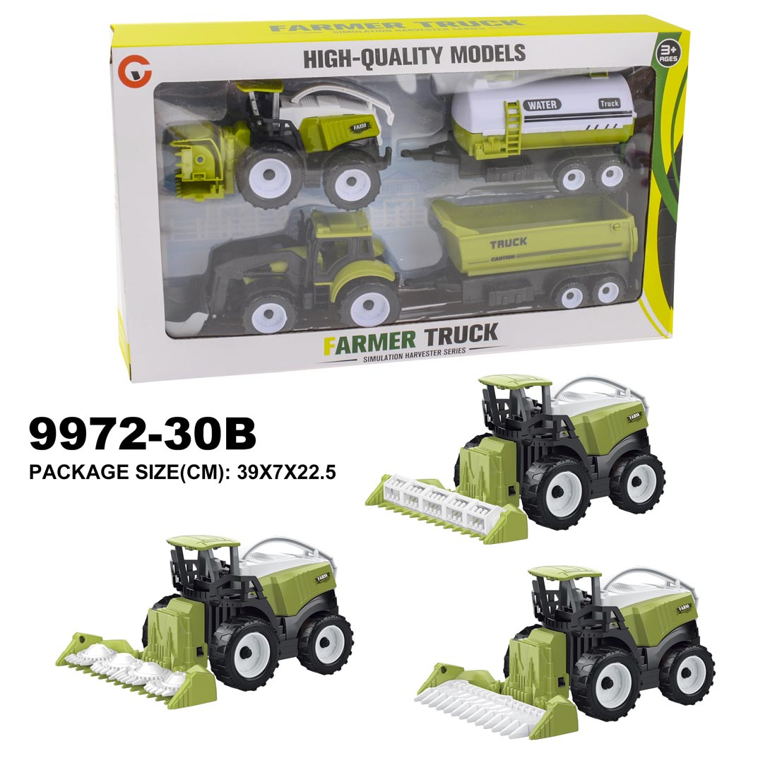 Sada zemědělských vozidel pro děti starší tří let. Sada je vyrobena z nejkvalitnějšího plastu. V sadě můžeme najít kombajn, traktor s pluhem, cisternu a přívěs. Vozidla byla zpracována velmi realisticky s důrazem na detaily a mají mnoho pohyblivých prvků. Přívěs a cisternu můžeme připojit jak k traktoru, tak ke kombajnu.