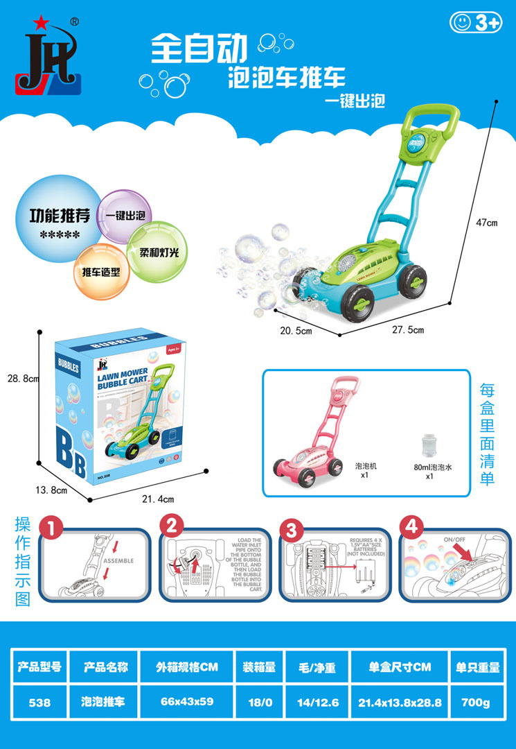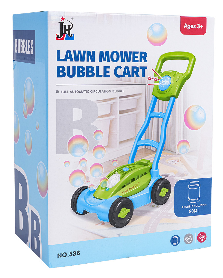 Sekačka s funkcí vypouštění bublin a osvětlením je určena pro děti od tří let. Hračka má pohodlnou, stabilní rukojeť a čtyři pohyblivá kolečka, díky čemuž ji bude pro dítě velmi snadné vést. Největší atrakcí sekačky je vestavěný generátor mýdlových bublin. Stačí zapojit lahvičku s tekutinou (v sadě) do spodní části sekačky, abyste si mohli užívat krásné barevné bubliny. Osvětlení spodní části generátoru bublin způsobuje, že bubliny se třpytí barvami. Hračka je napájena bateriemi typu 4 x AA 1,5V (baterie nejsou součástí balení). Na rukojeti sekačky se nachází také píšťalka.