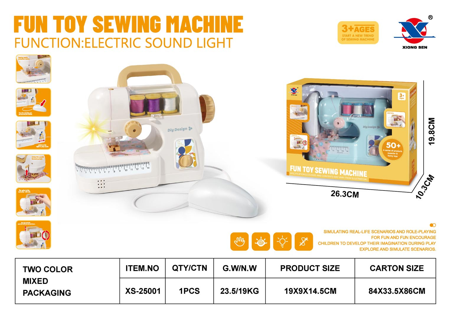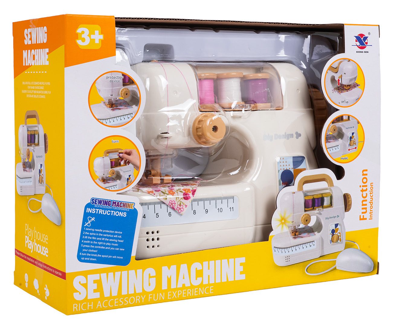 Interaktivní šicí stroj se zvukovými a světelnými efekty pro děti od tří let. Hračka vyrobená z pevných materiálů a bezpečná pro dítě. Stroj má jehlu v krytu, který chrání před pořezáním dítěte. Hračka je vybavena praktickou myší, která spouští stroj, kolečkem pro zvedání jehly a zvedákem patky. Během práce stroje svítí světélko a je slyšet zvuky šití. V sadě s strojem můžeme také najít 3 cívky nití a kousek látky. Hra s tímto strojem podporuje rozvoj zrakově-motorické koordinace a kreativity. Stroj je napájen bateriemi typu 4 x 1,5V AA (nejsou součástí balení).