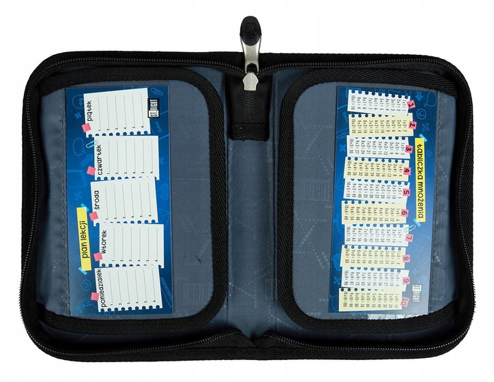 Na vnitřních chlopních jsou průhledné fólie pro rozvrh hodin, malou násobilku atd.