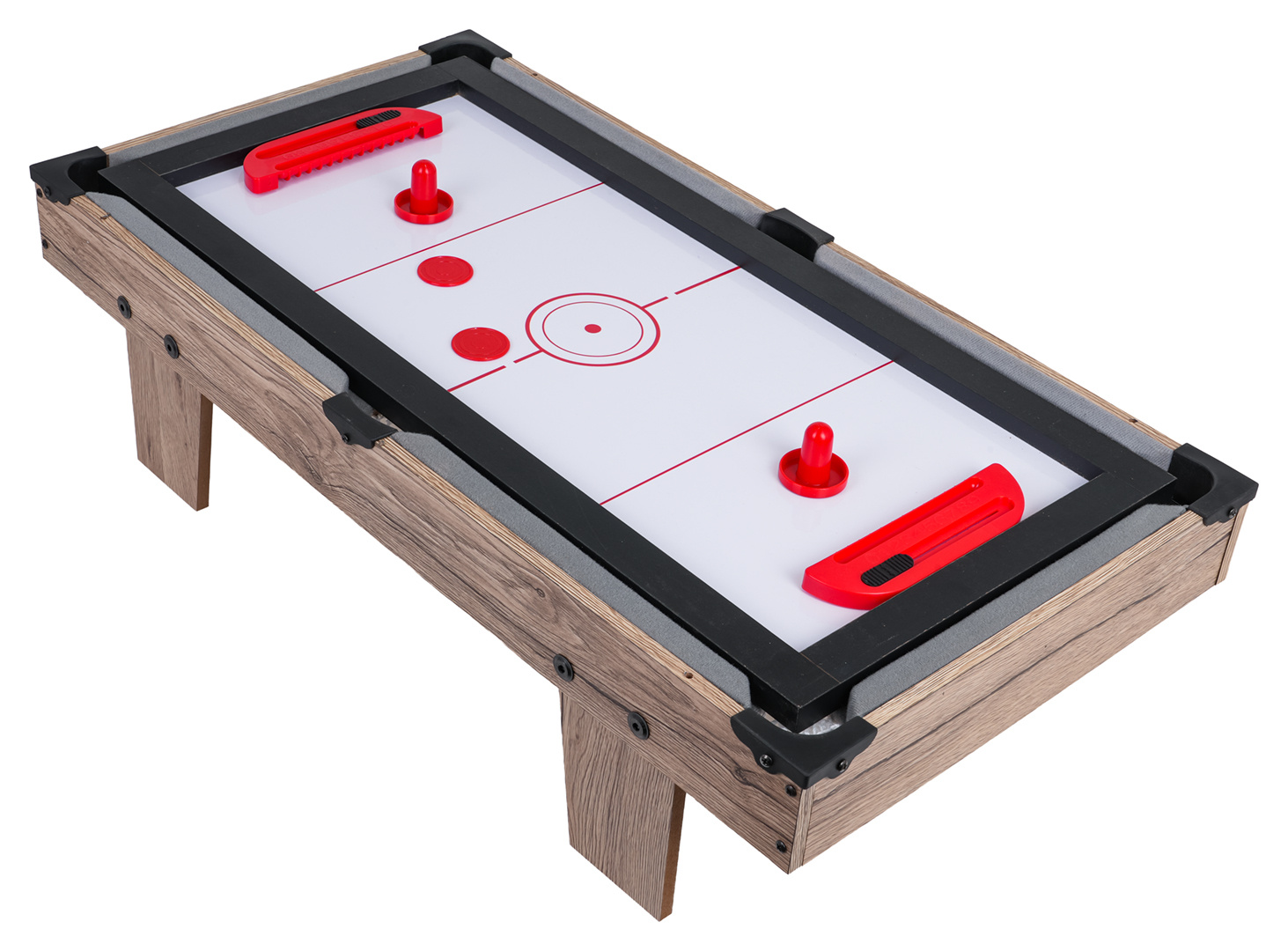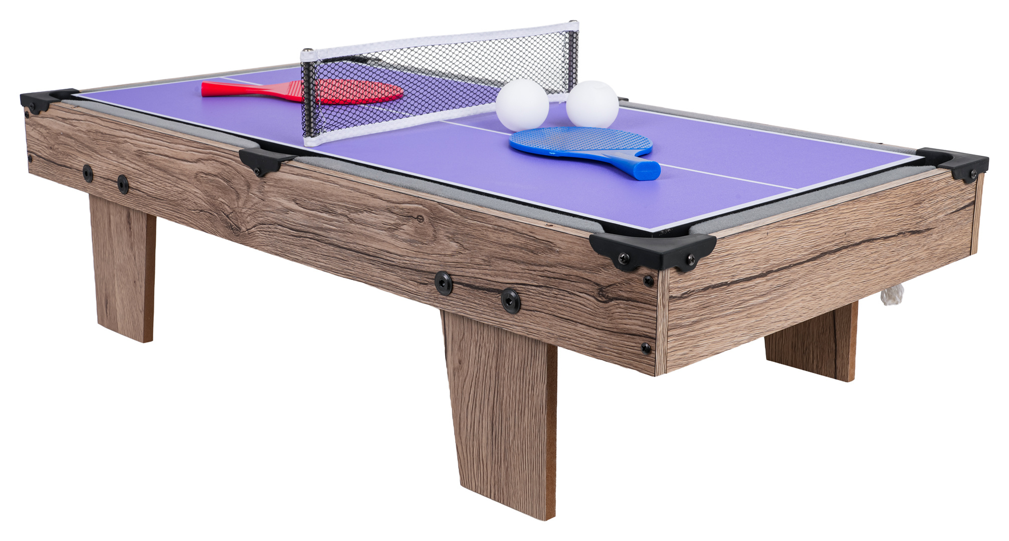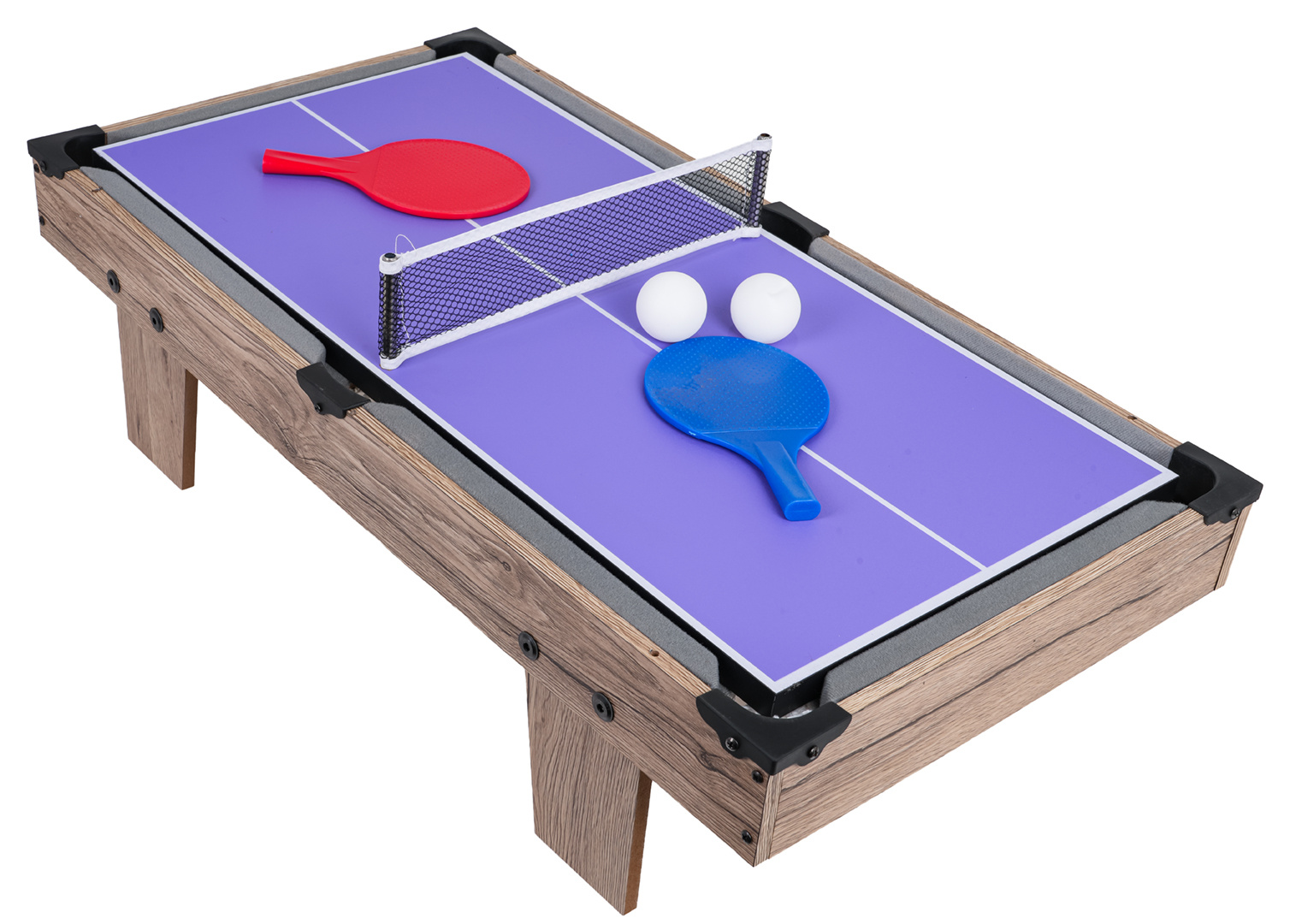 Stůl s populárními hrami: kulečník, air hockey, tenis a stolní fotbal pro děti od tří let. Sestava byla vyrobena z dřevotřísky, HDF desky a kovu, což zaručuje stabilní konstrukci, odolnost a spolehlivost. Dokončen s precizností a přesností, má propracované detaily. Stolní verze a demontovatelné vyměnitelné desky šetří místo v pokoji a zpestří čas. Ideální sada bude pro aktivní trávení společného času během vzájemné soutěže a zábavy. Ideální dárková sada a ozdoba každého pokoje fanouška sportovních her.