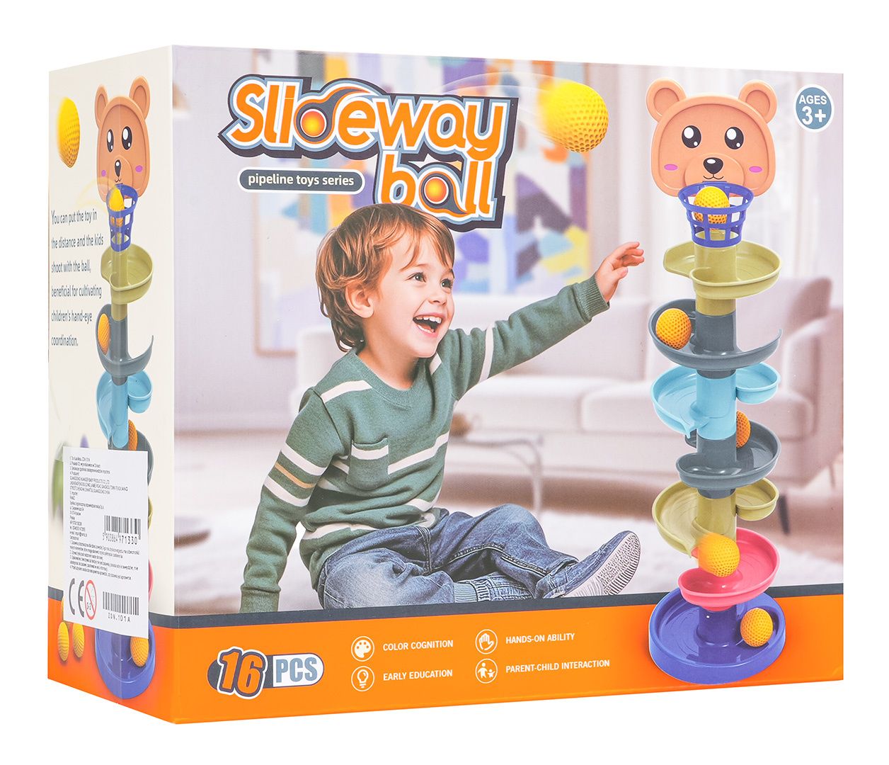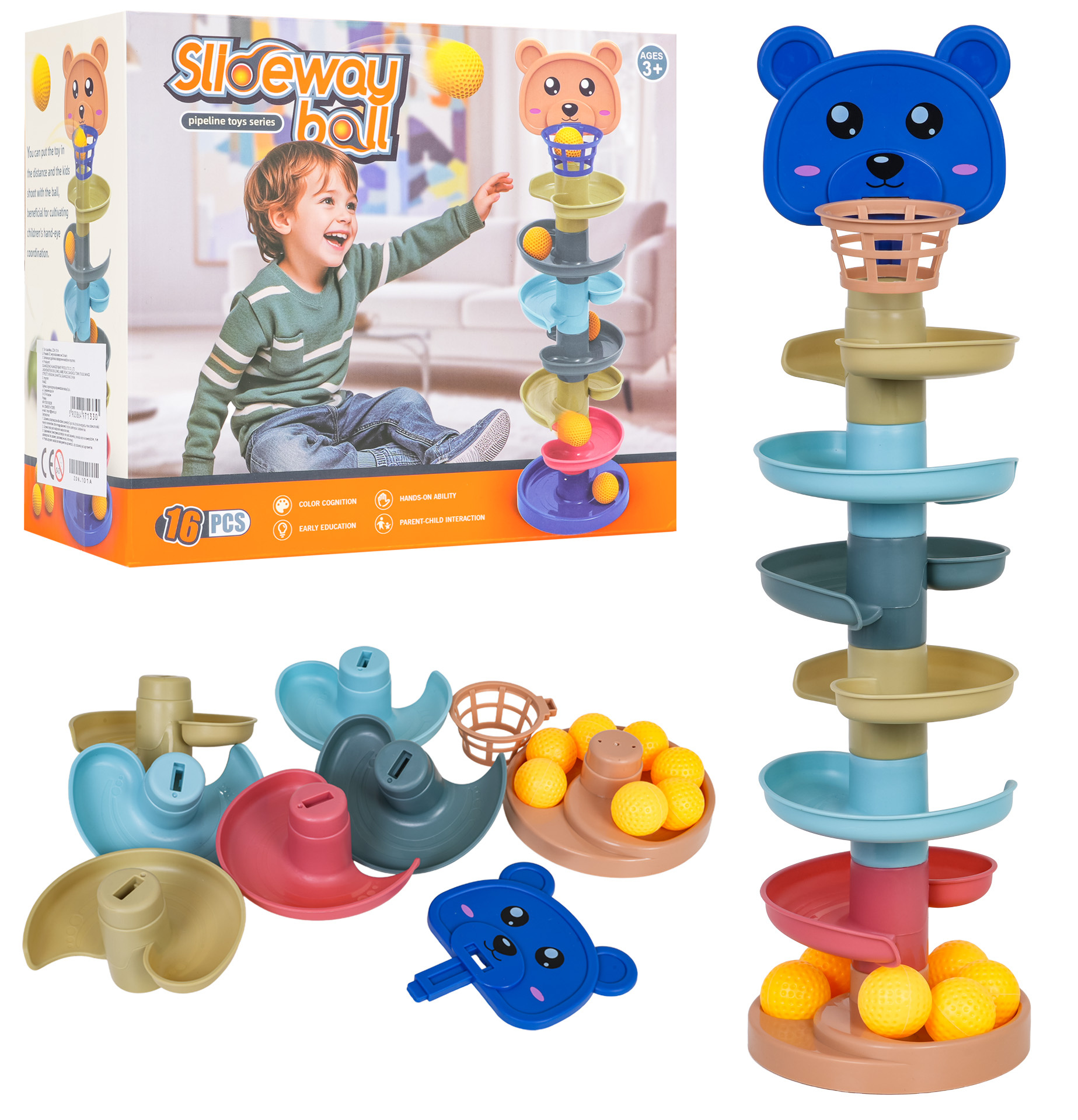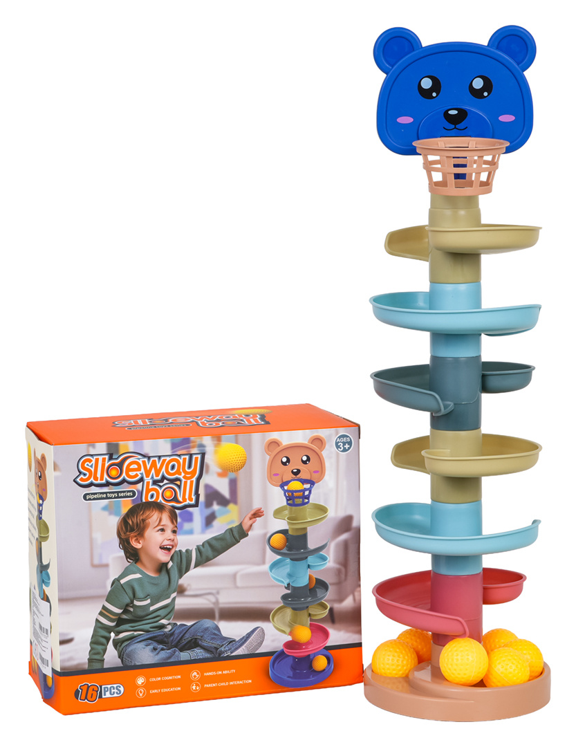 Vícebarevná dráha s medvídkem a míčky pro děti od tří let. Hračka se skládá ze základny, 6 pater a hlavy medvídka s košem. Lze ji libovolně upravovat přidáváním a odebíráním dalších pater. Čím vyšší věž, tím těžší je trefit se do koše. V sadě se nachází 7 míčků.