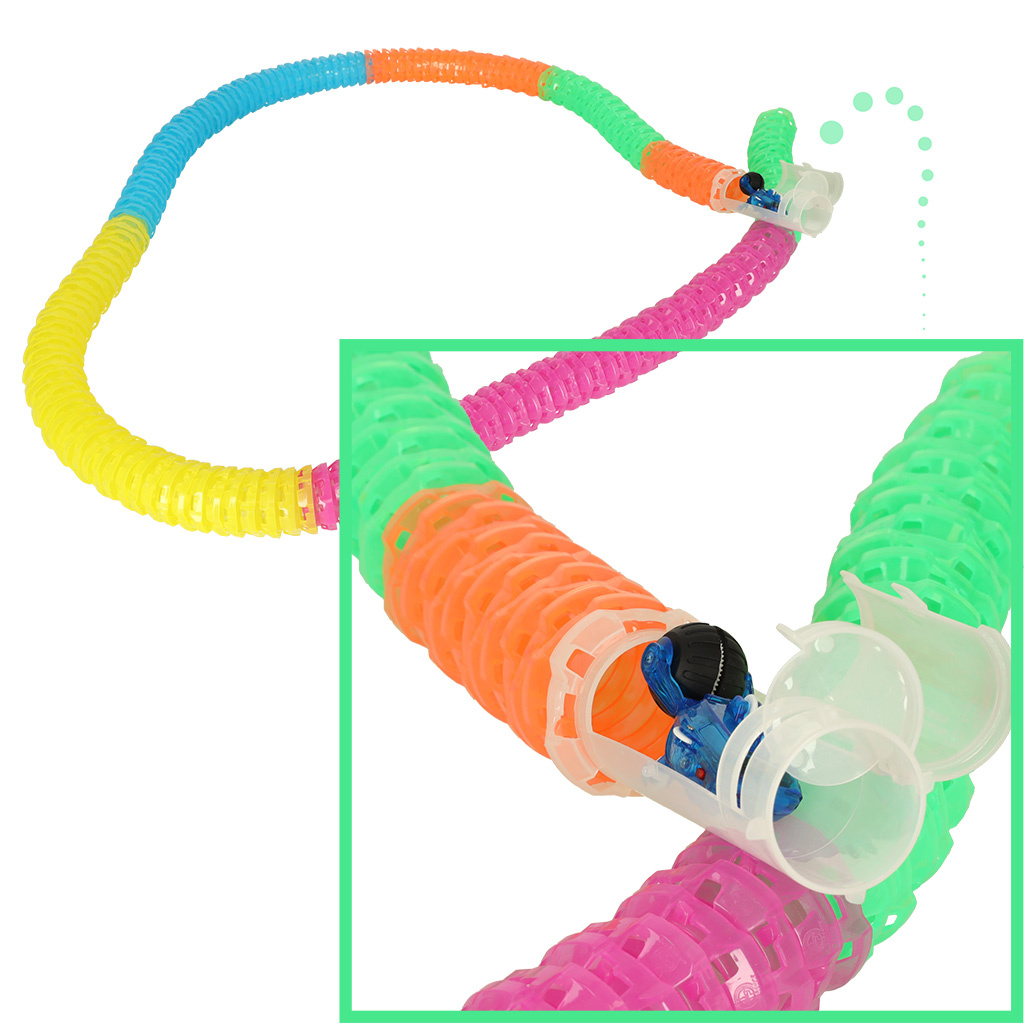 Dvě stě deset kusů tvoří neobvyklou trubkovou dráhu, po které se autíčko pohybuje závratnou rychlostí!