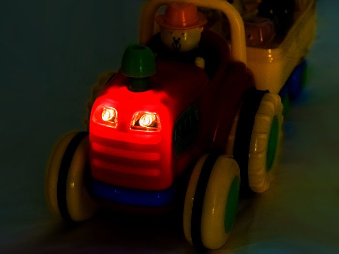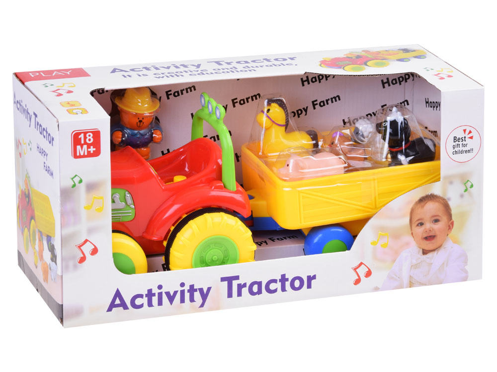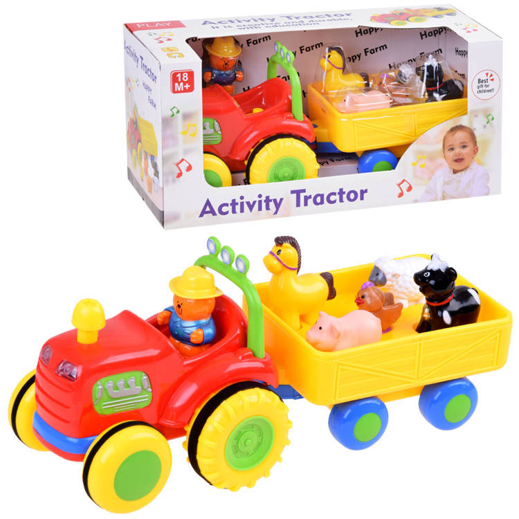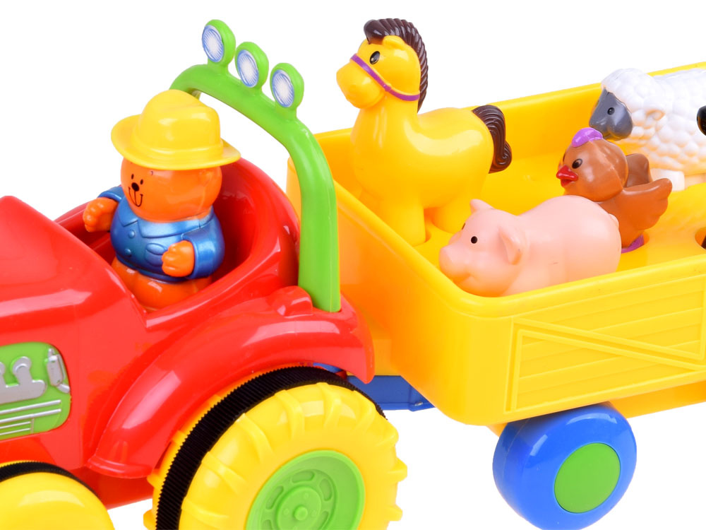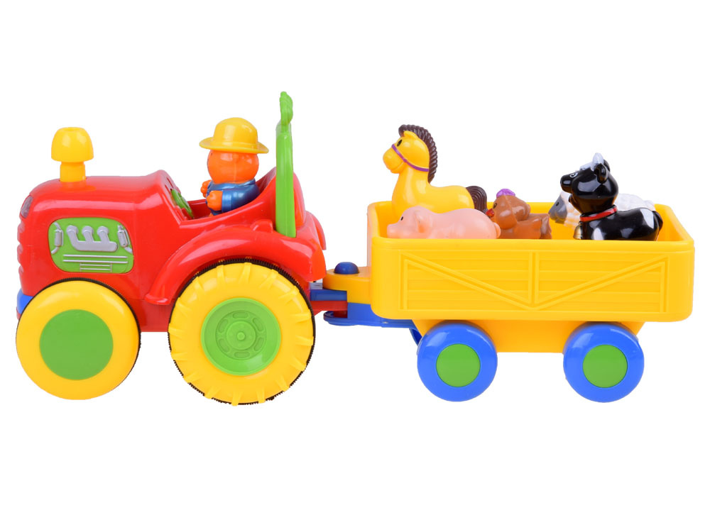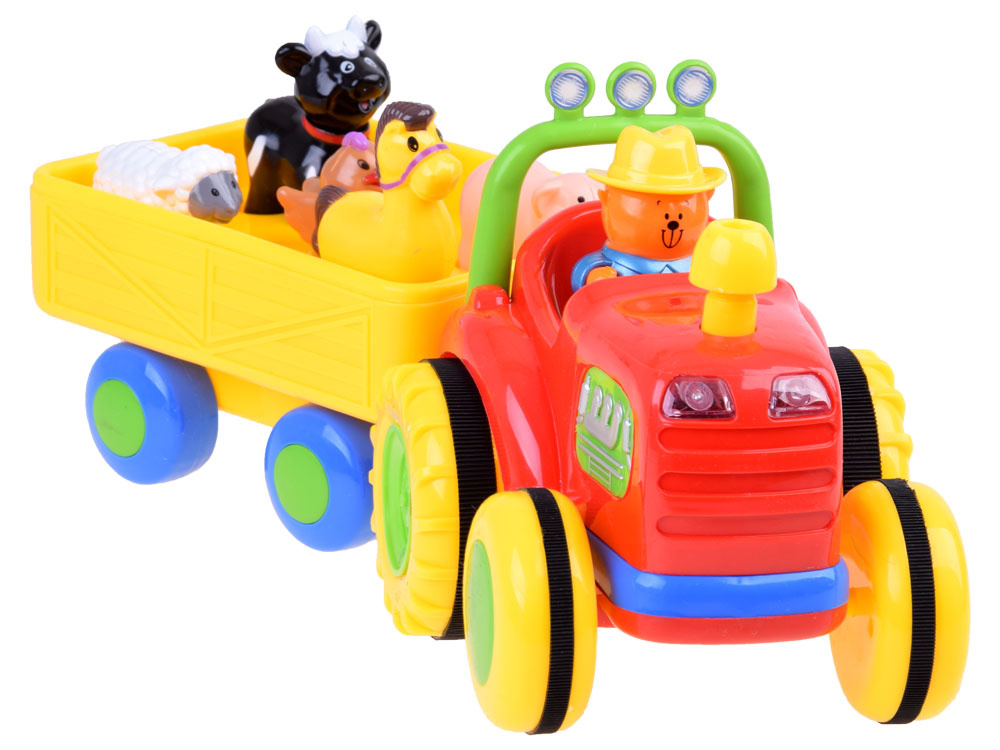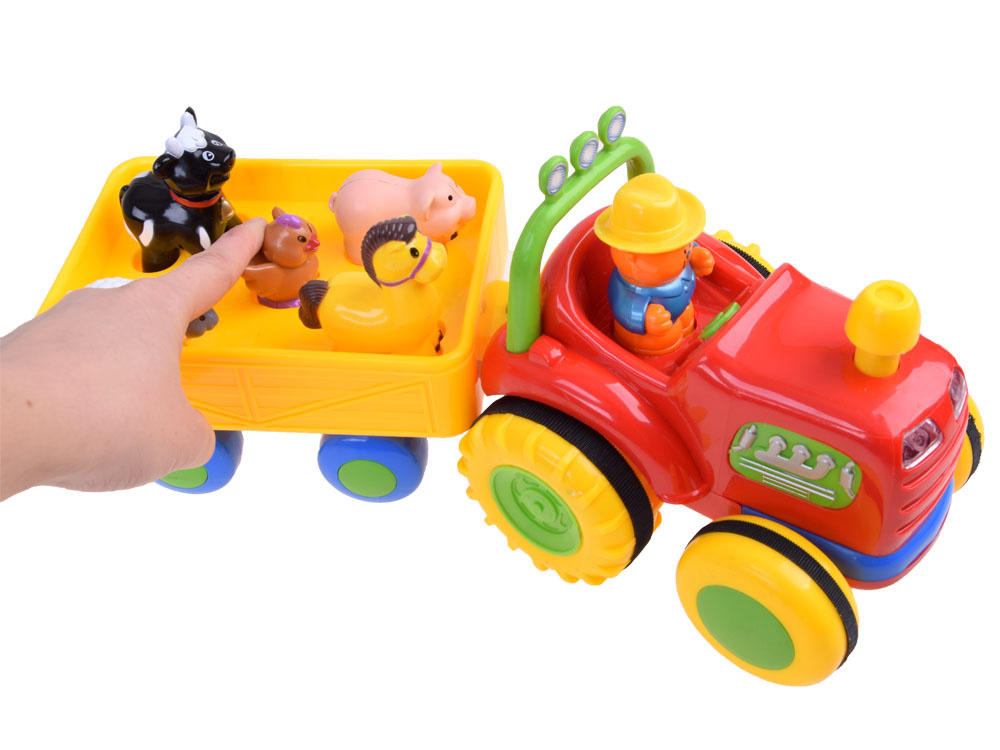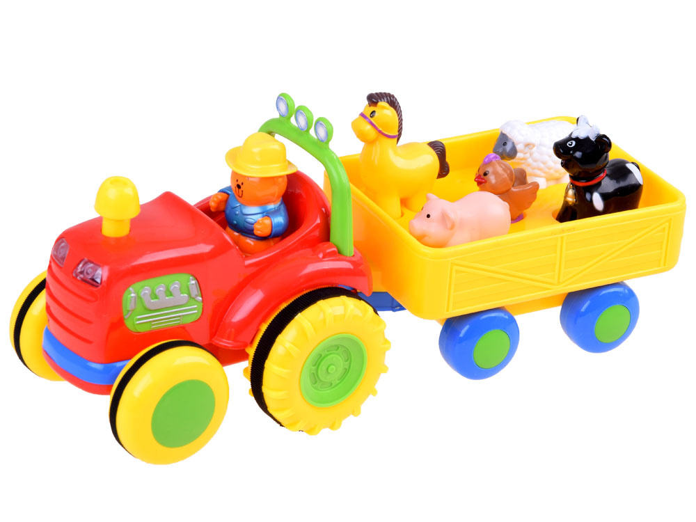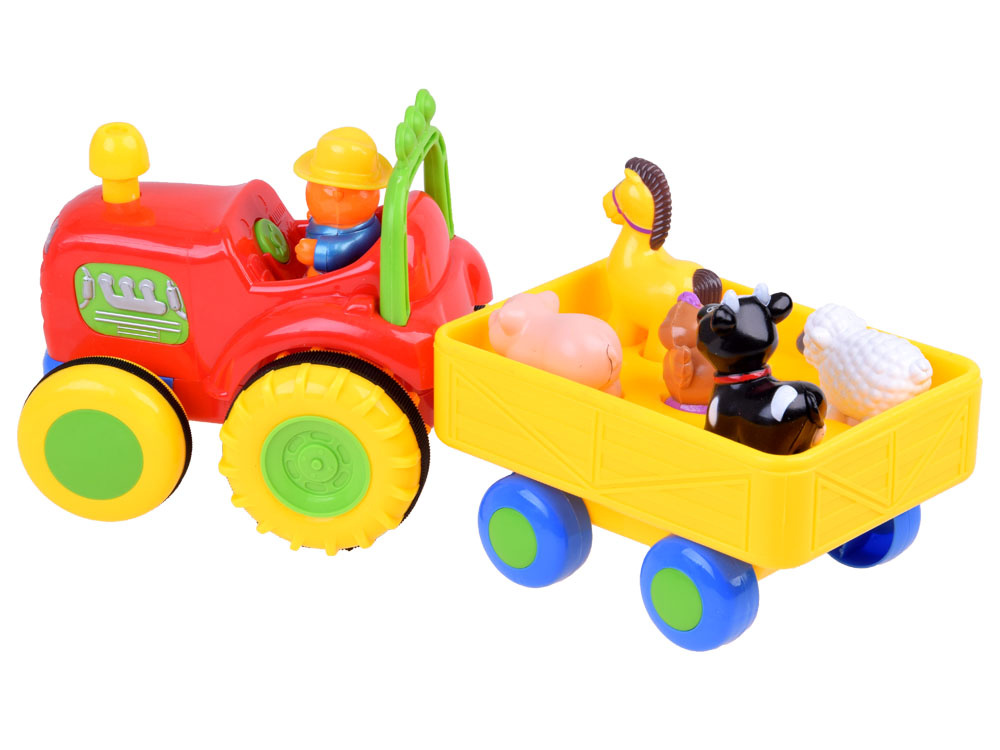 Fantastický interaktivní traktor pro každého malého farmáře. Představený tahač s přívěsem je jedním z nejlepších vozidel ve své třídě. Traktor s přívěsem volně jezdí díky pohonu a zvuk a blikající světla na přední straně umocňují efekt. Po stisknutí komínu traktor nastartuje motor, rozsvítí světla a pokračuje v cestě. Opětovným stisknutím komínu se vozidlo zastaví. Zvířátka přepravovaná v přívěsu vydávají po stisknutí zvuk a hrají veselou písničku. Také traktorista dává hlasitým klaksonem najevo, že odjíždí, a hraje farmářskou melodii.