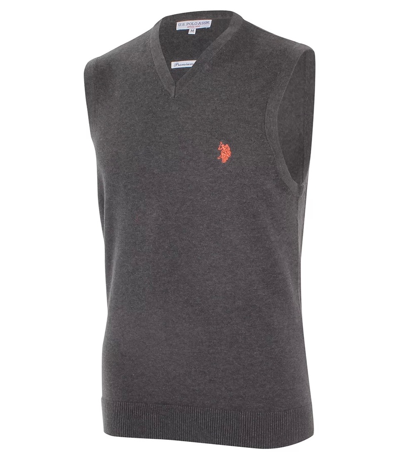 Pánská značková vesta od firmy U.S. Polo Assn. vyrobený ze 100% bavlny s V výstřihem kolem krku, pružnými manžetami, žebrováním na rukávech a vyšívaným logem na levé straně hrudi.