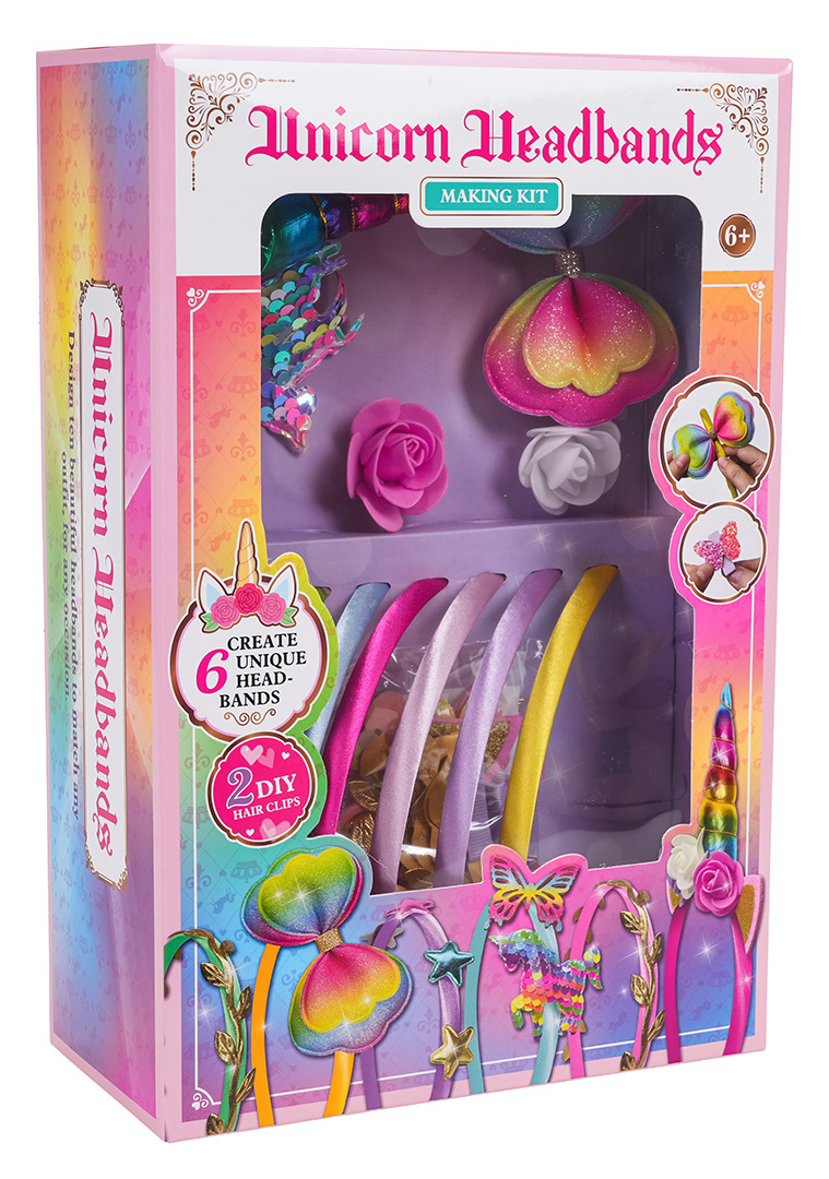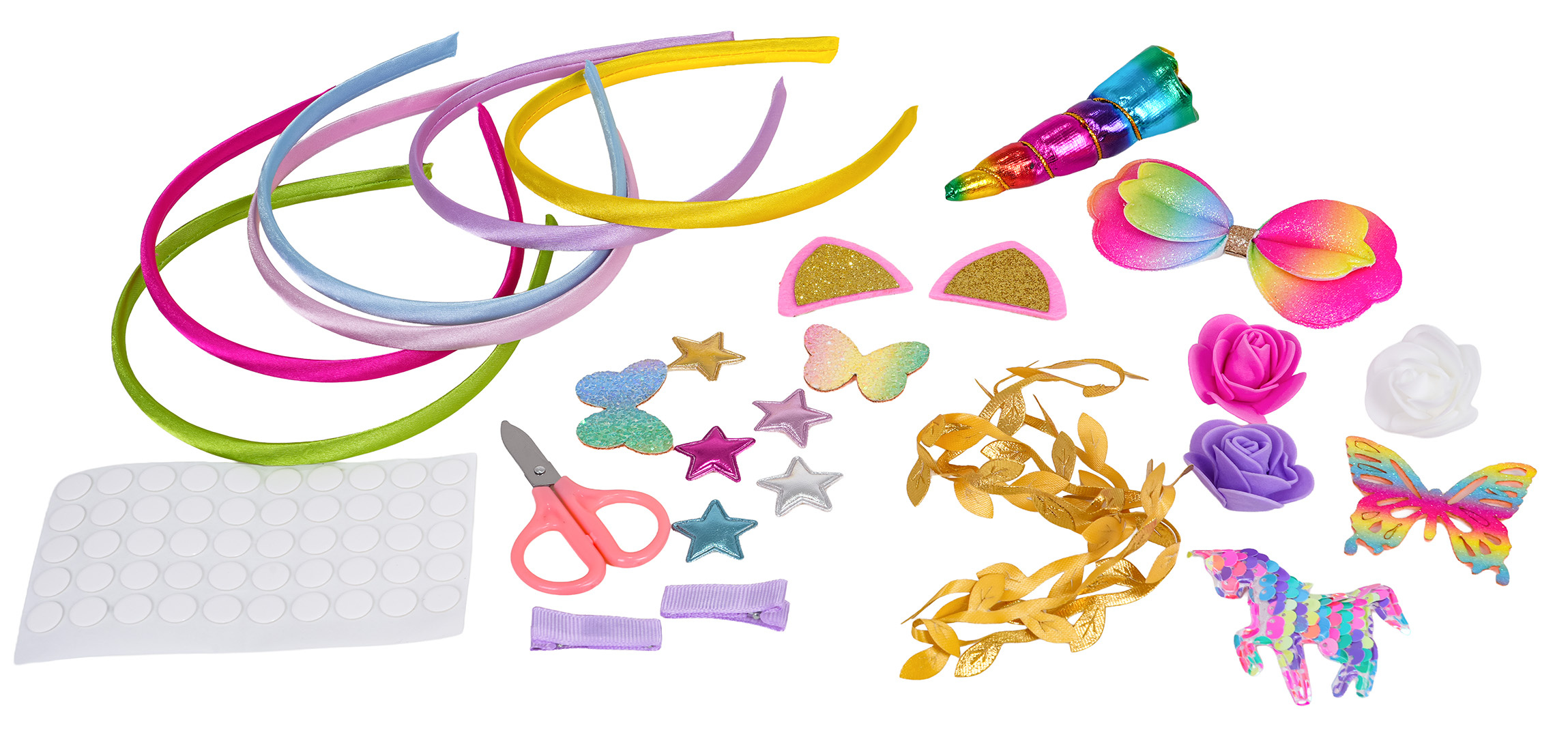 Kreativní sada na výrobu čelenek do vlasů pro děti od šesti let. Sada se skládá z 6 čelenek do vlasů a spousty doplňků k jejich ozdobení: motýlek, květiny, hvězdičky a další, a také archu samolepicích teček. Sada rozvíjí manuální dovednosti a kreativní myšlení. Připravené čelenky budou ideální pro různé příležitosti a budou výjimečné, protože je bude mít jen vaše dítě. Vytvoření pásky nevyžaduje šití ani stříhání, stačí použít samolepicí tečky.
